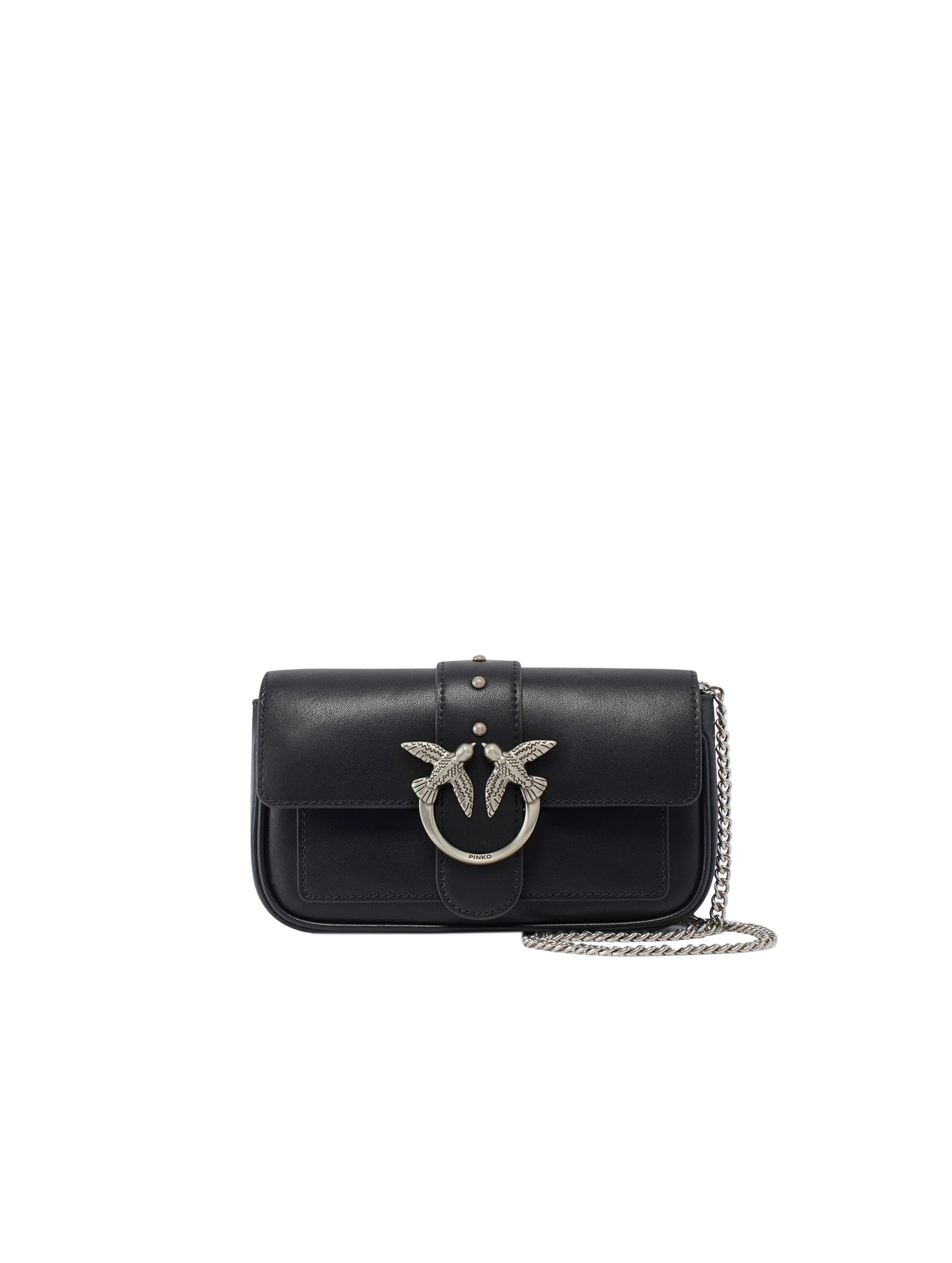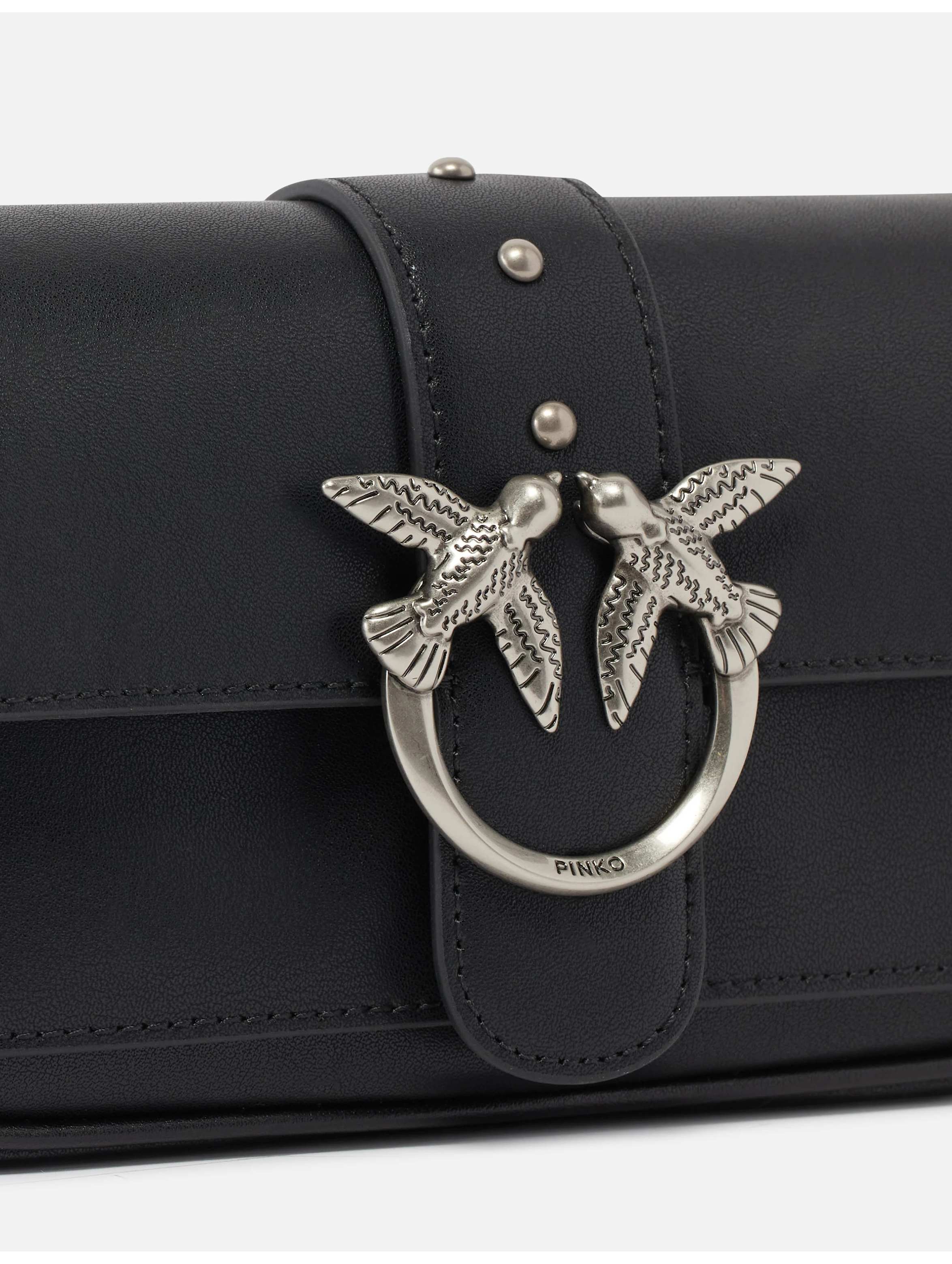 Borsa a tracolla piccola, realizzata in morbida pelle mano seta, con interno foderato, tasca interna con zip e spazi per carte di credito, tracolla removibile in catena sottile e completata da una chiusura con patta impreziosita da piccole borchie e dall'iconica fibbia in metallo Love Birds Diamond Cut. Per look trendy e chic. PINKO