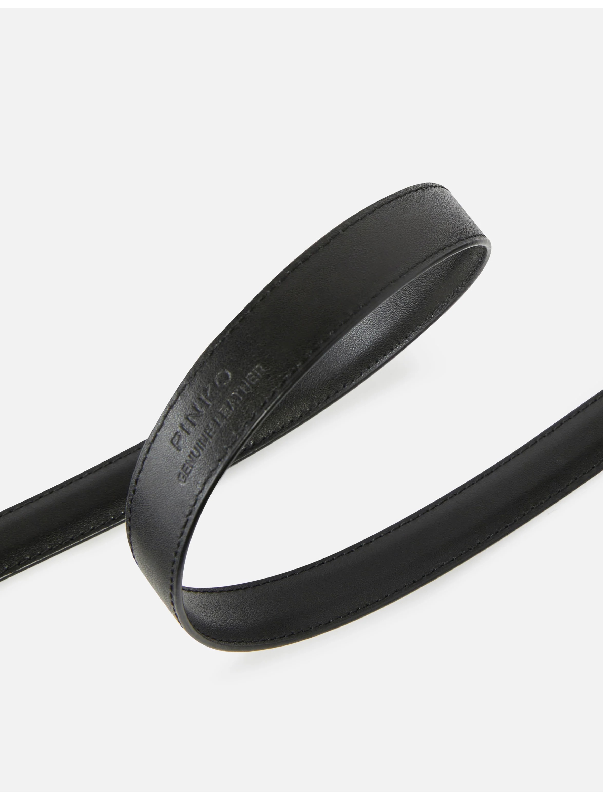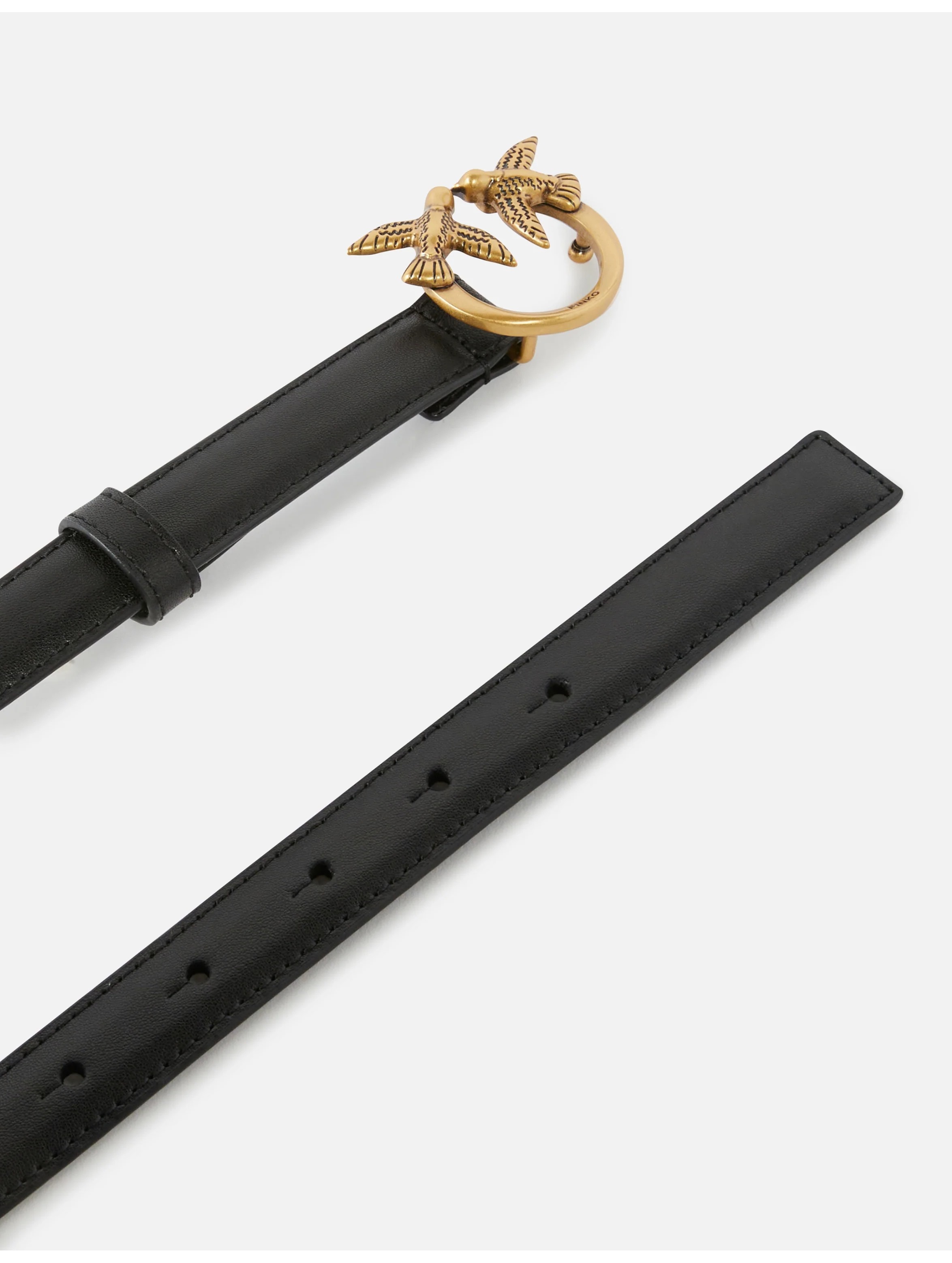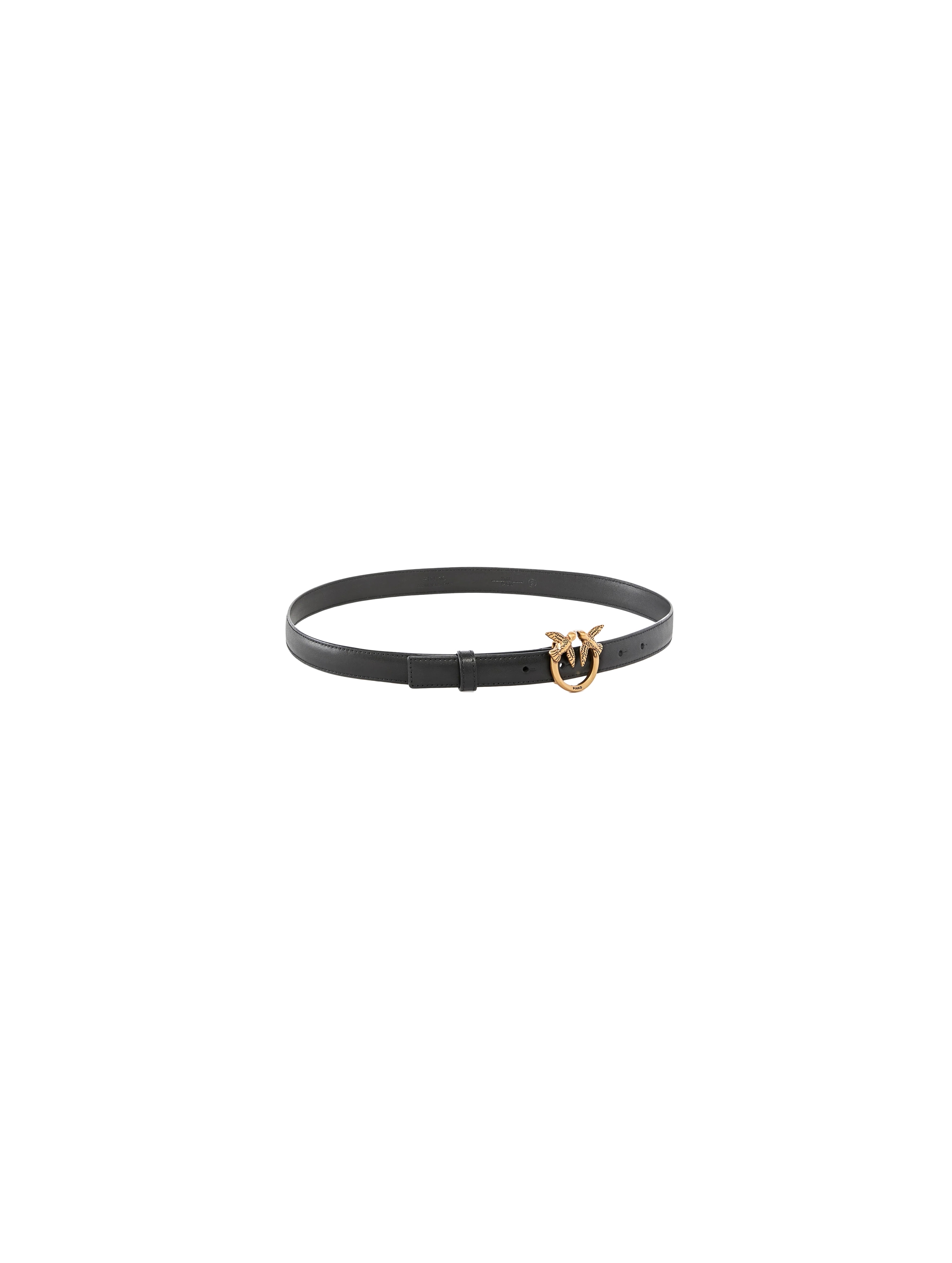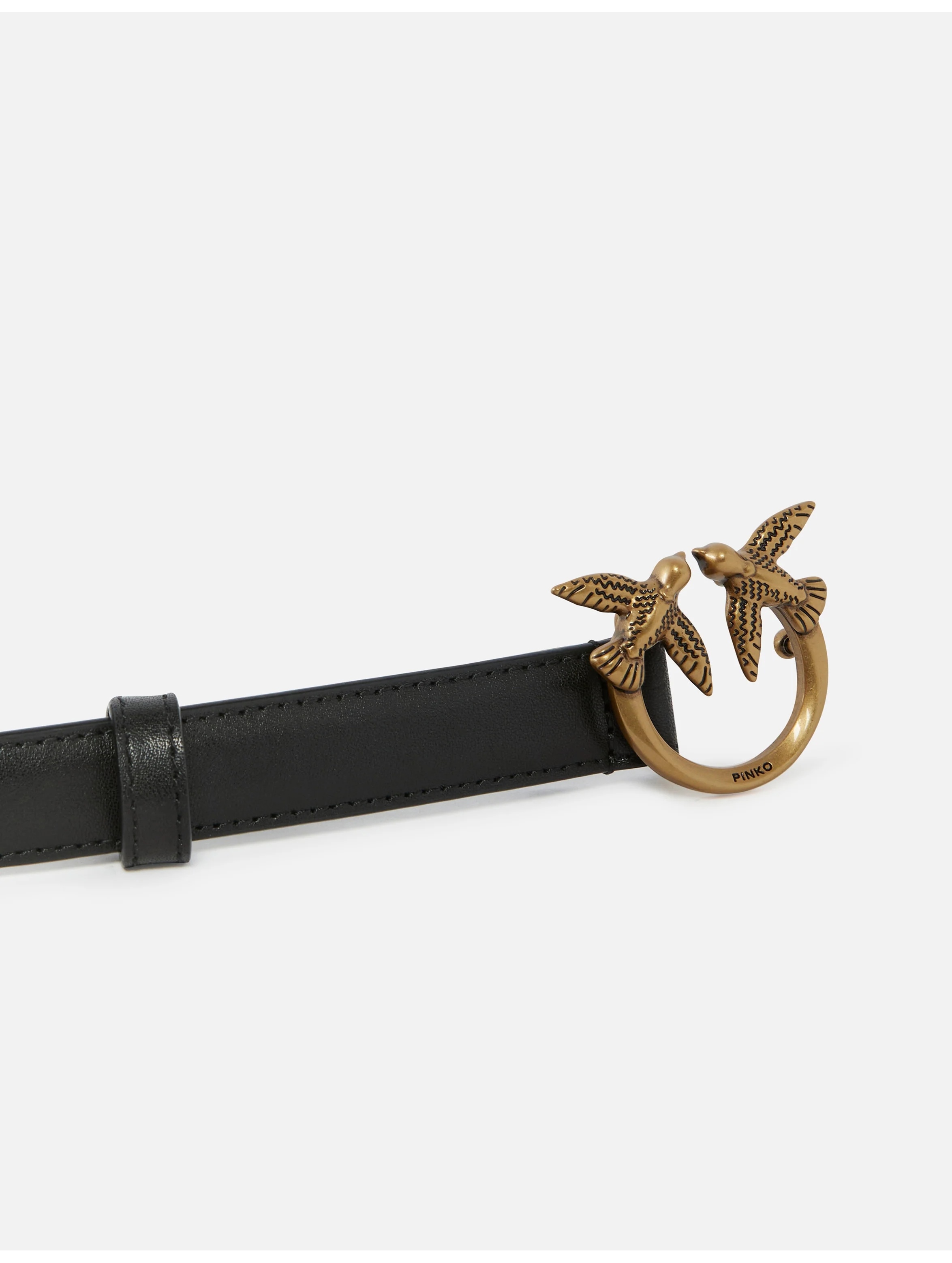 Cintura sottile realizzata in morbida pelle, lavorazione mano seta, con passante e iconica fibbia Love Bird Diamond Cut in metallo. Per look iconici e fashion. PINKO