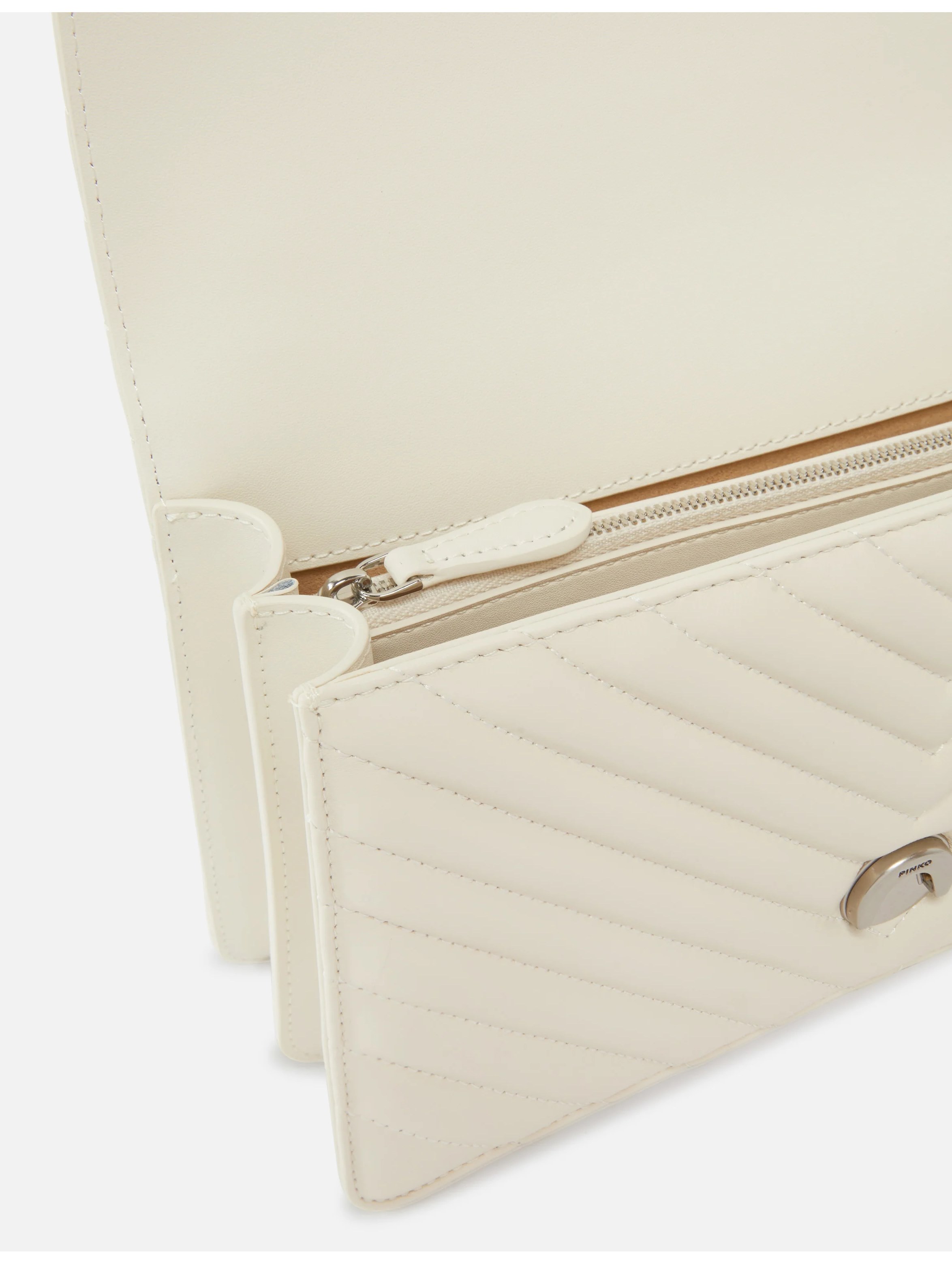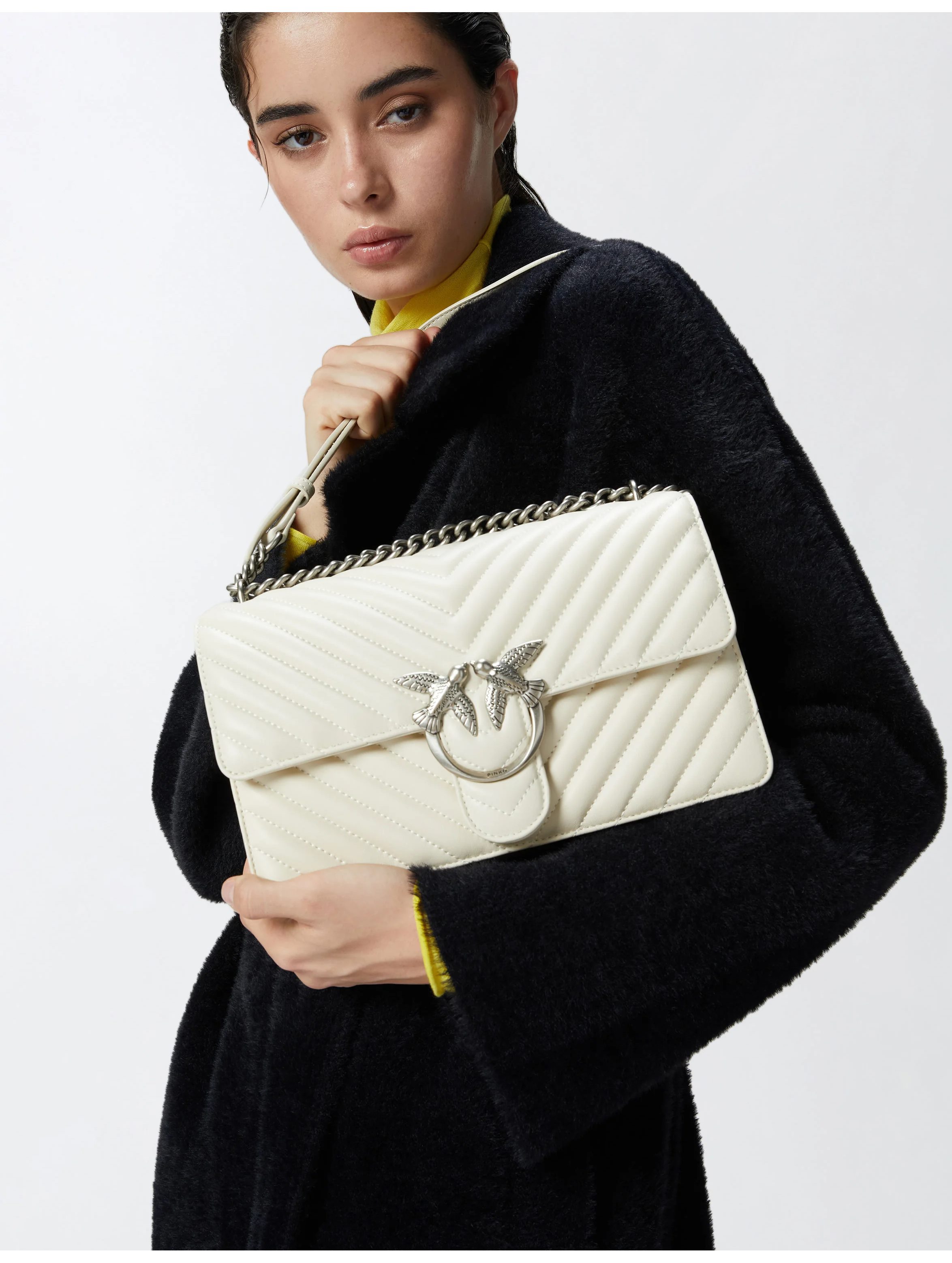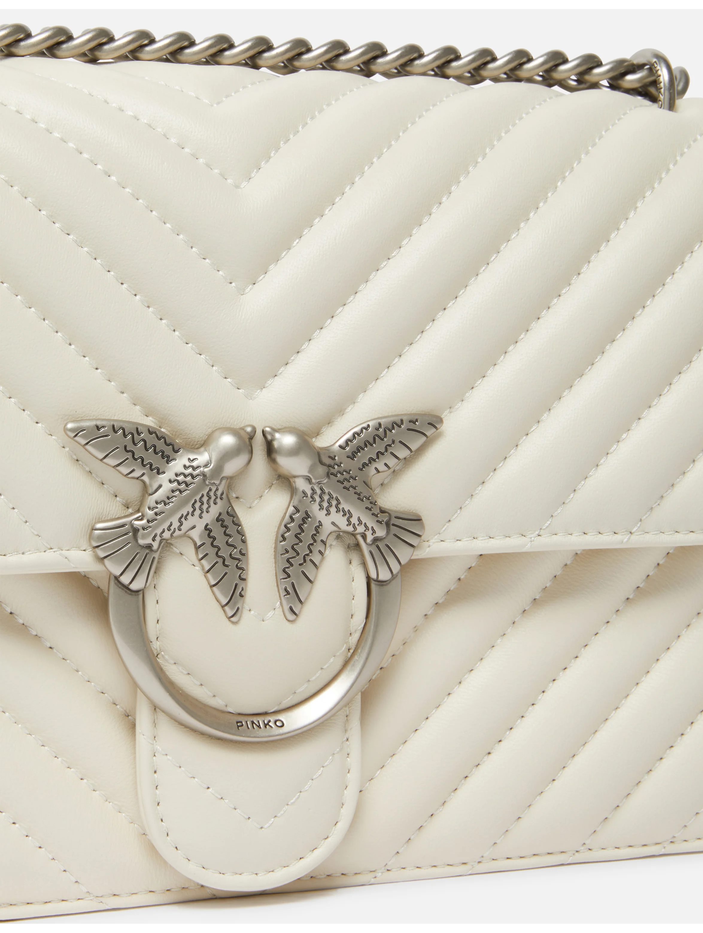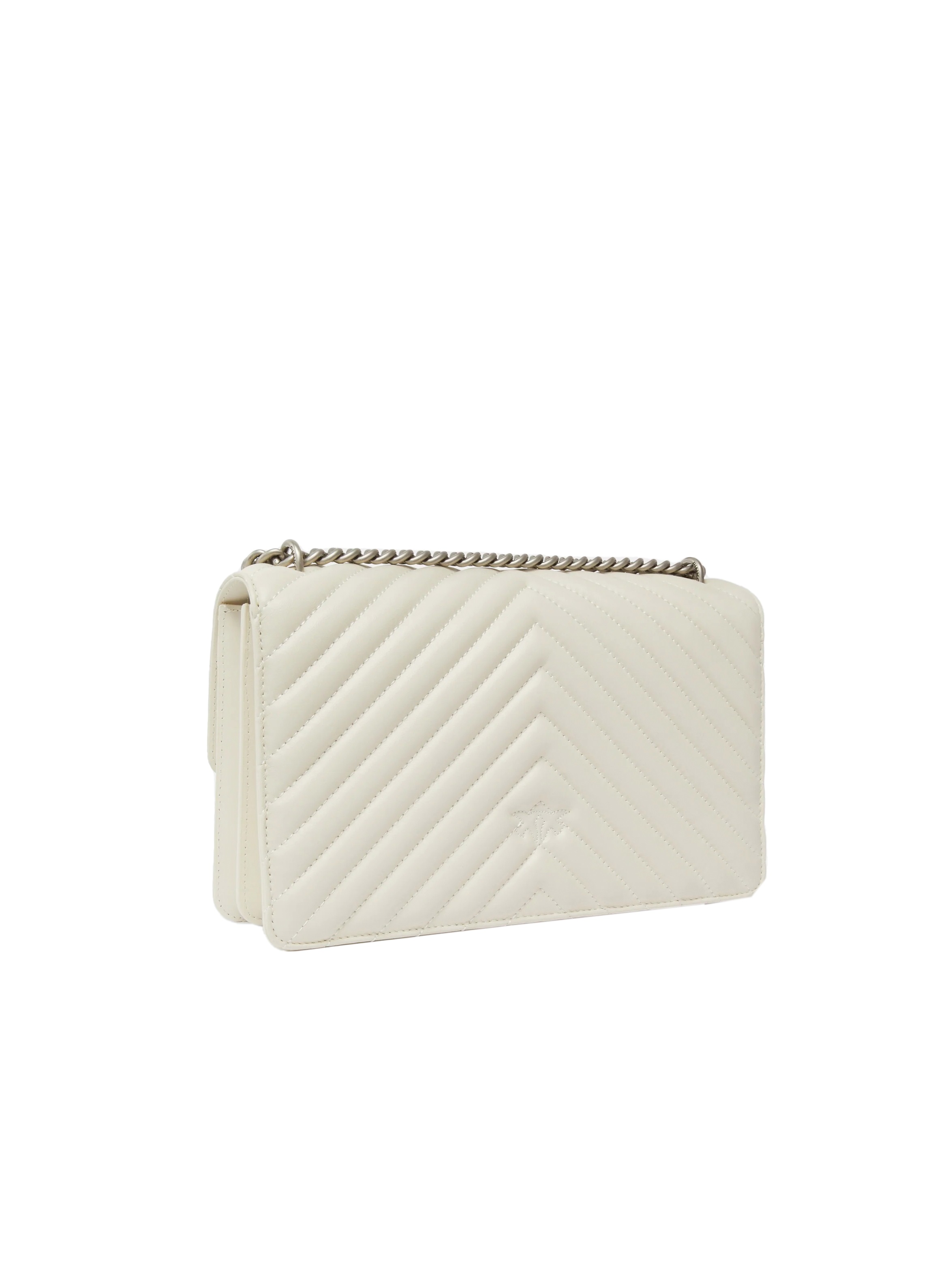 Borsa a tracolla media realizzata in morbida nappa, dal design trapuntato con motivo chevron, con interno foderato, tramezza chiusa con zip e tasca a parete in pelle, con tracolla in catena rotonda con pratico spallaccio in pelle regolabile, chiusura con patta e bottone magnetico completata dall'iconica fibbia Love Birds Diamond Cut in metallo. Per look fashion e chic. PINKO