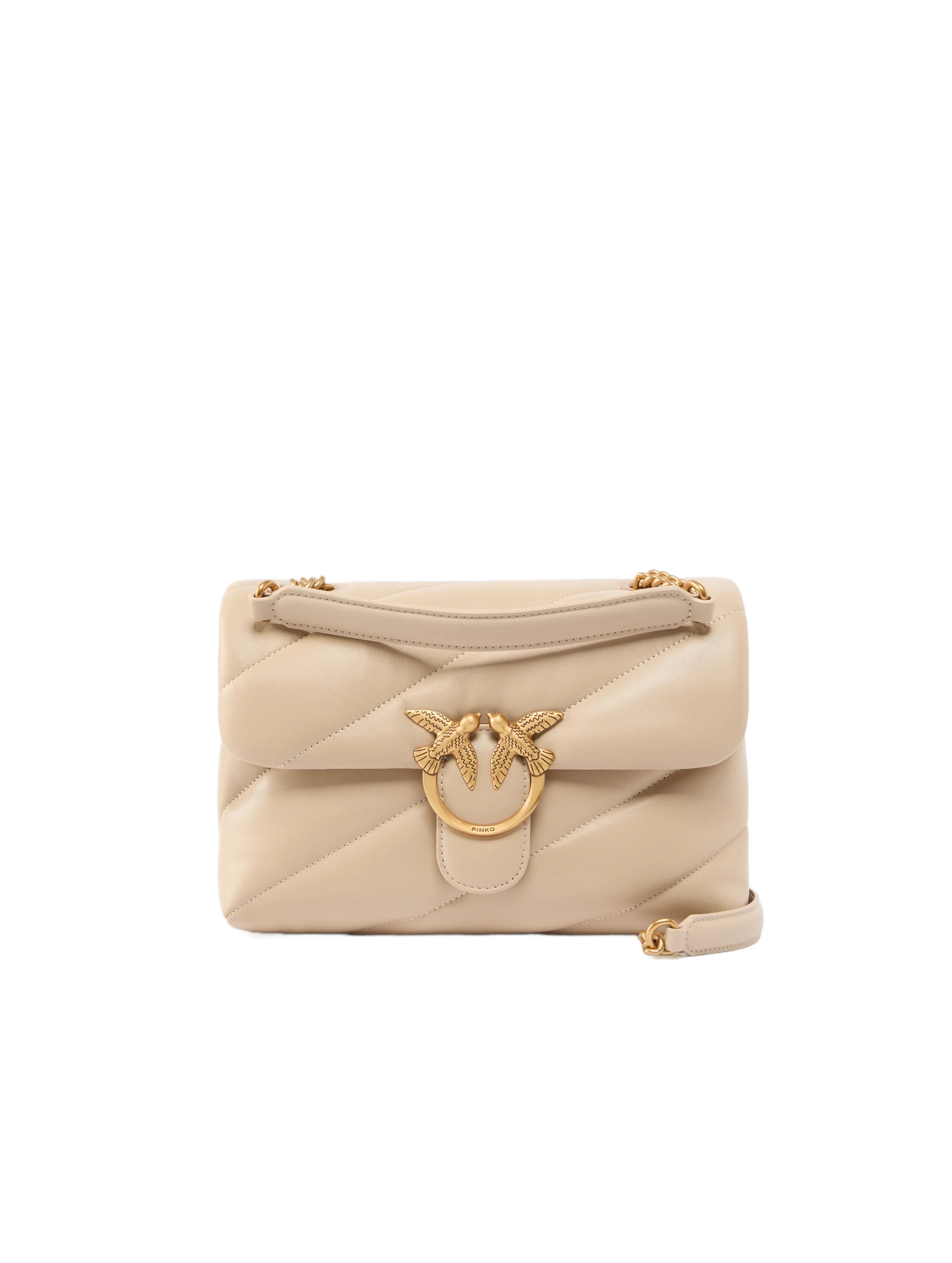 Borsa a tracolla media realizzata in morbida nappa, con maxi trapuntatura obliqua, con interno foderato, tramezza chiusa con zip e tasca a parete, tracolla in catena con pratico spallaccio in nappa e completata da una chiusura con patta impreziosita dall'iconica fibbia in metallo Love Birds Diamond Cut in metallo. Per look fashion e chic. PINKO