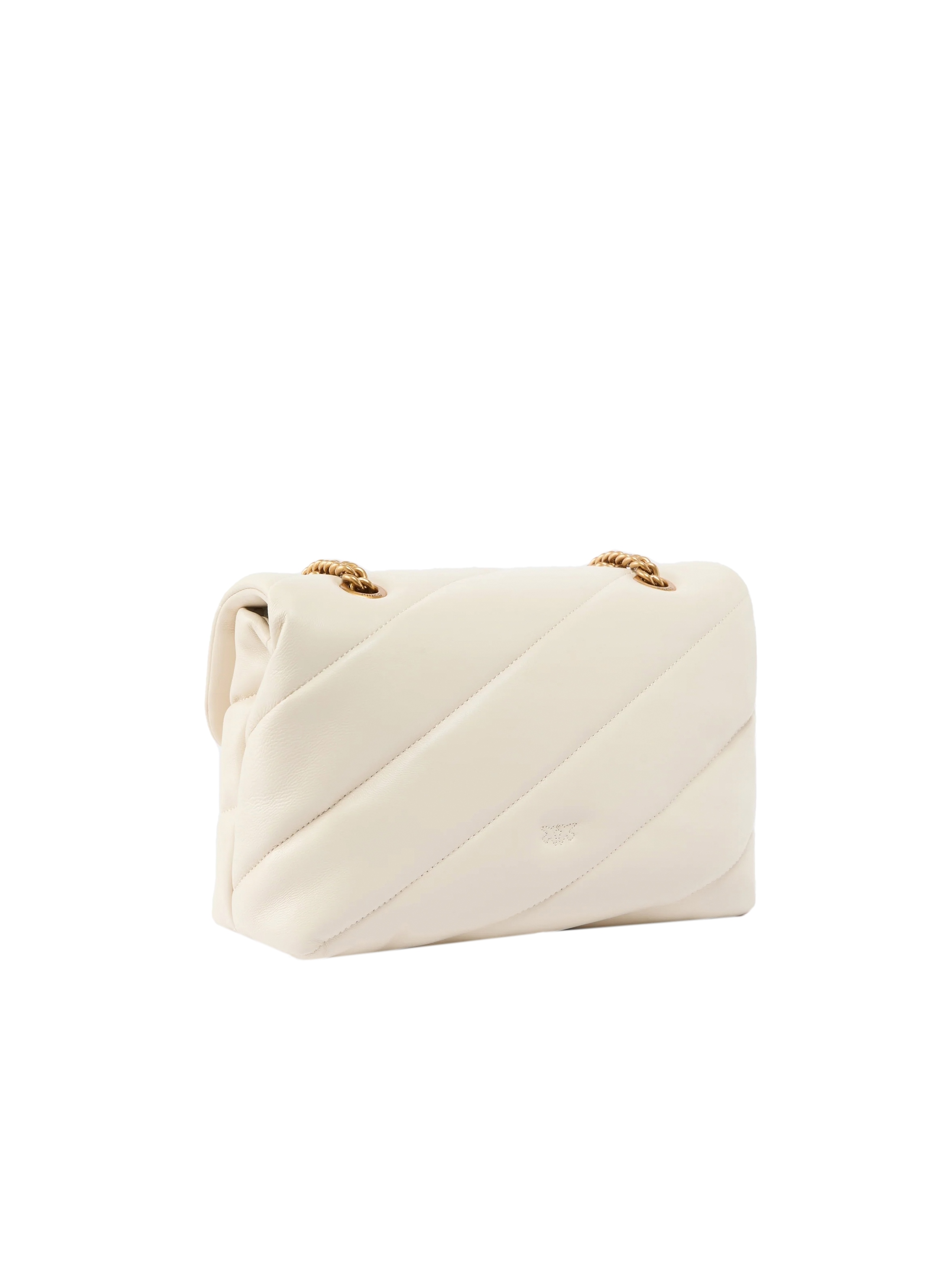 Borsa a tracolla media realizzata in morbida nappa, con maxi trapuntatura obliqua, con interno foderato, tramezza chiusa con zip e tasca a parete, tracolla in catena con pratico spallaccio in nappa e completata da una chiusura con patta impreziosita dall'iconica fibbia in metallo Love Birds Diamond Cut in metallo. Per look fashion e chic. PINKO
