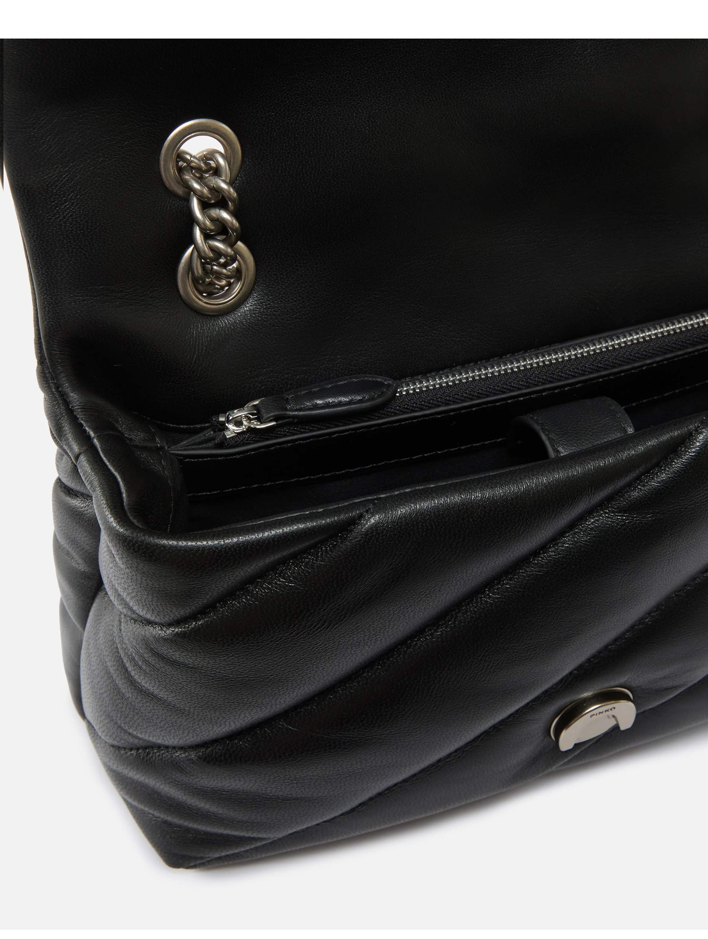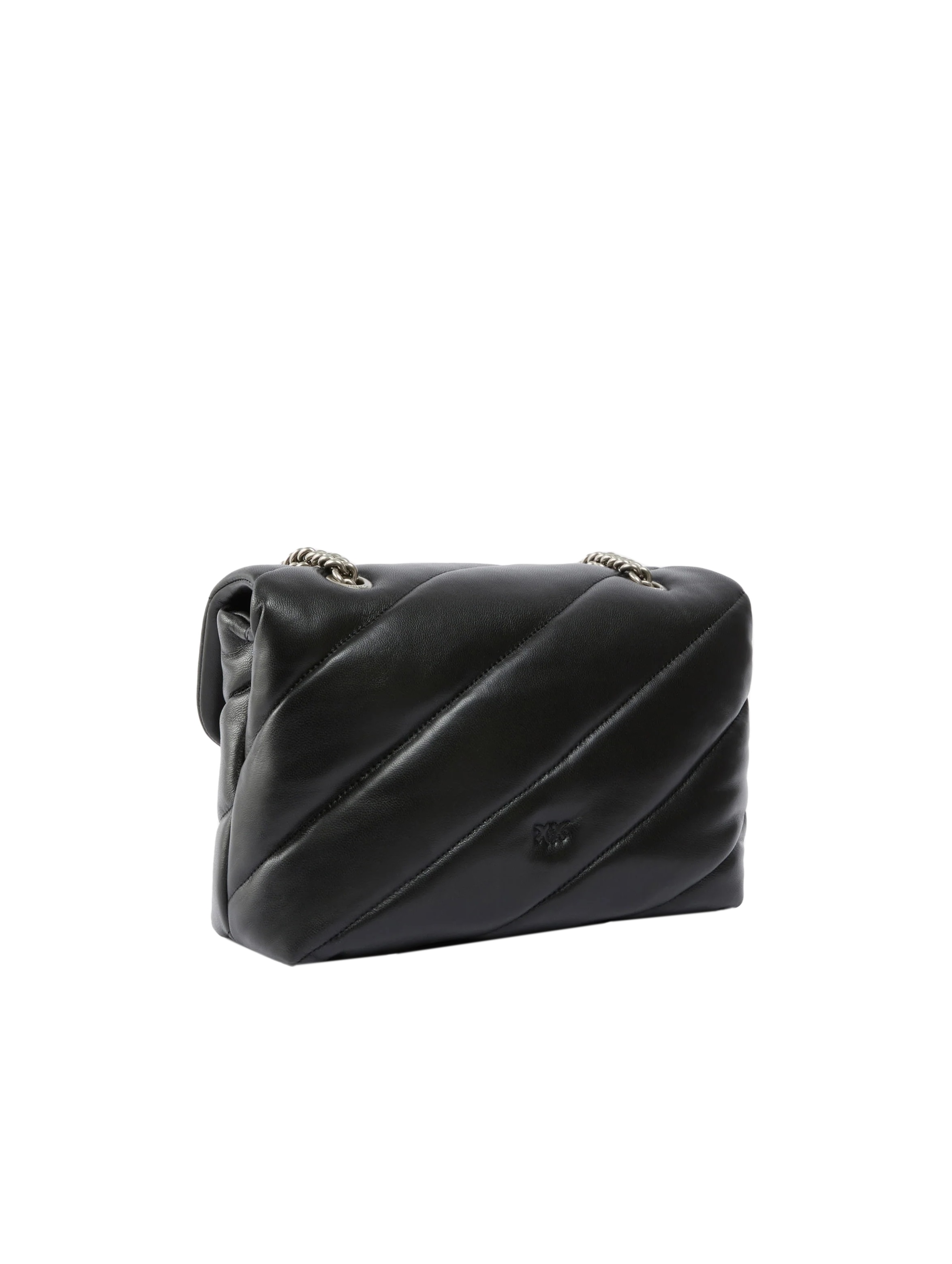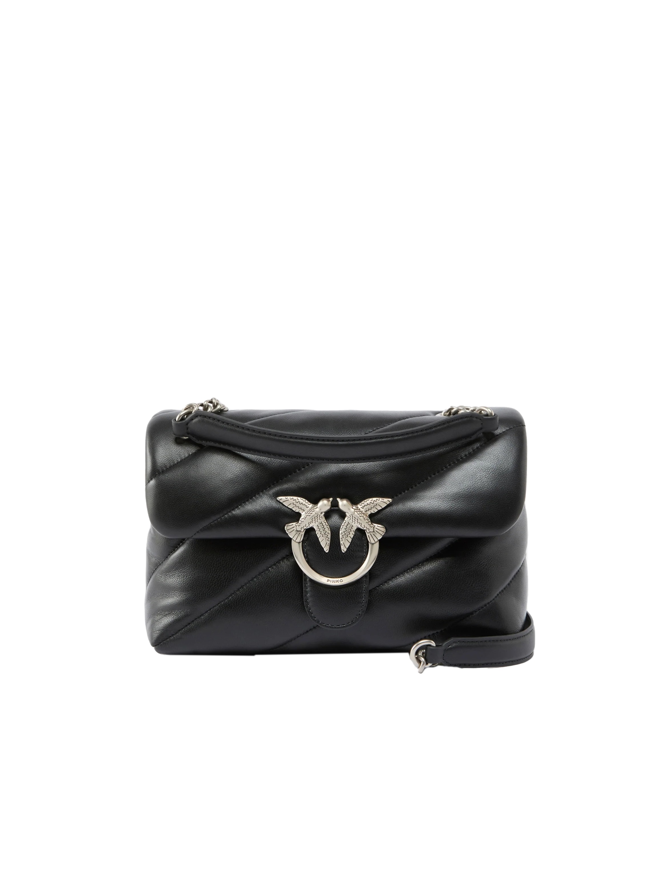Borsa a tracolla media realizzata in morbida nappa, con maxi trapuntatura obliqua, con interno foderato, tramezza chiusa con zip e tasca a parete, tracolla in catena con pratico spallaccio in nappa e completata da una chiusura con patta impreziosita dall'iconica fibbia in metallo Love Birds Diamond Cut in metallo. Per look fashion e chic. PINKO