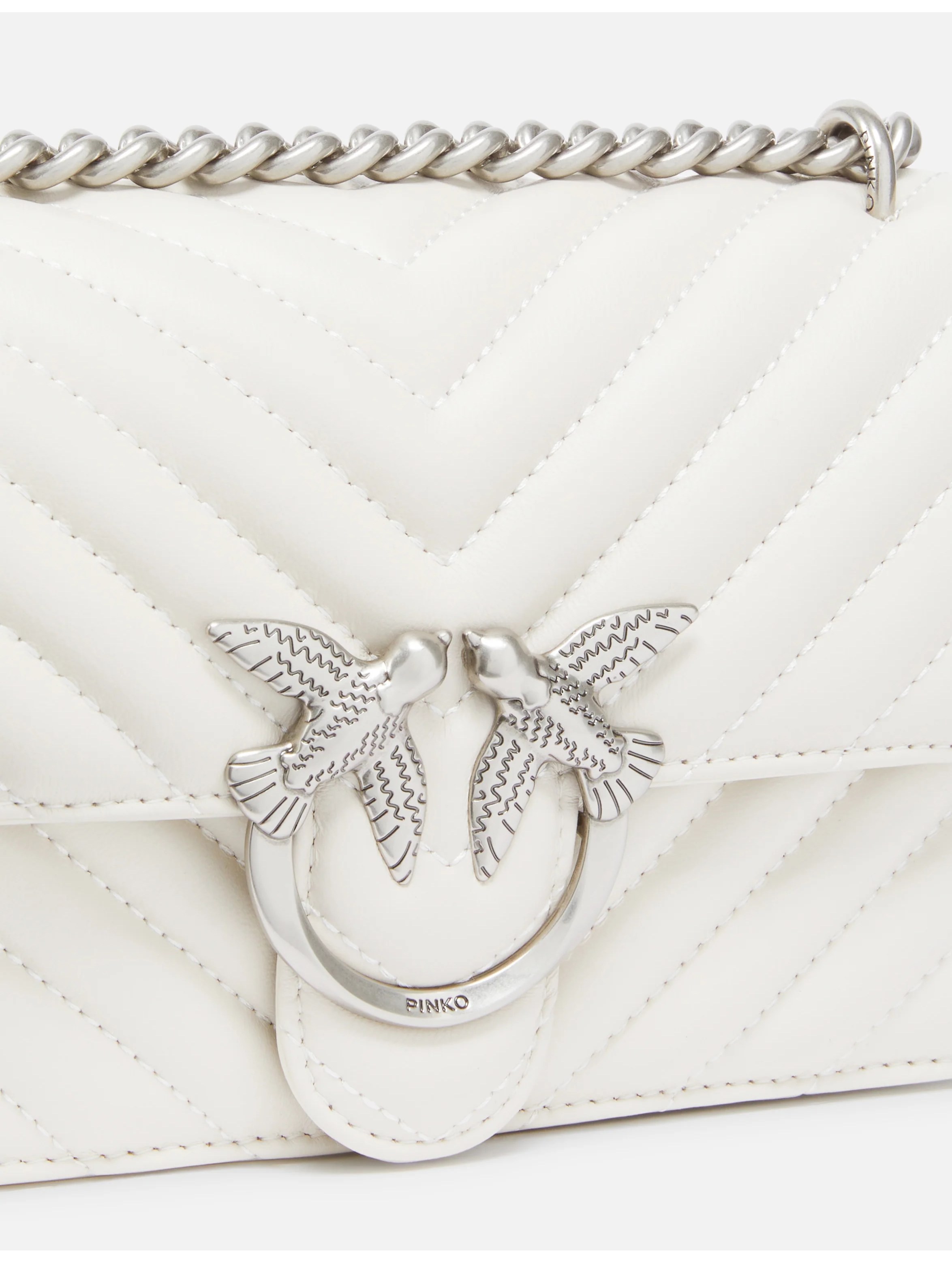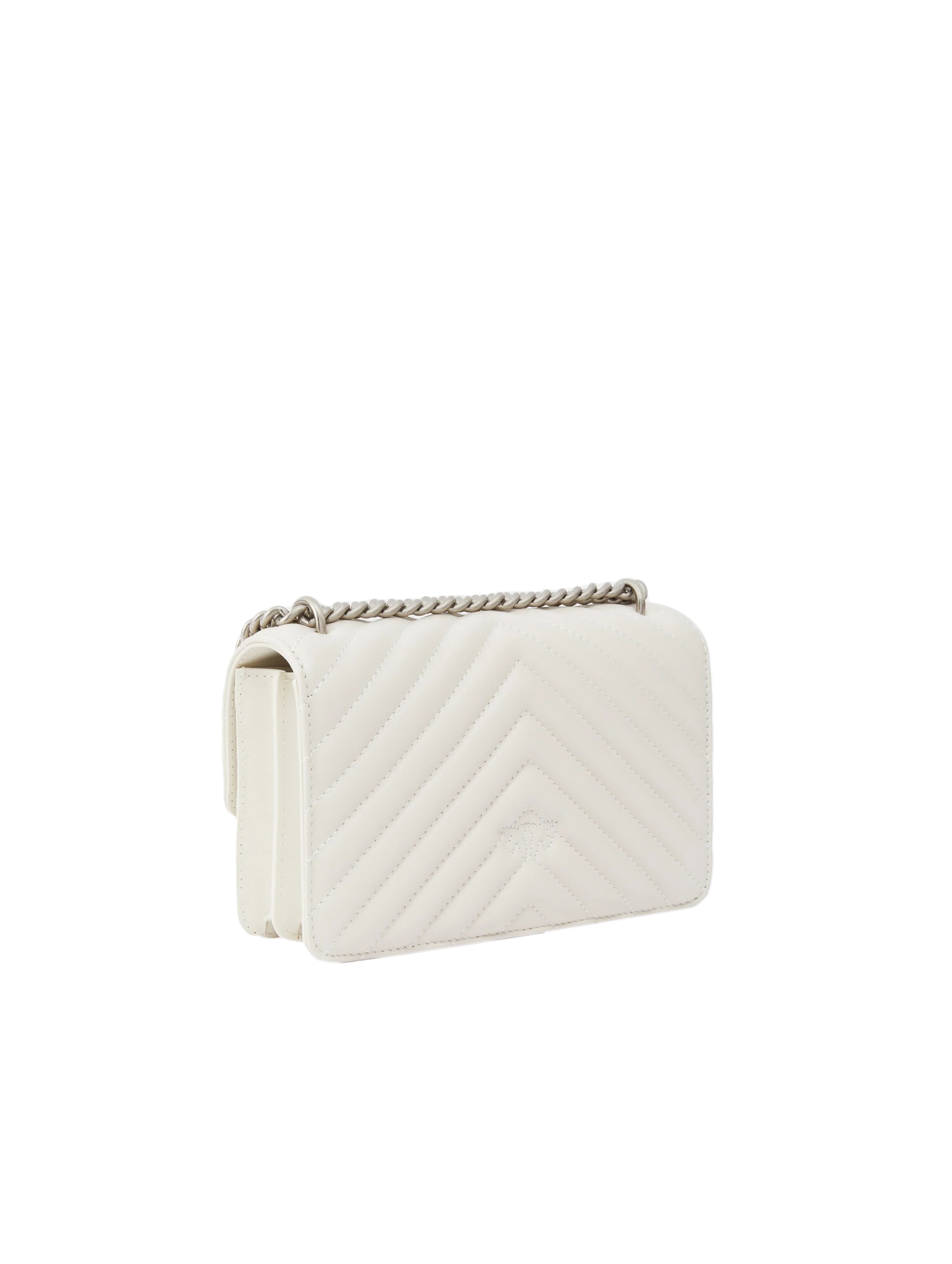 Borsa a tracolla realizzata in morbida nappa, dal design trapuntato con motivo chevron, con interno foderato, tramezza chiusa con zip e tasca a parete in pelle, con tracolla in catena rotonda con pratico spallaccio in pelle regolabile e completata dall'iconica fibbia in metallo Love Birds Diamond Cut in metallo. Per look trendy e chic. PINKO