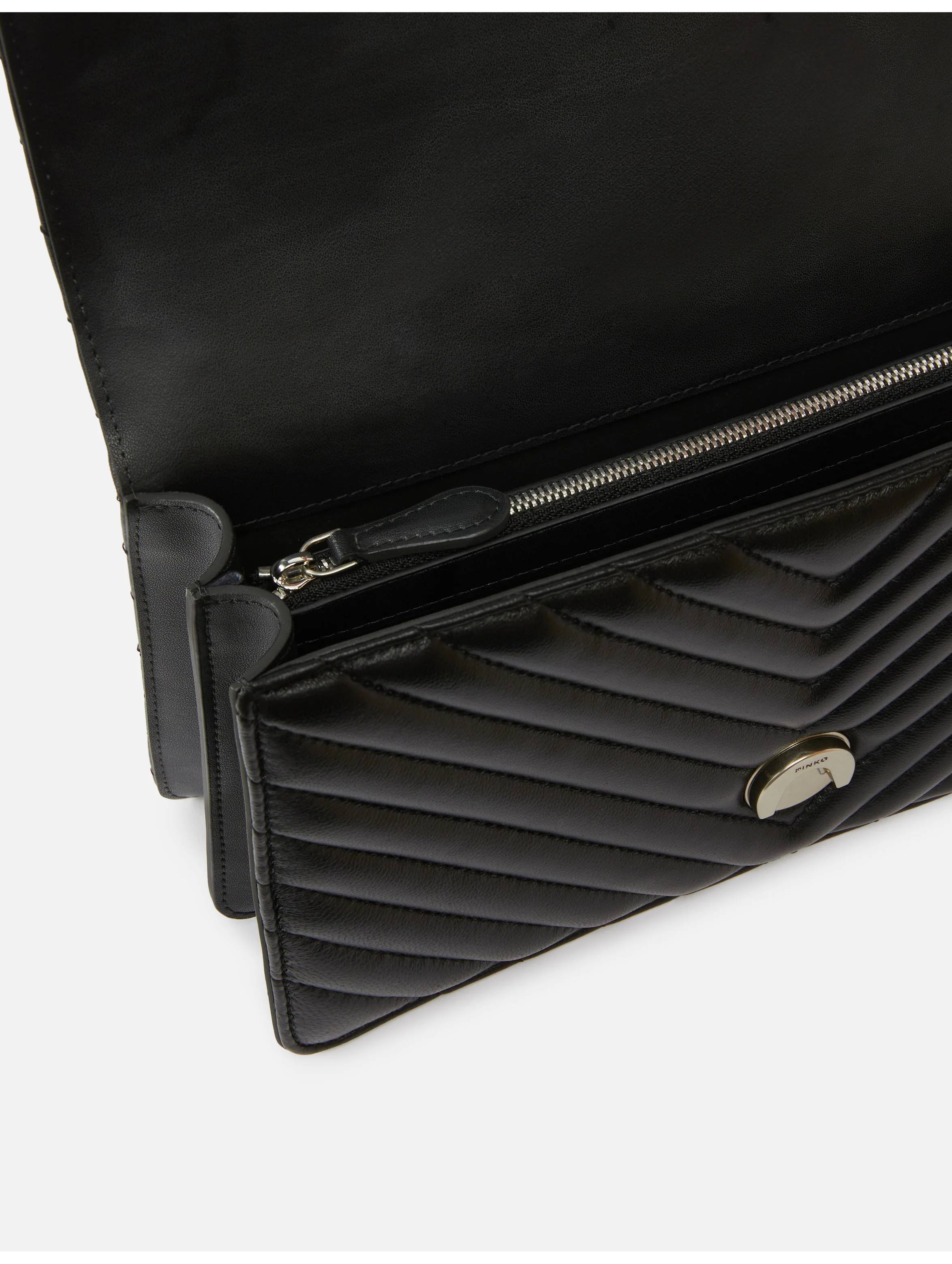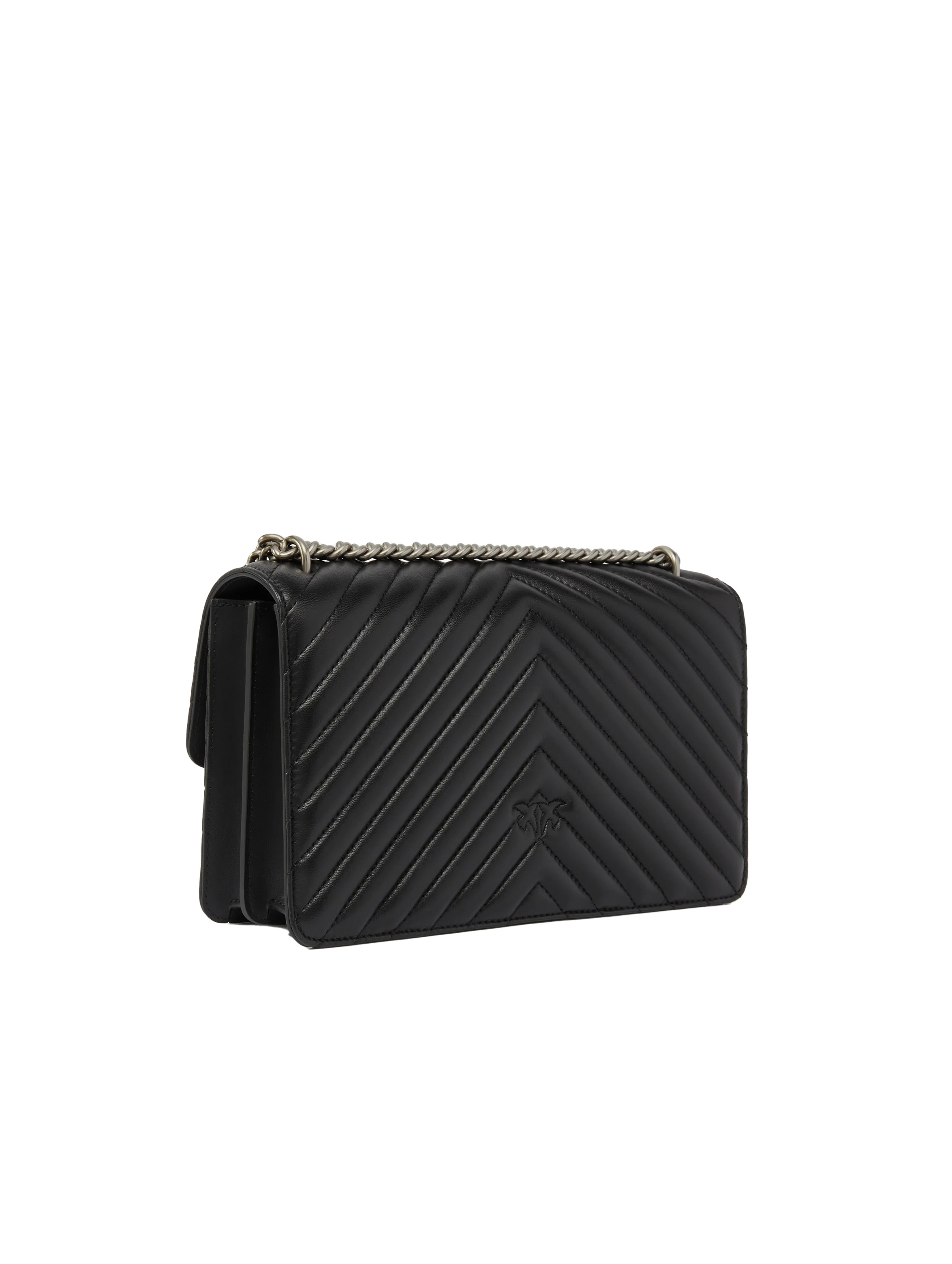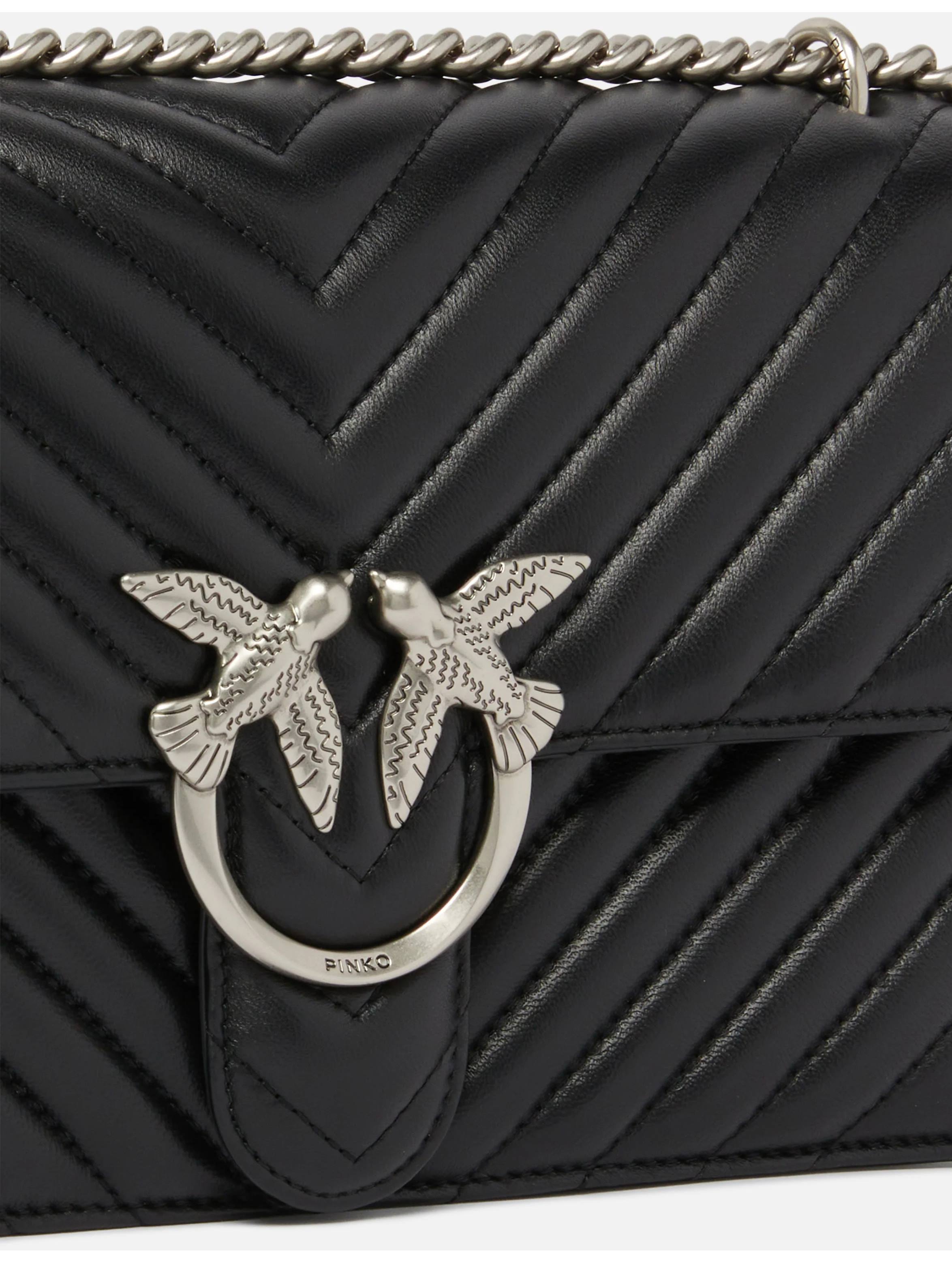 Borsa a tracolla media realizzata in morbida nappa, dal design trapuntato con motivo chevron, con interno foderato, tramezza chiusa con zip e tasca a parete in pelle, con tracolla in catena rotonda con pratico spallaccio in pelle regolabile, chiusura con patta e bottone magnetico completata dall'iconica fibbia Love Birds Diamond Cut in metallo. Per look fashion e chic. PINKO