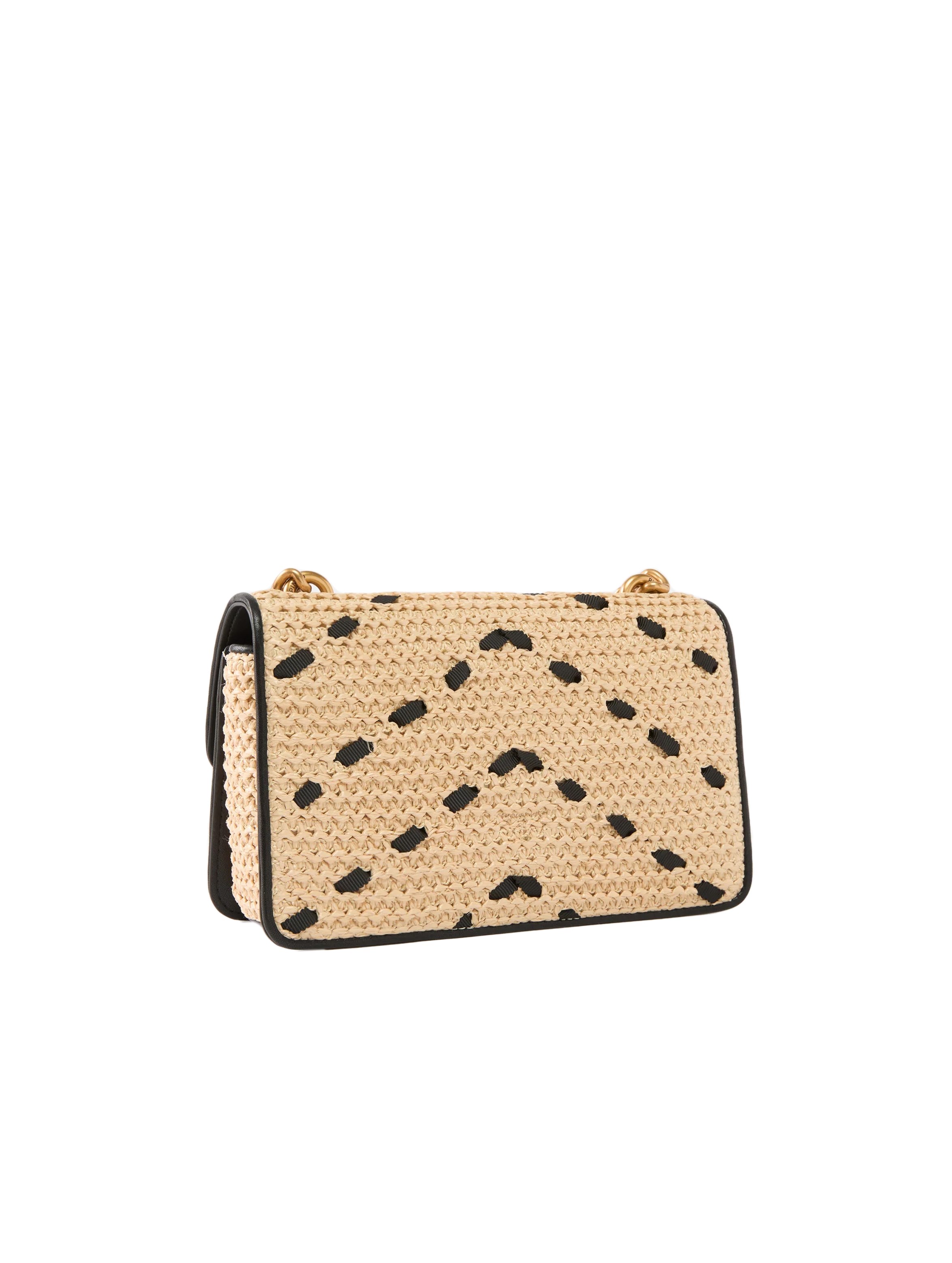 Borsa a tracolla mini, dalla struttura leggera realizzata in rafia intrecciata, decorata da un motivo chevron in fettuccia a contrasto di colore, rifinito con bordi in pelle, interno foderato con tasca a parete con zip, tracolla a catena e spallaccio in pelle, chiusura con patta e bottone magnetico impreziosita dall'iconica fibbia Love Birds Diamond Cut. Per look raffinati dal gusto estivo. PINKO