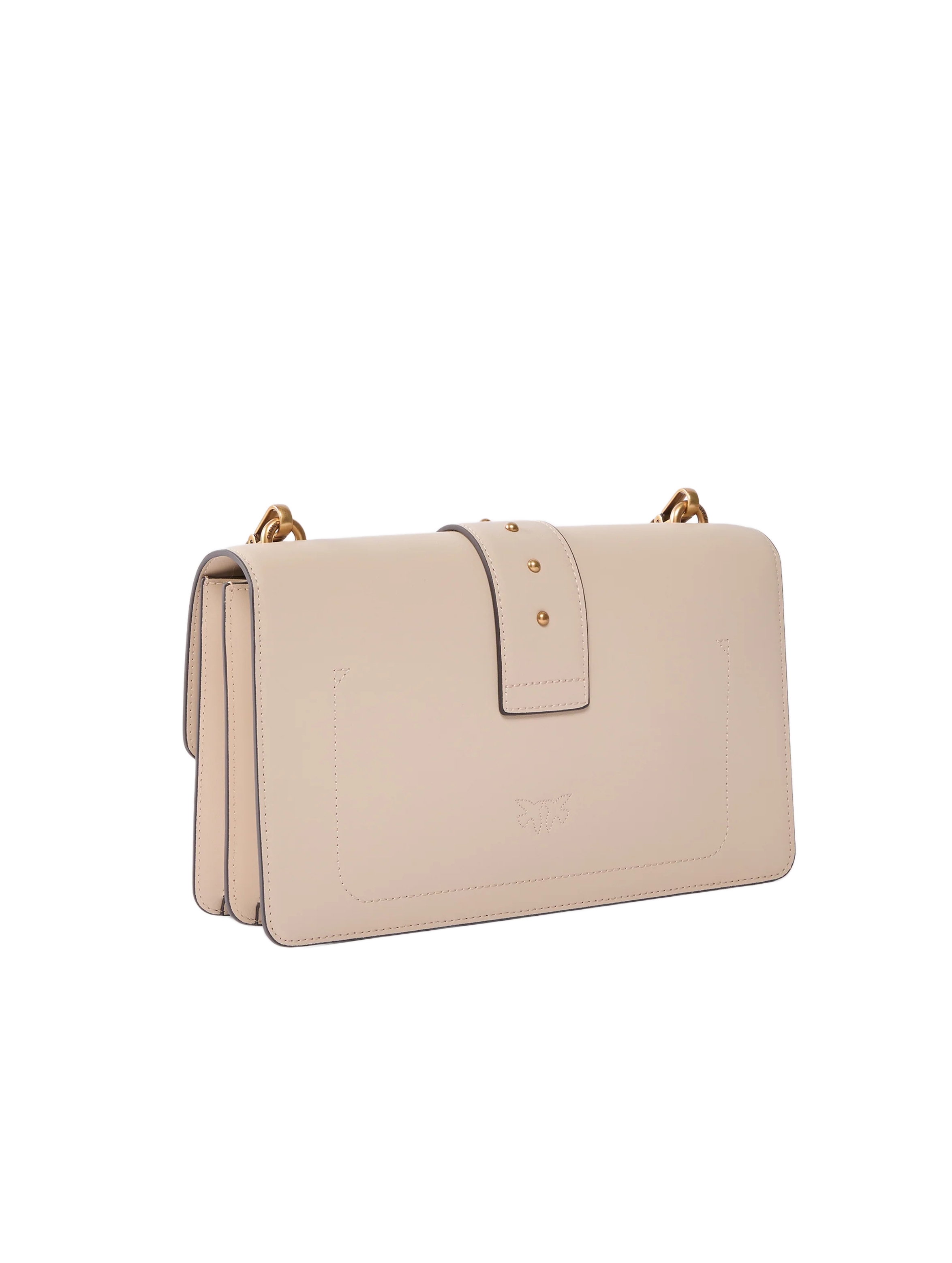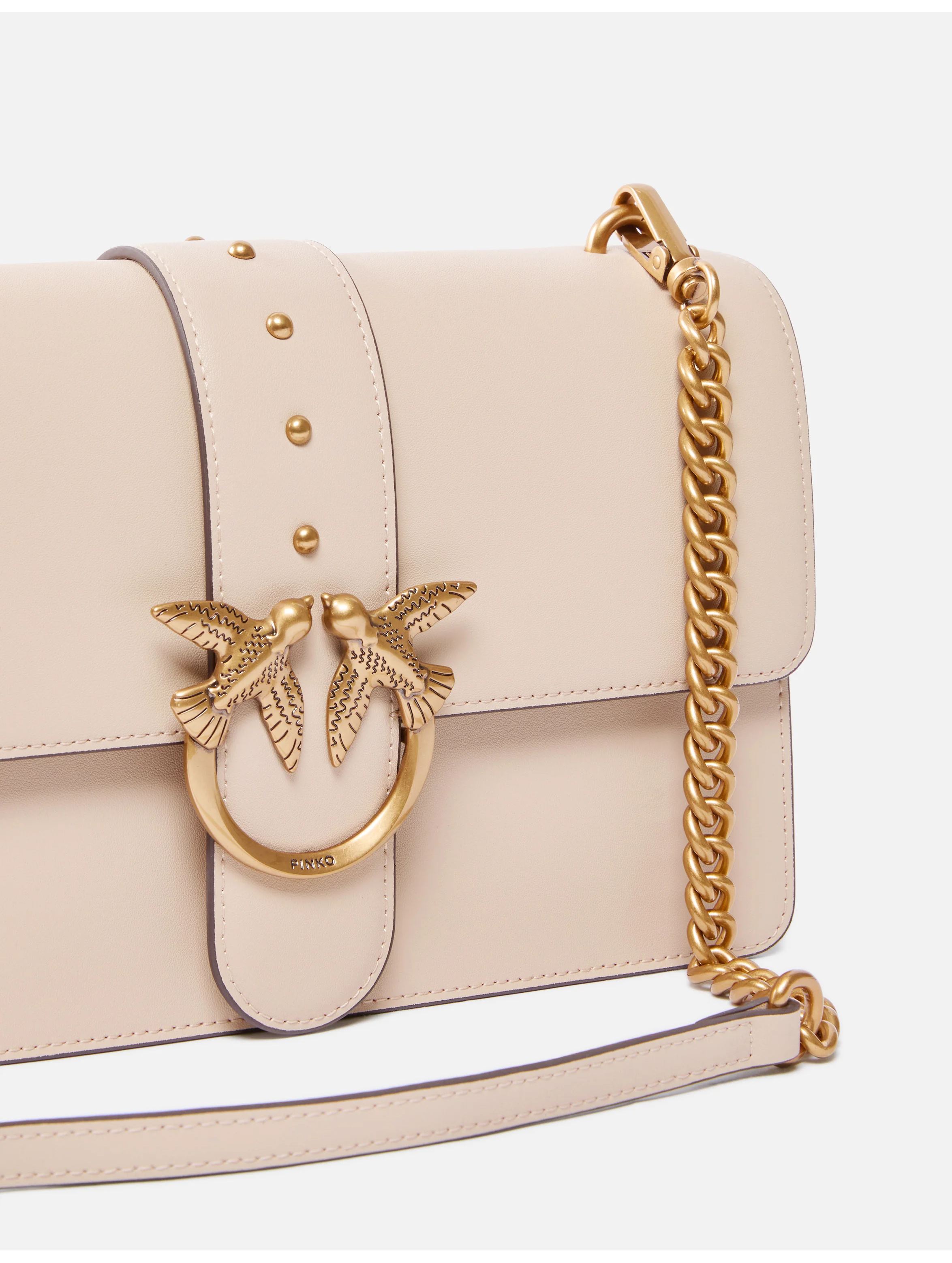 Borsa a tracolla media, realizzata in morbida pelle mano seta, con interno foderato, tramezza con zip, tracolla regolabile e removibile in catena con spallaccio in pelle, chiusura con patta e bottone magnetico impreziosita da piccole borchie e dall'iconica fibbia in metallo Love Birds Diamond Cut. Per look trendy e chic. PINKO