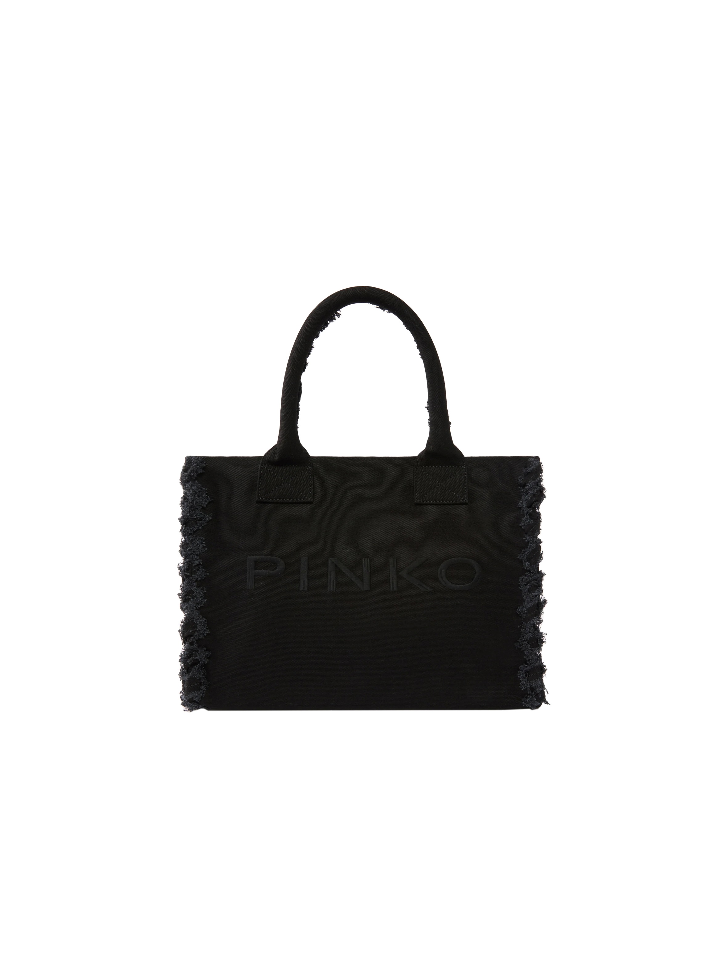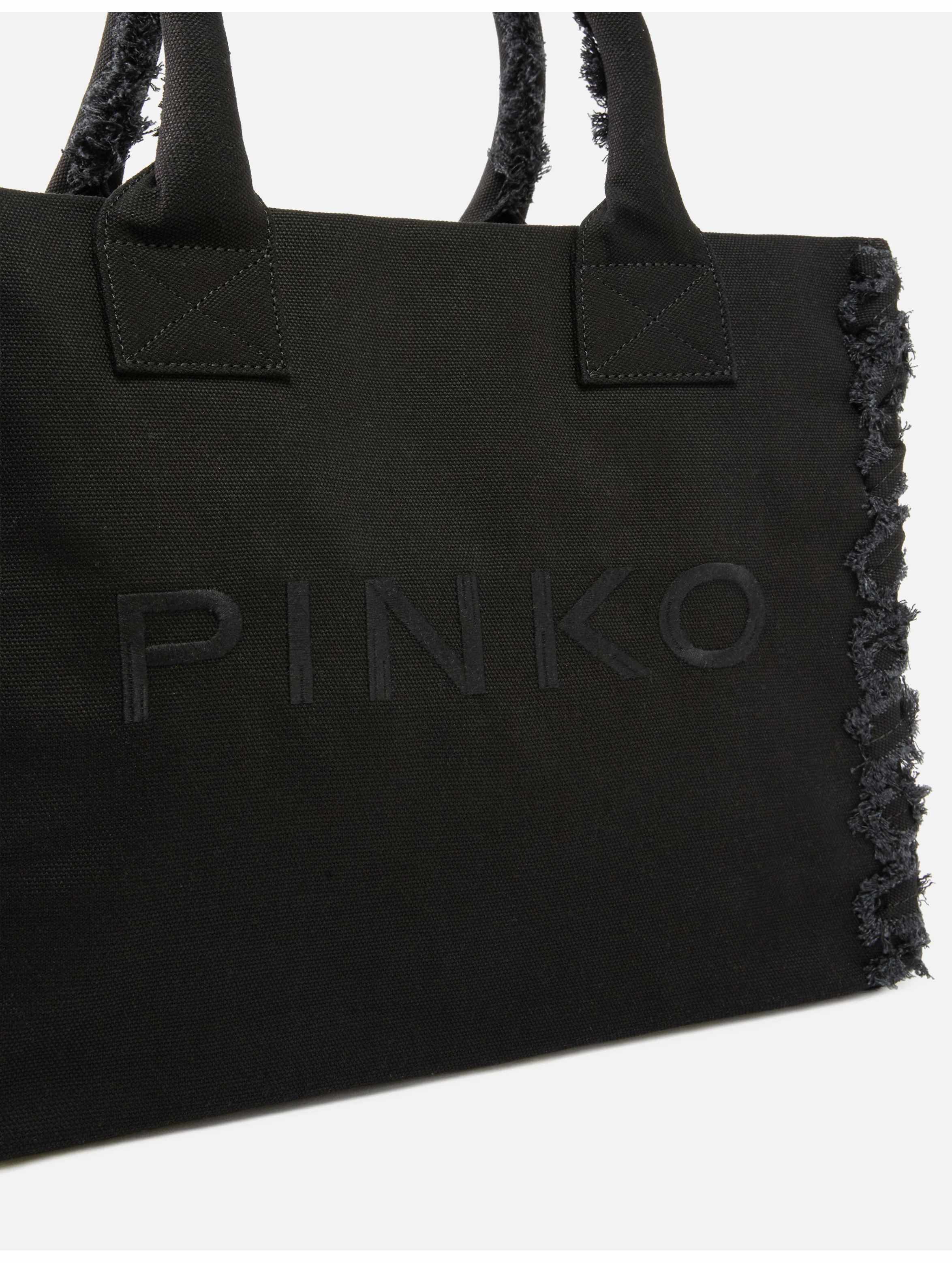 Borsa shopper media realizzata in canvas, dalla forma rettangolare e leggermente allungata, con due manici tubolari con bordi interni sfrangiati, chiusura con zip, interno foderato con tasca a parete, particolari bordi laterali con una decorazione a effetto attorcigliato e leggermente sfrangiati e maxi logo lettering ricamato in tono sul davanti. Per un look stiloso e trendy. PINKO