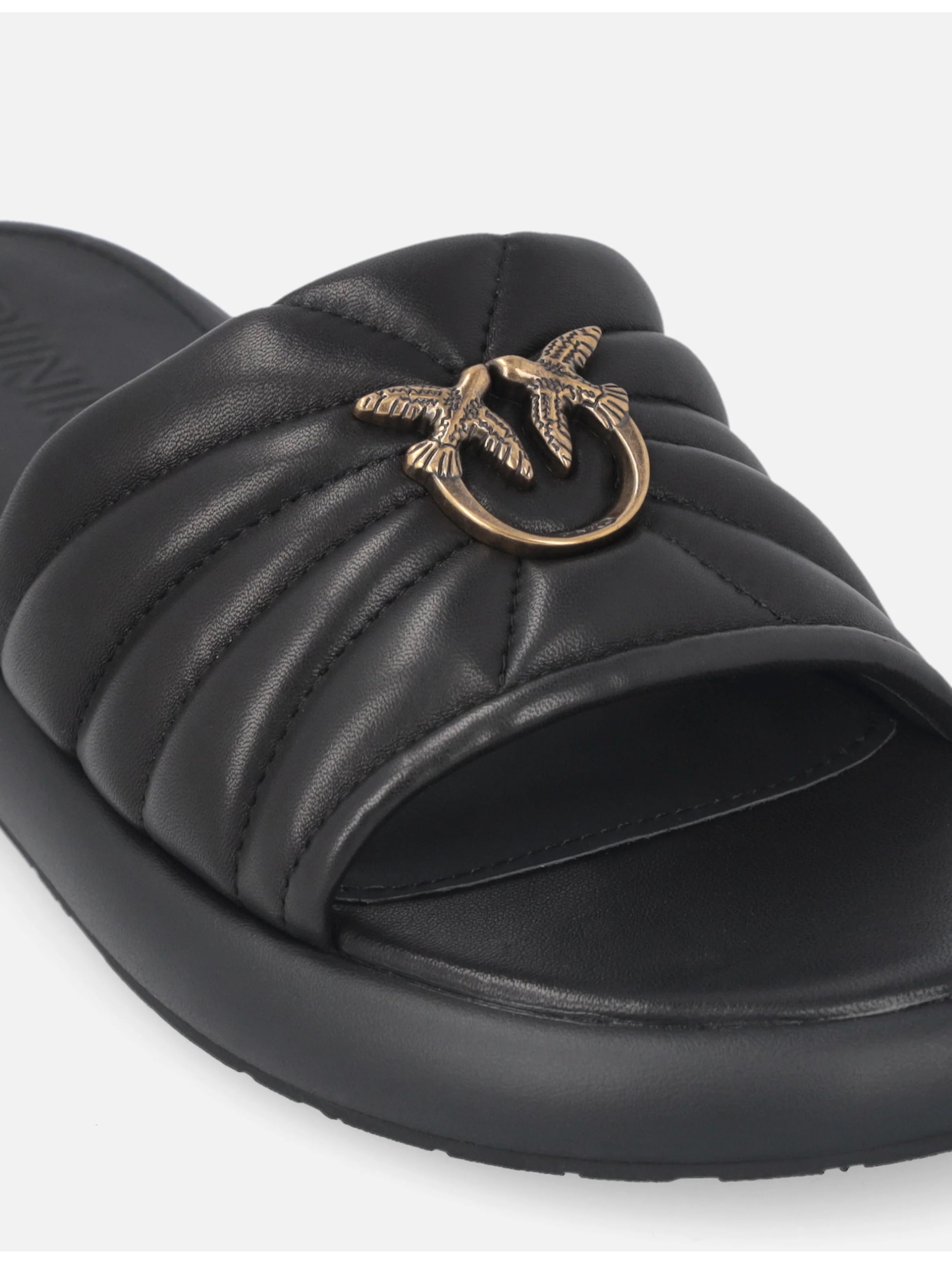 Ciabatte realizzate in morbida nappa, caratterizzate da una spessa fascia superiore imbottita e trapuntata con al centro una placchetta metallica raffigurante l'iconico logo Love Birds Diamond Cut, con suola in gomma dal profilo chunky ma armonioso e soletta in confortevole pelle. Per uno stile urban e contemporaneo. PINKO