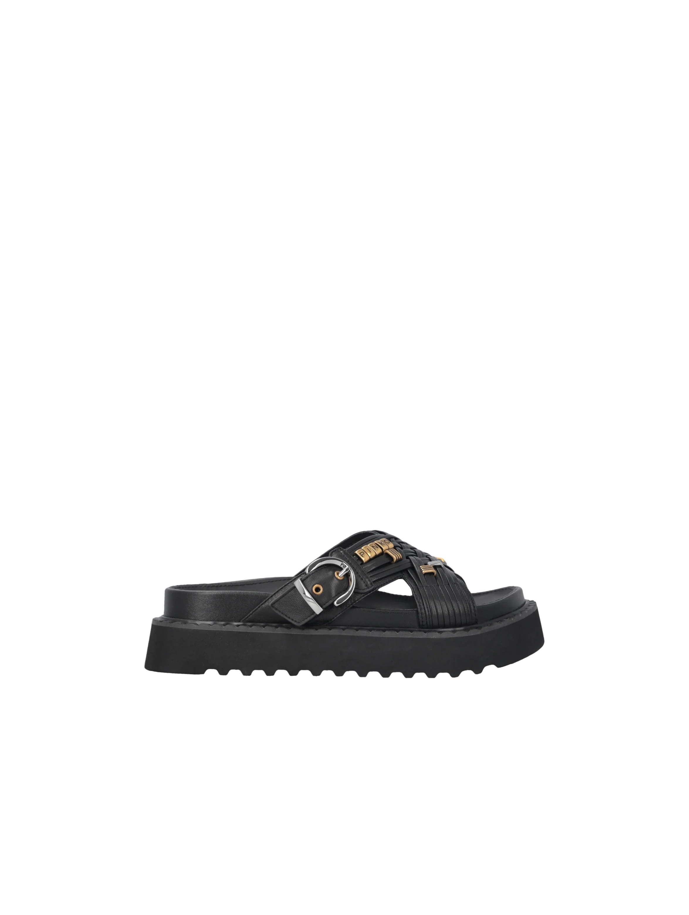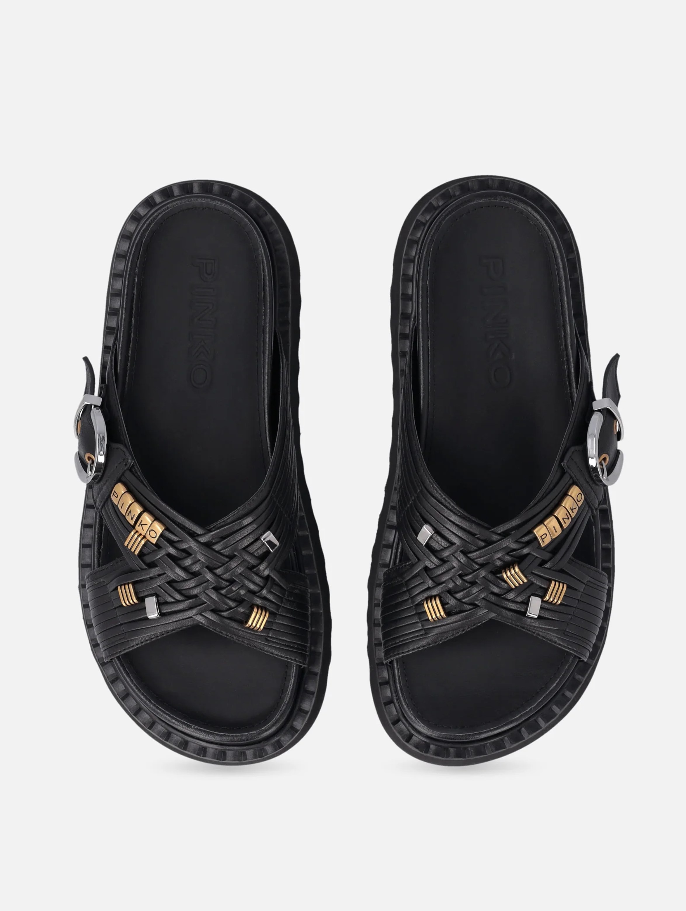 Sandali stile ciabatta in morbida nappa, caratterizzati da un'estetica bold con due spesse fasce incrociate e intrecciate sulla parte superiore, con fibbia per regolare al meglio la calzata, suola carrarmato in gomma, elementi metallici in galvaniche differenti e anelli disposti a fortmare il logo lettering. Per uno stile urban e rock. PINKO