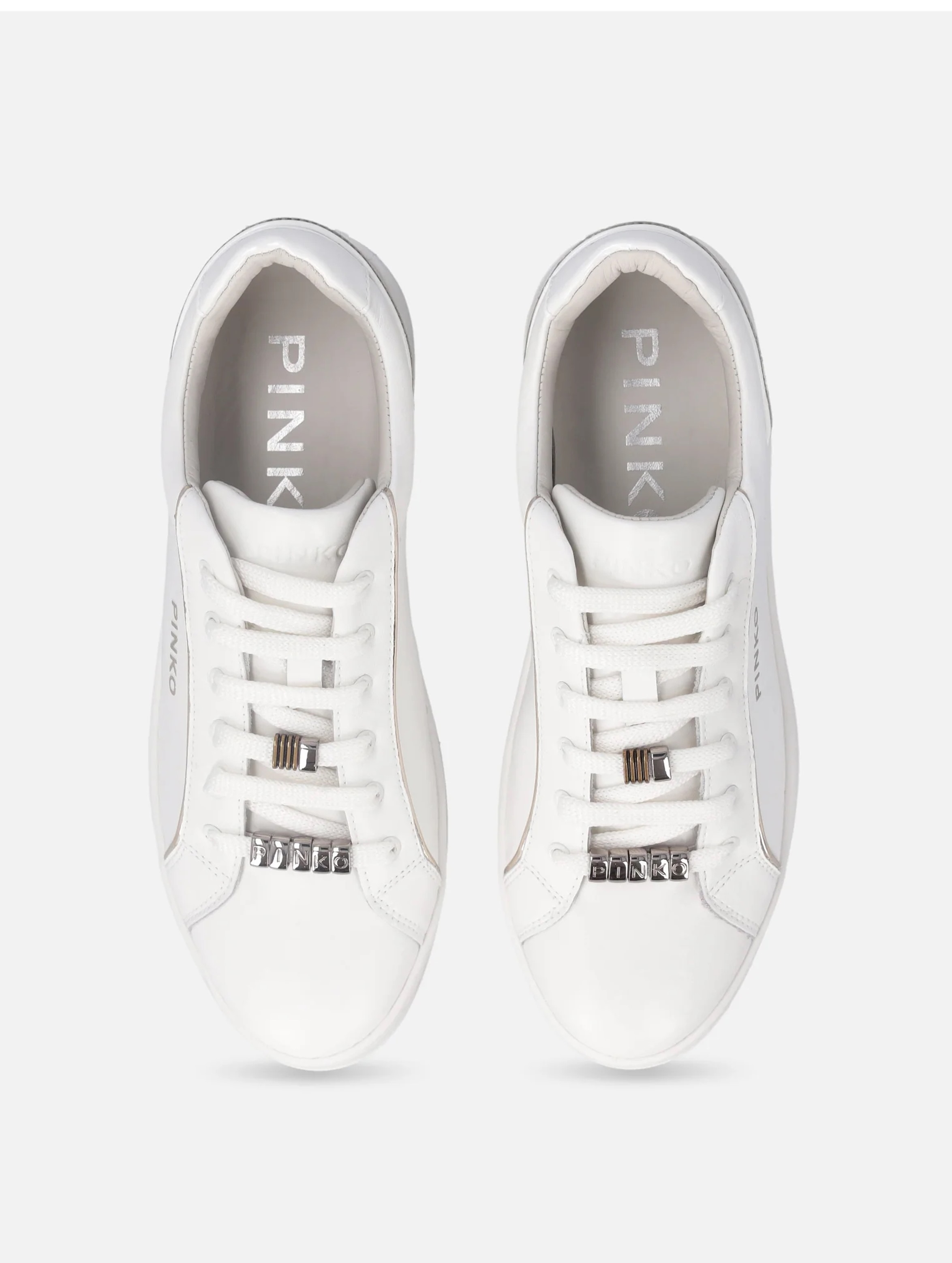 Sneakers realizzate in pelle liscia e tessuto tecnico, con chiusura con lacci piatti, contraddistinte per i sottili contrasti creati dal piping lungo la tomaia, con gambetto dall'effetto lucido con iconici uccellini, logo lettering sul lato esterno e anelli metallici che arricchiscono i lacci con logo lettering inciso che donano un tocco di stile. Per un look fashion e glam. PINKO