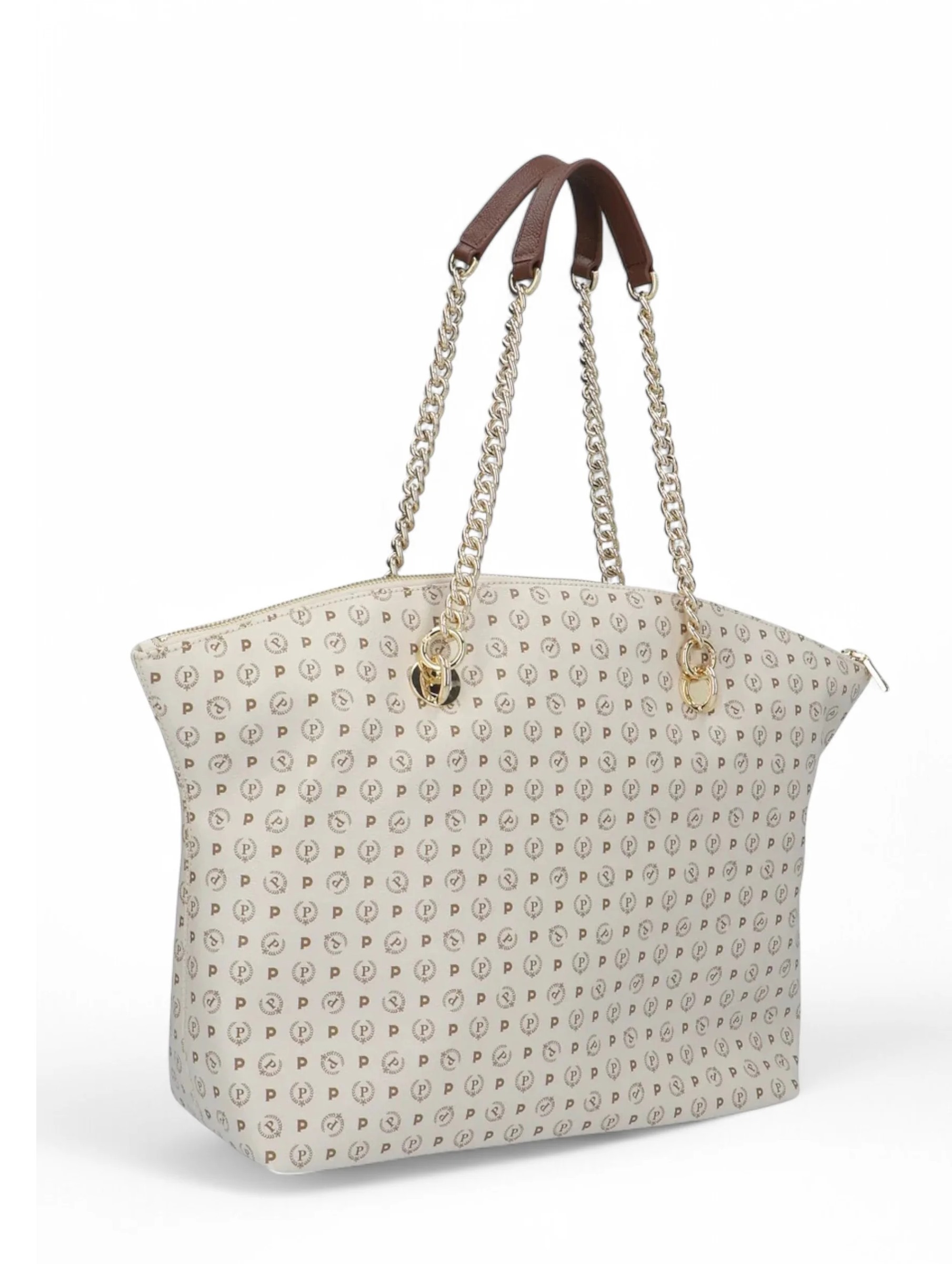Borsa modello "shopping bag", con iconica stampa "P Alloro" allover, con doppi manici in pelle e catena dorata intercambiabili e removibili, con portachiavi clochette amovibile e chiusura con zip. Per un look elegante e senza tempo. POLLINI HERITAGE