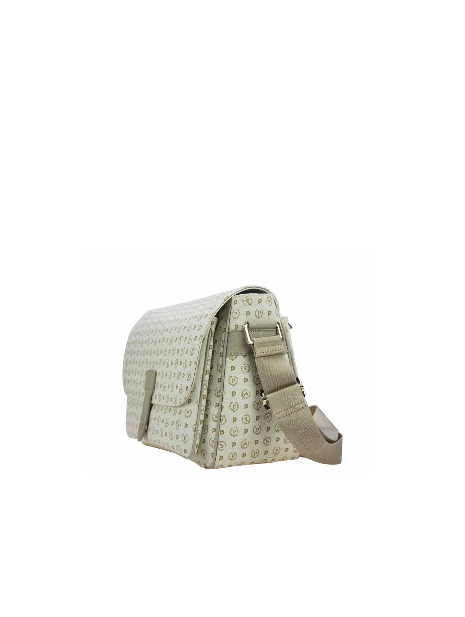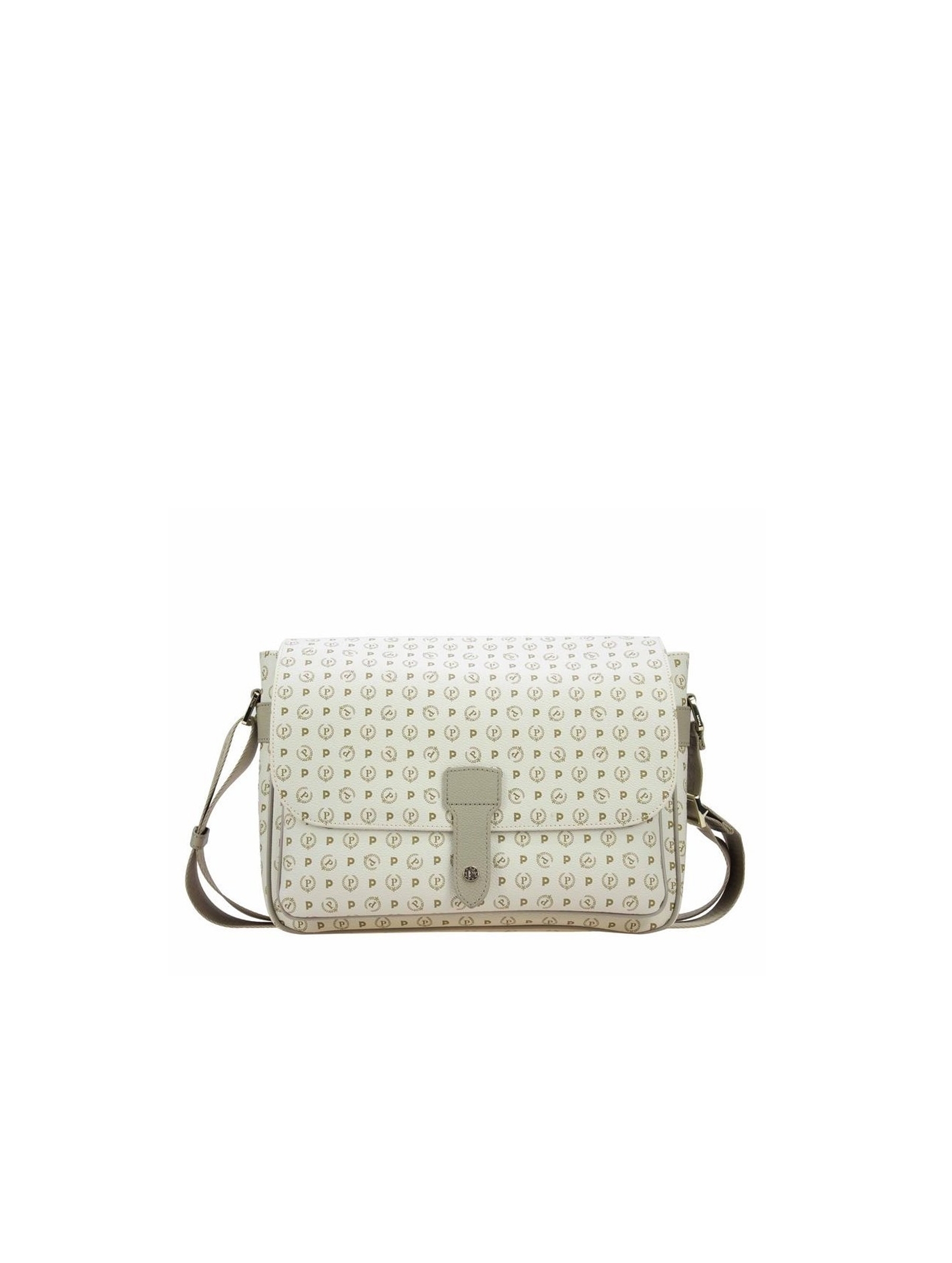 Borsa modello camera bag, in pvc con inserti in pelle di vitello, con iconica stampa heritage e P-alloro all over, con ampia tasca con patta posta sul quadrante frontale, tasca sul retro regolata da zip, tracolla regolabile in nastro logato, chiusura con zip e interno foderato. Per un look elegante e senza tempo. POLLINI HERITAGE