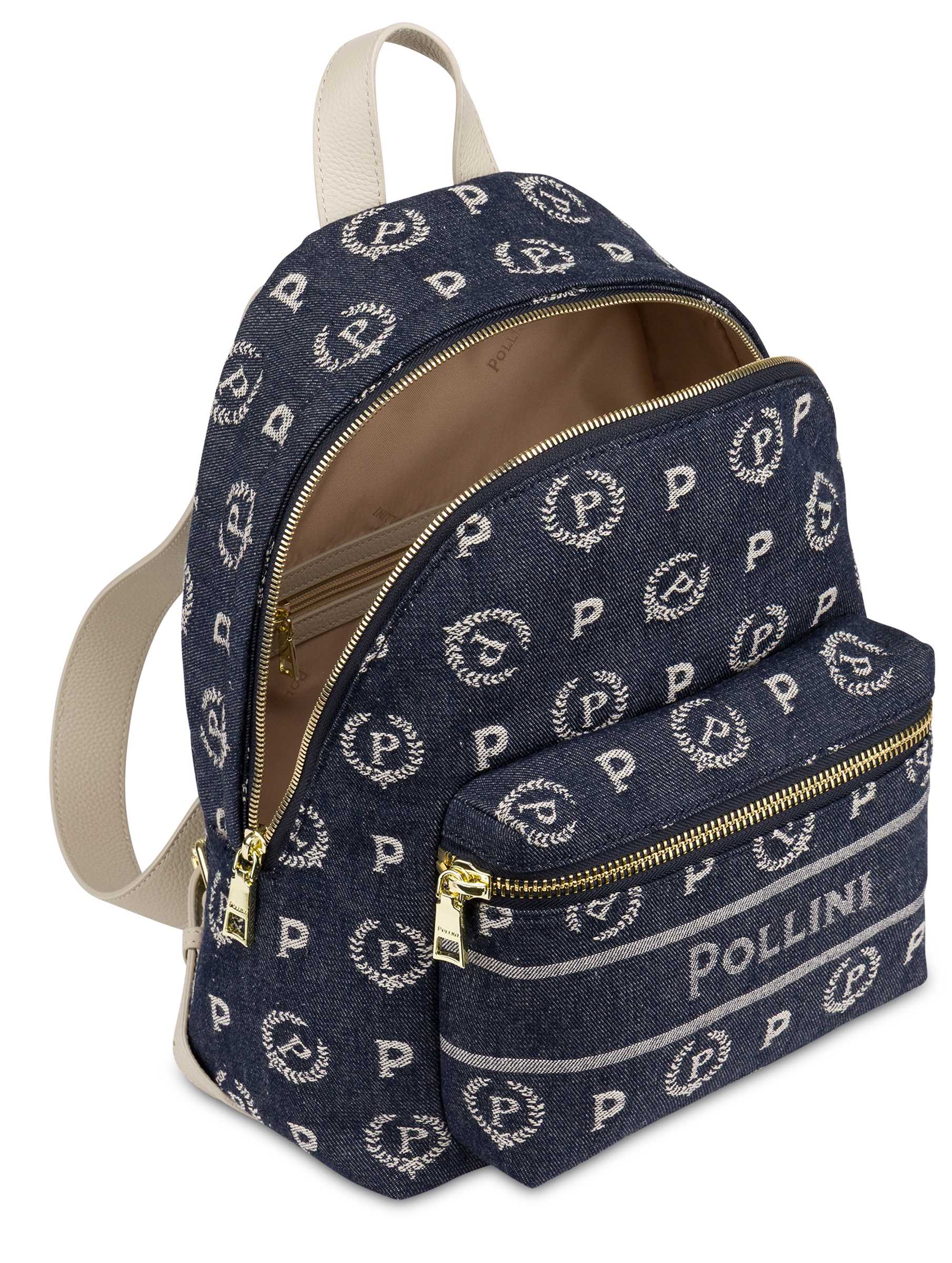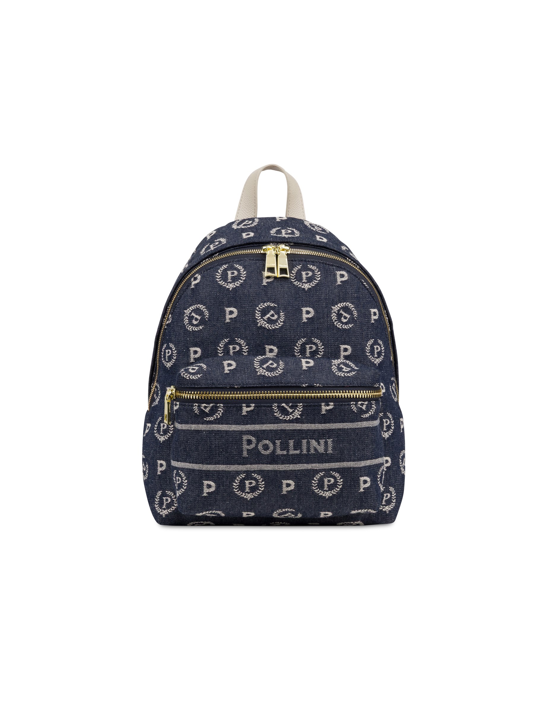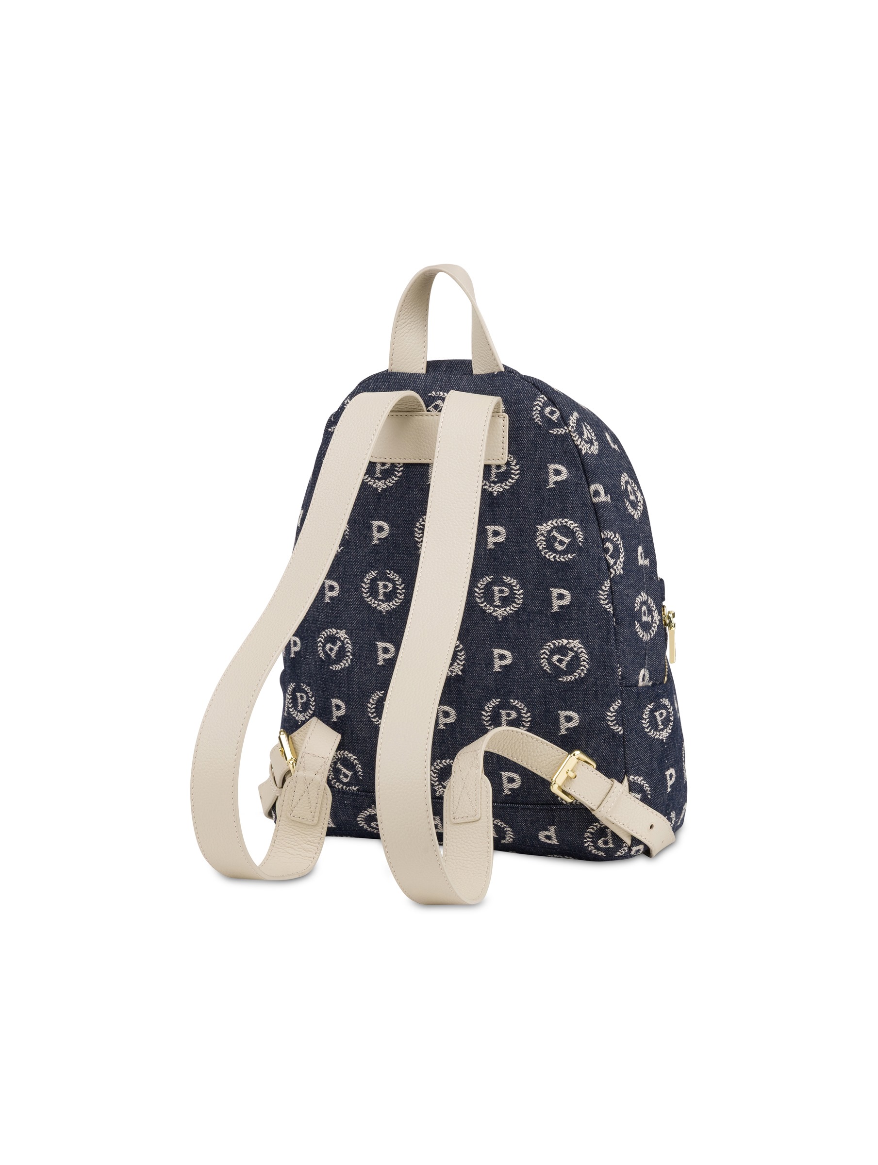 Zaino realizzato in denim con inserti in pelle di vitello, con stampa monogramma e P-alloro all over, chiusura con cerniera doppio cursore, tasca esterna zippata, interno foderato con 2 tasche aperte e tasca con zip e spallacci regolabili con fibbia. Per un look casual e trendy. POLLINI HERITAGE