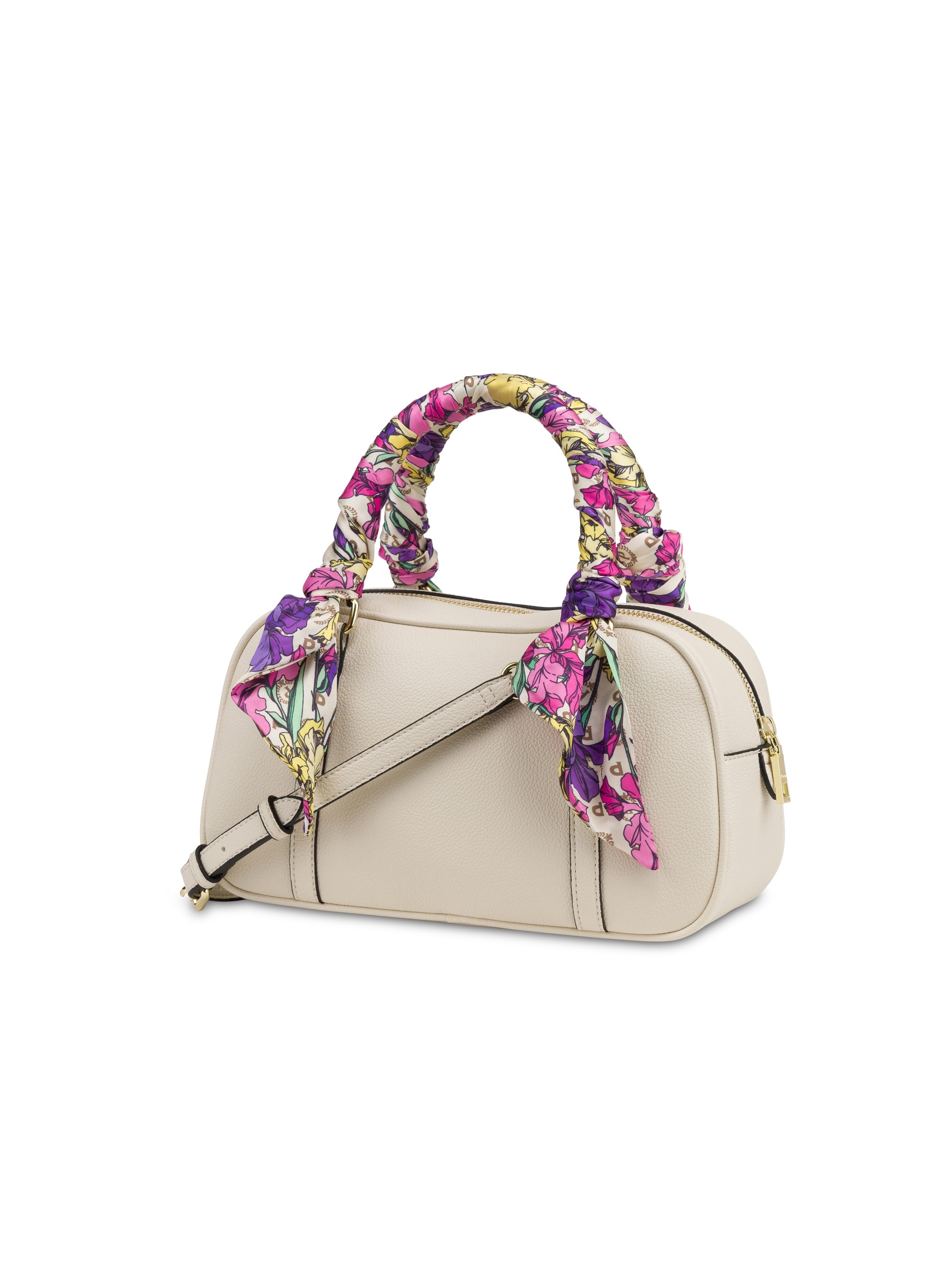 Borsa modello bowling in PU, dalle linee morbide con angoli arrotondati, con doppi manici tubolari, tracolla regolabile e rimovibile per una doppa portabilità, chiusura con zip, particolare dettaglio di fasca centrale con logo Heritage in rilievo, placchetta con logo in metallo e foulard floreale sui manici che aggiungono un tocco chic e ricercato ai tuoi look. POLLINI SILVER
