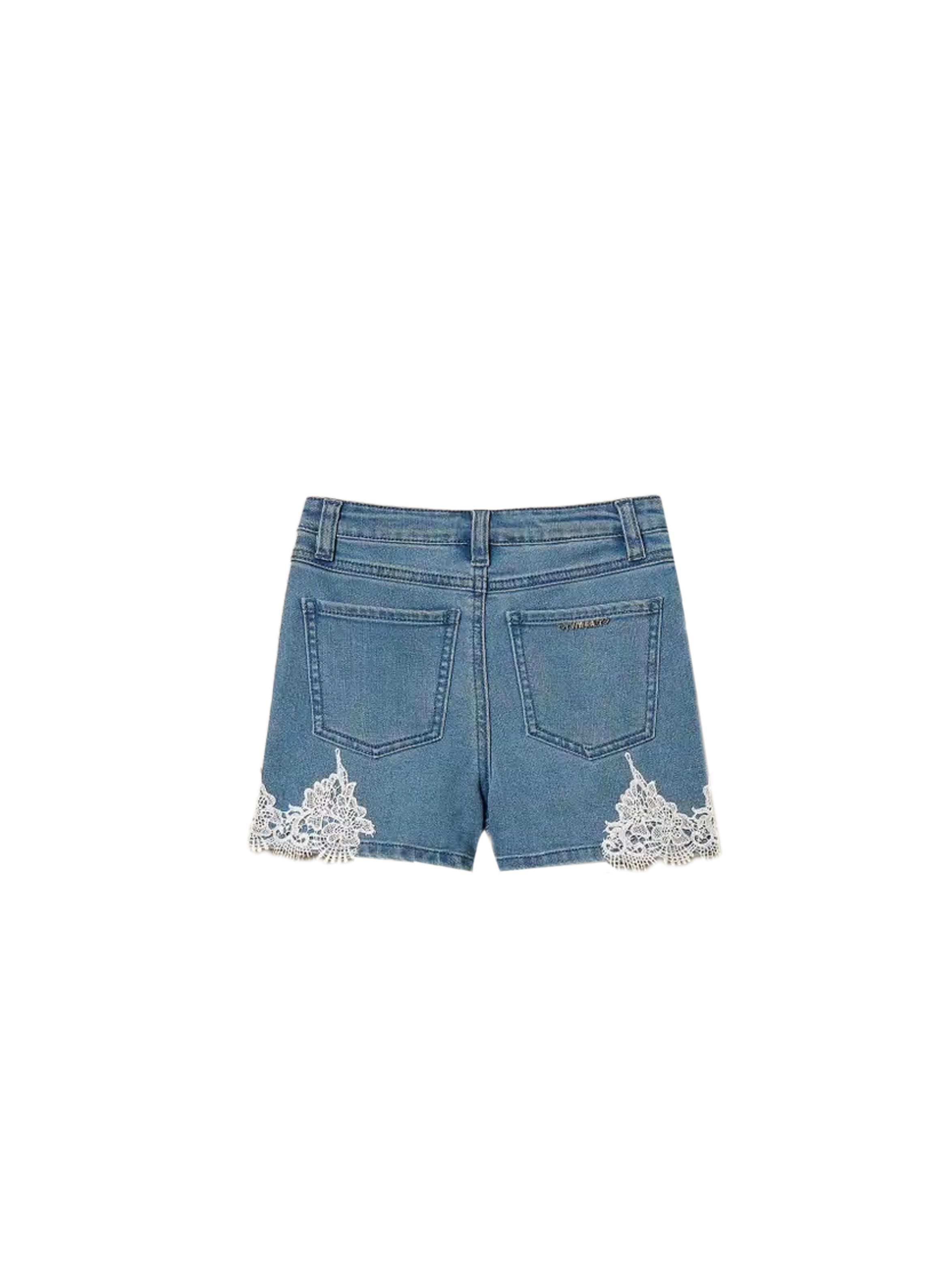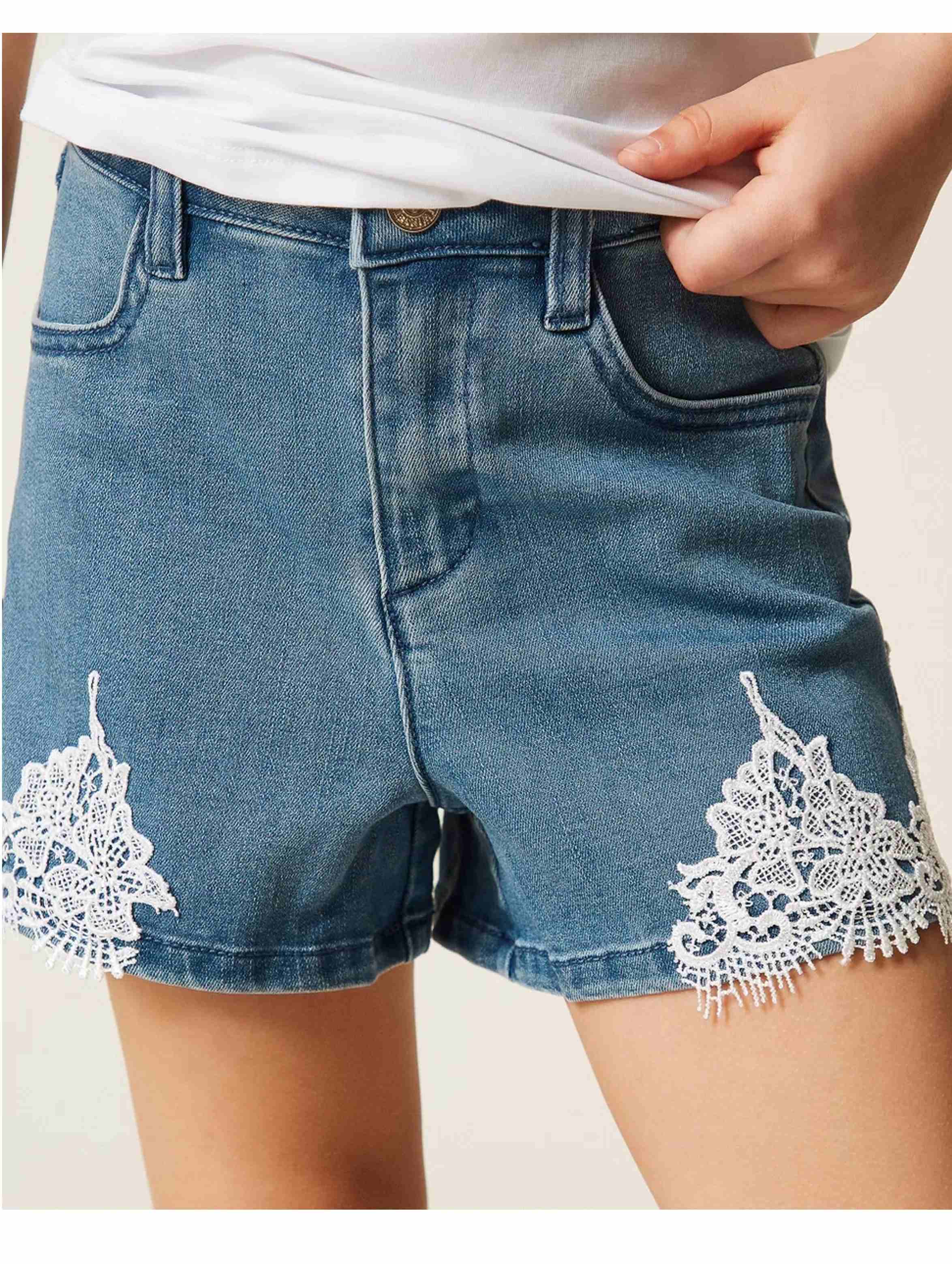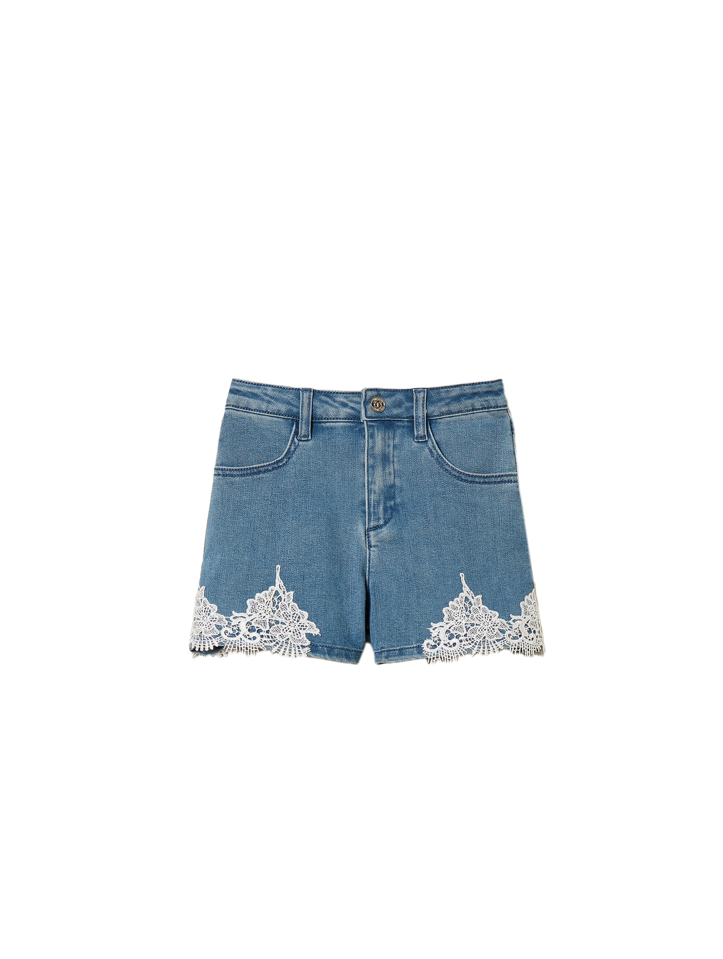 Shorts in denim stretch, dal lavaggio medio, con passanti in vita, tasche davanti e dietro, chiusura con zip e bottone logato e particolare dettaglio di applicazione di pizzo al fondo. Per un look romantico e chic. TWINSET