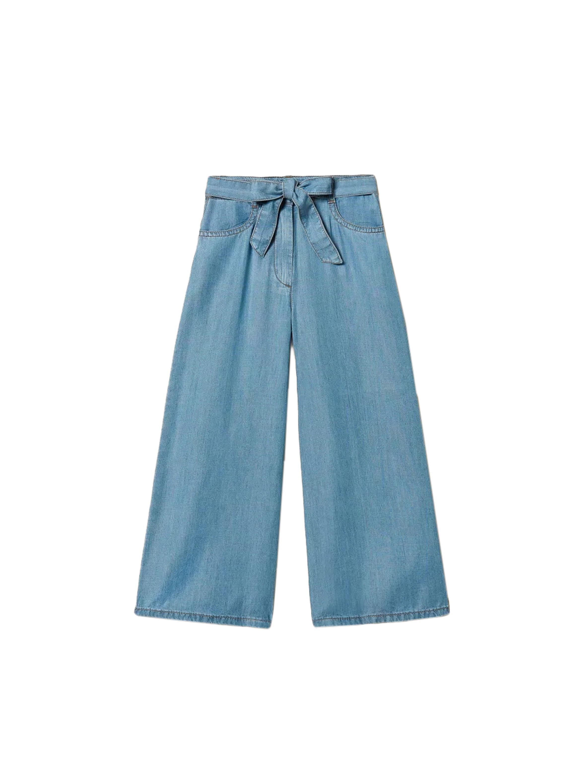 Jeans modello wide leg, realizzati in chambray, con cintura rimovibile in coordinato, con passanti in vita, chiusura con zip e bottone logato, tasche davanti e dietro e piccolo logo in metallo sul retro. Per un look trendy e fashion. TWINSET