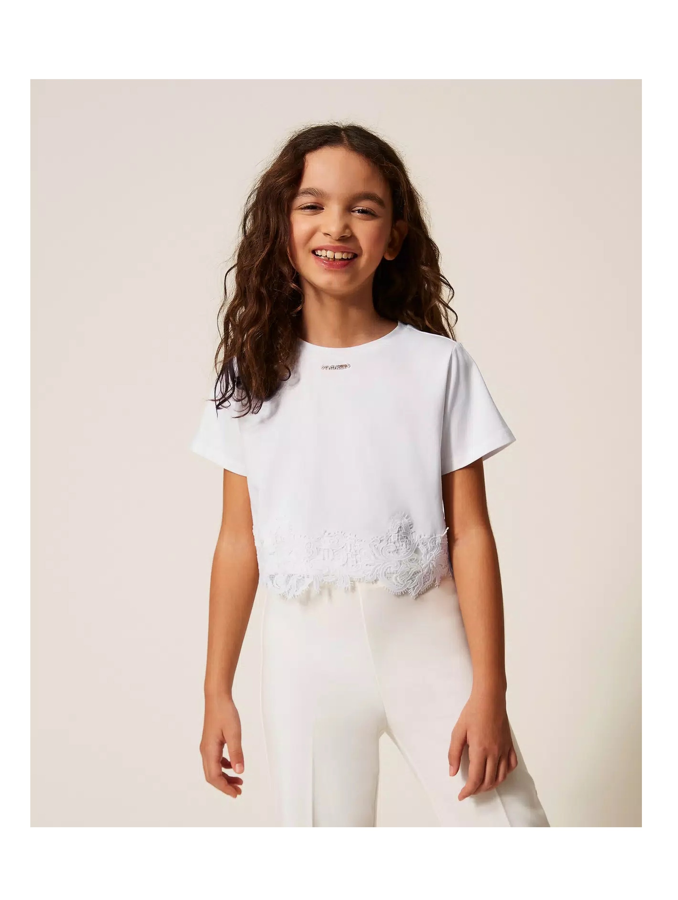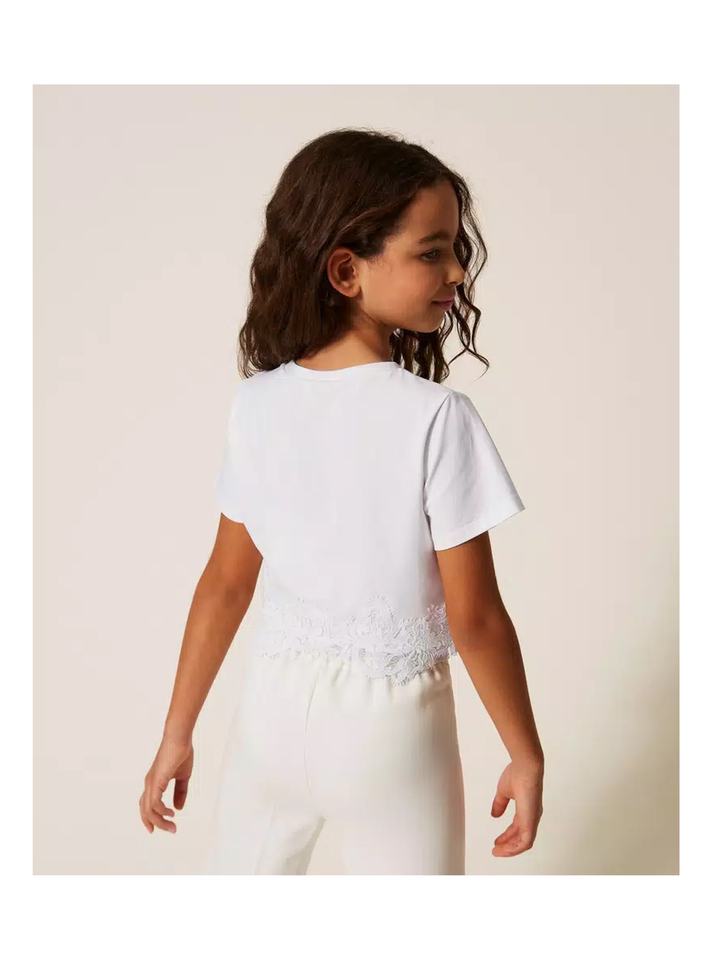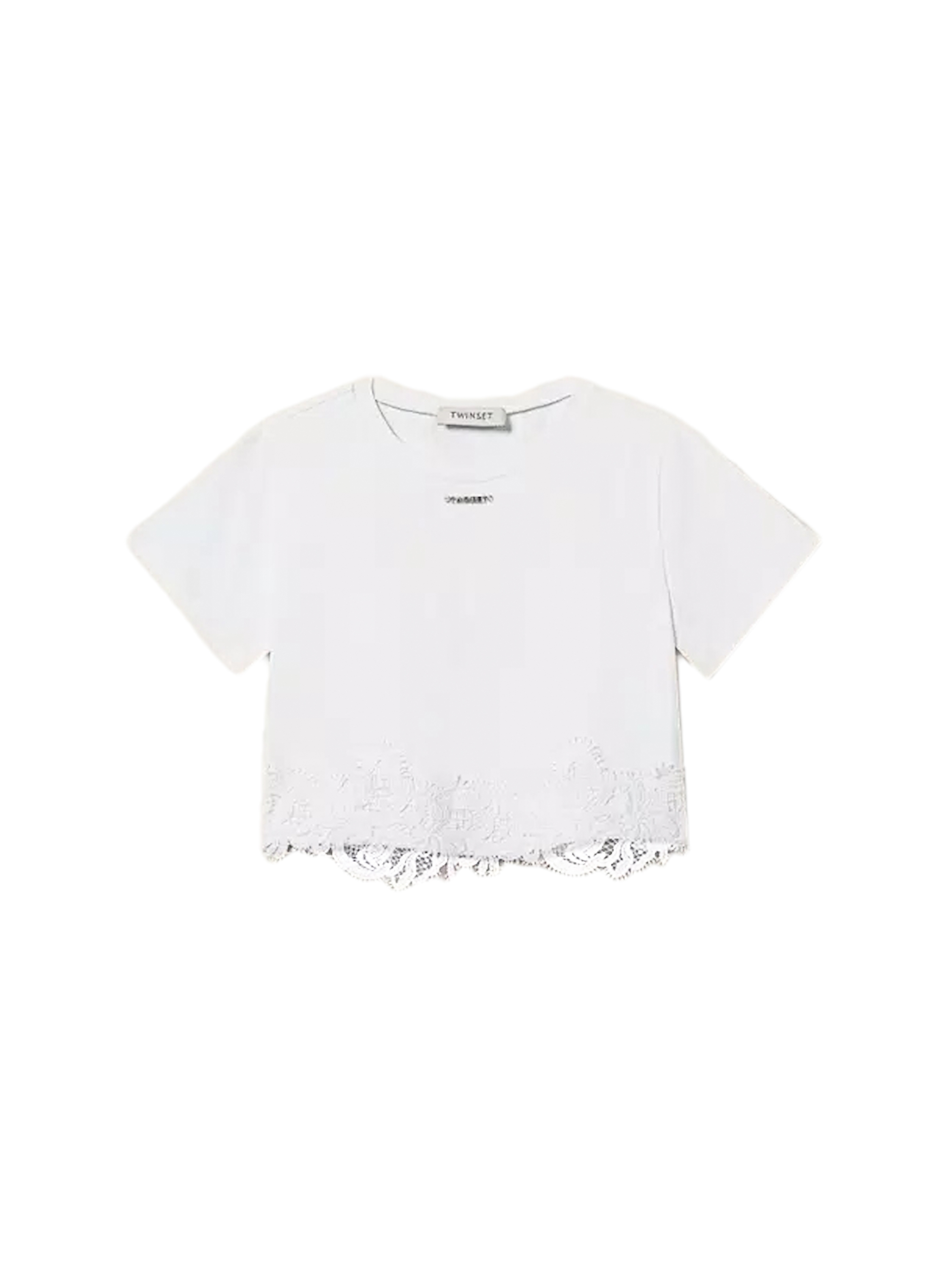 T-shirt a maniche corte, in jersey di cotone stretch, con scollo rotondo, a tinta unita, con piccolo logo in metallo sul carrè e particolare dettaglio di pizzo floreale al fondo. Per look romantici e chic. TWINSET