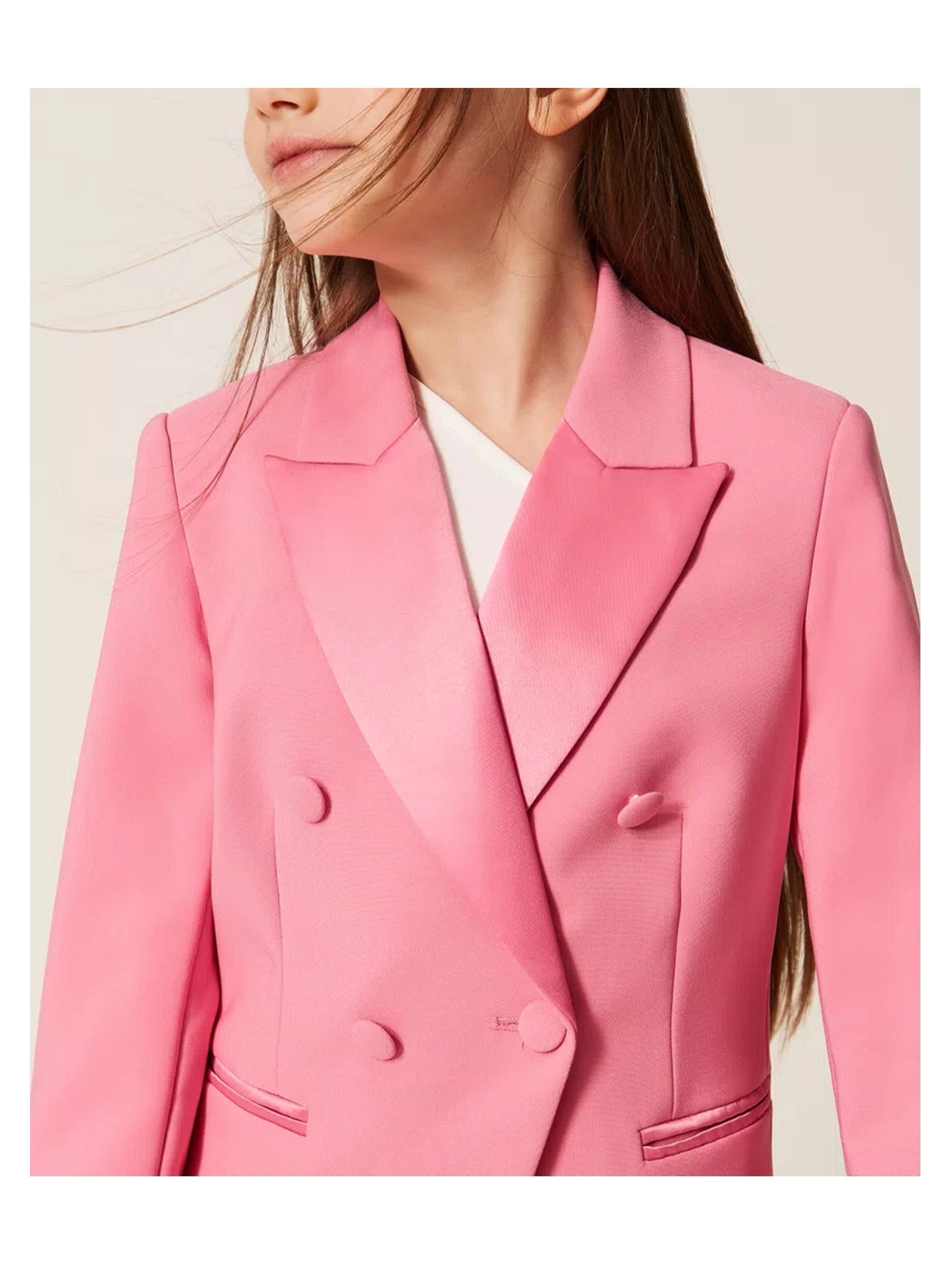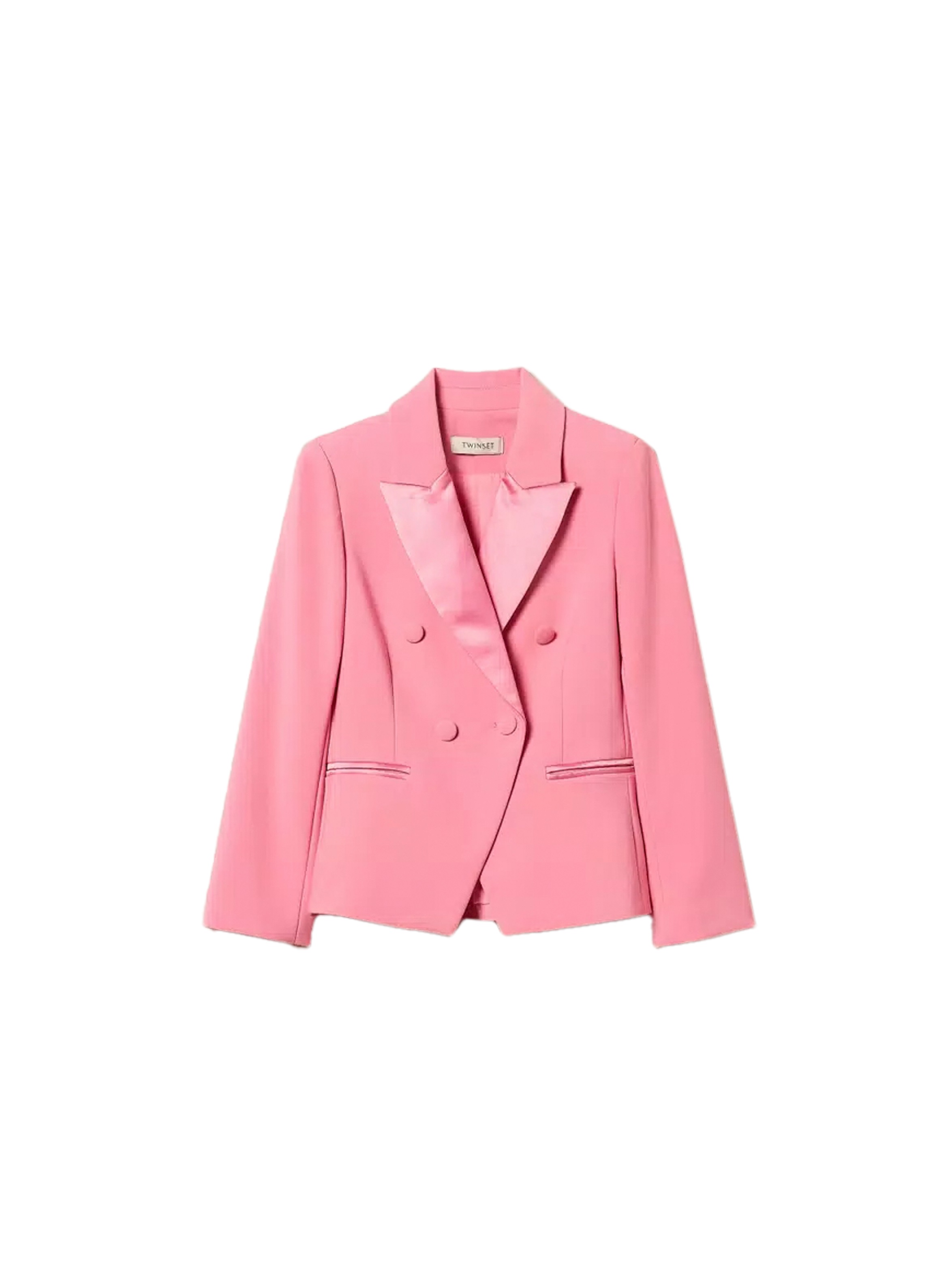 Giacca blazer realizzata in crepe, con dettagli in duchesse, con collo con revers, chiusura doppiopetto con bottoni in tinta, tasche a filetto, tagli finchetto davanti e dietro, linea slim e piccolo logo in metallo sul retro. Per un look elegante e raffinato. TWINSET