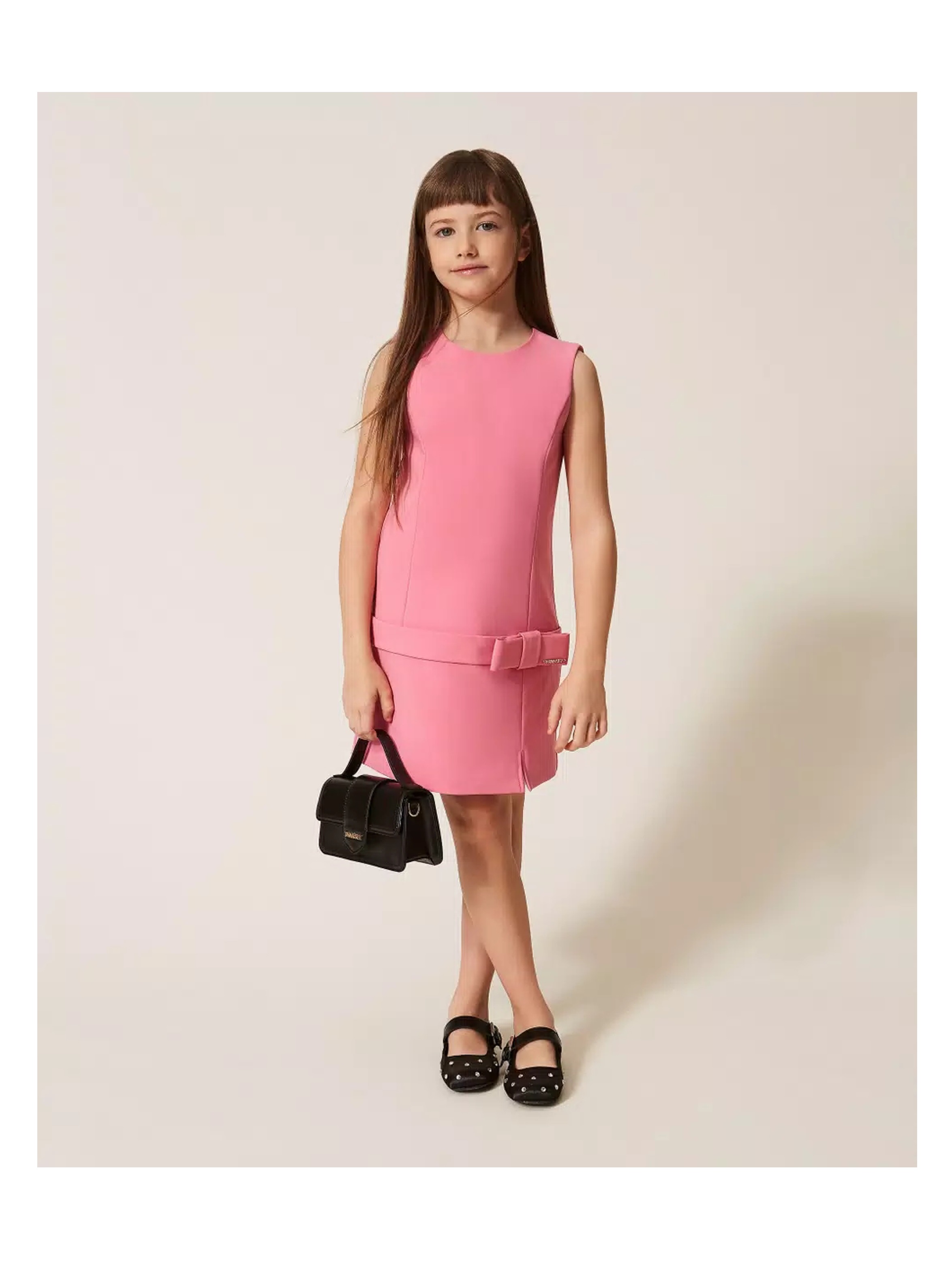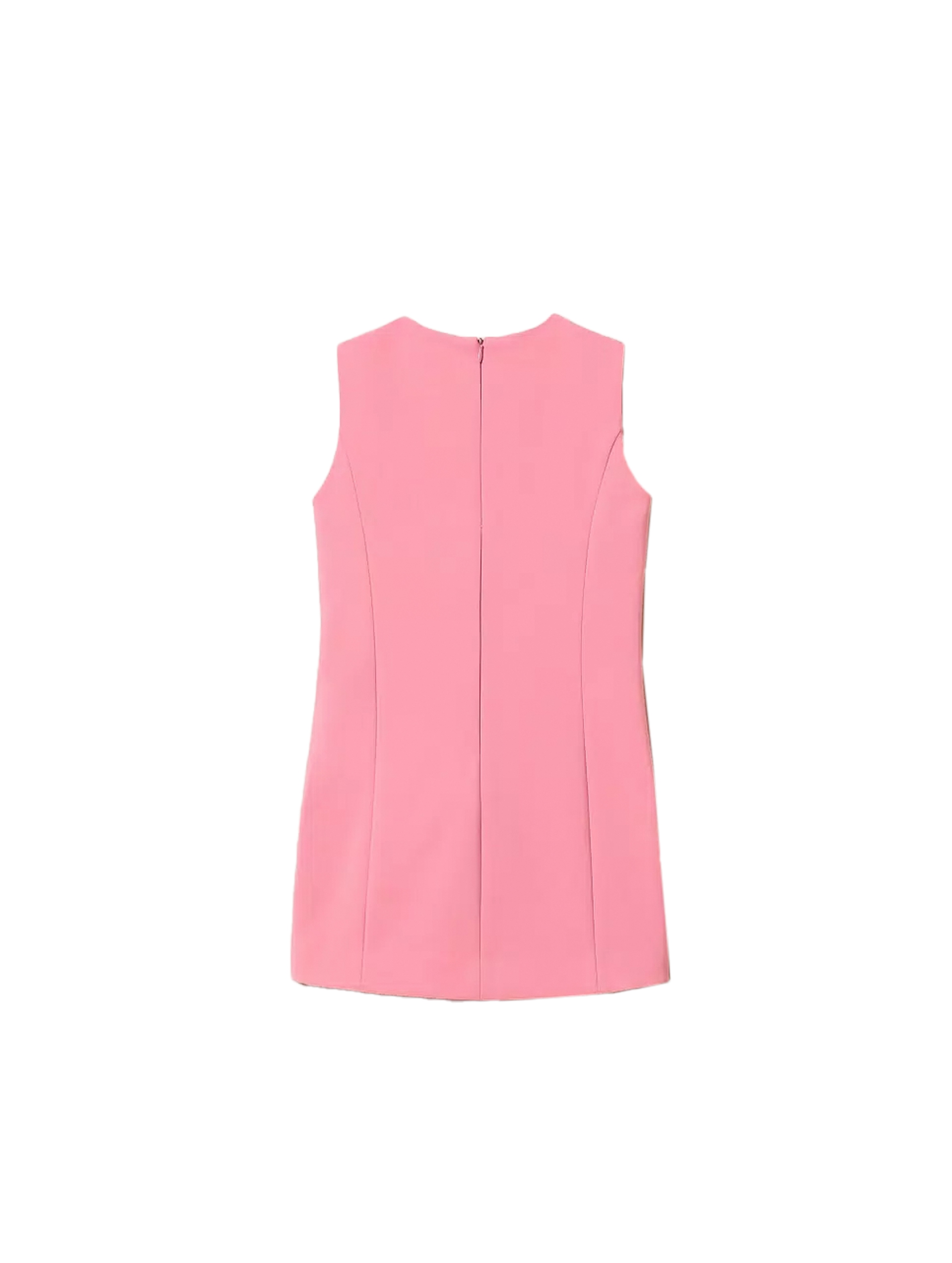 Abito corto smanicato realizzato in crepe, con particolare motivo effetto cintura e fiocco, con scollo rotondo, tagli fianchetto davanti e dietro, spacco al fondo, chiusura con zip sul retro, linea fitted e piccolo logo in metallo sul fiocco. Per un look elegante e bon ton. TWINSET