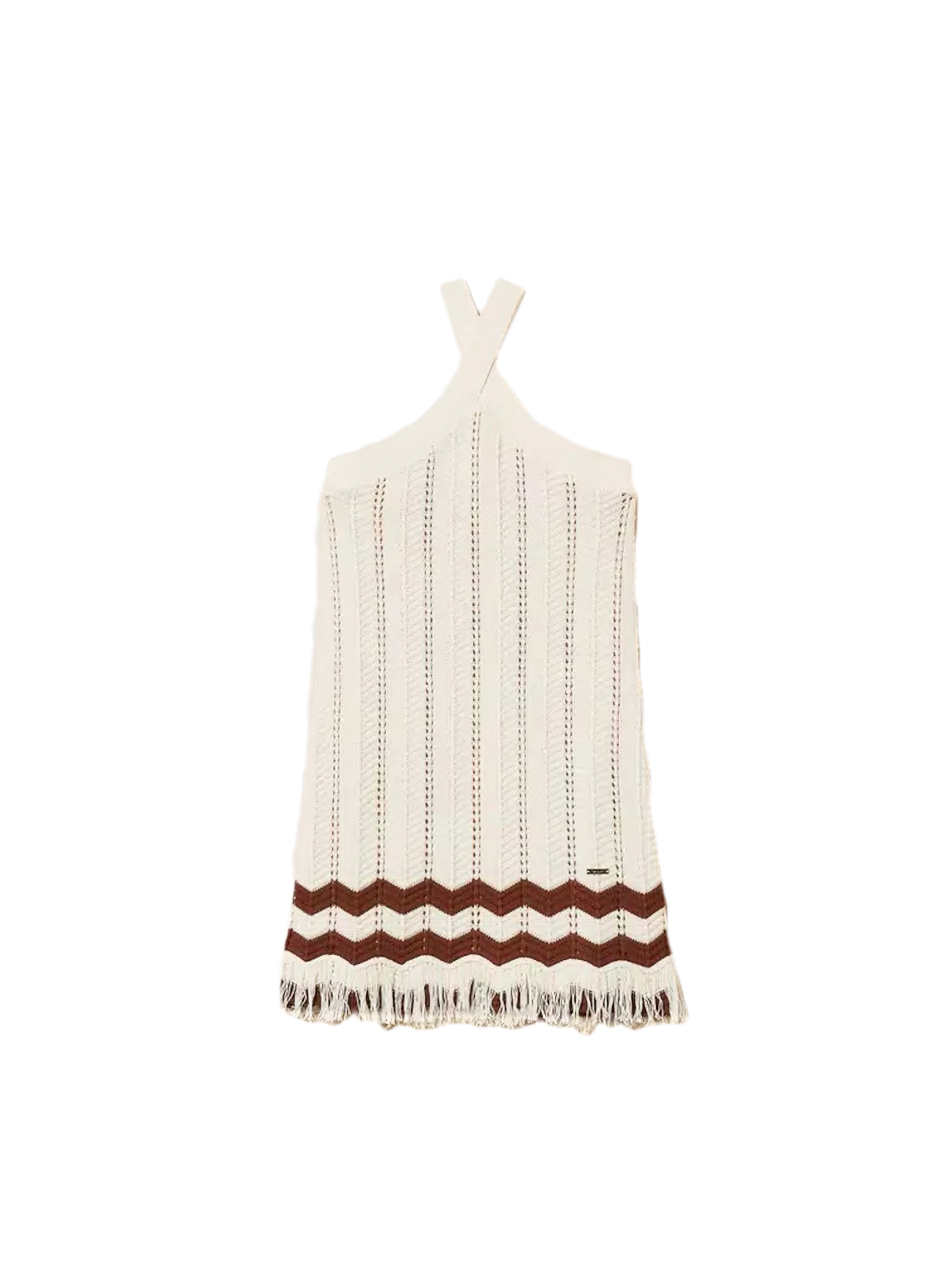 Abito corto in maglia di puro cotone, con motivo a coste punzonate, disegno zig-zag a contrasto sul fondo, dettaglio di frange sul fondo, con spalline incrociate al collo e placchetta con logo sul retro. Per un look fashion e chic. TWINSET