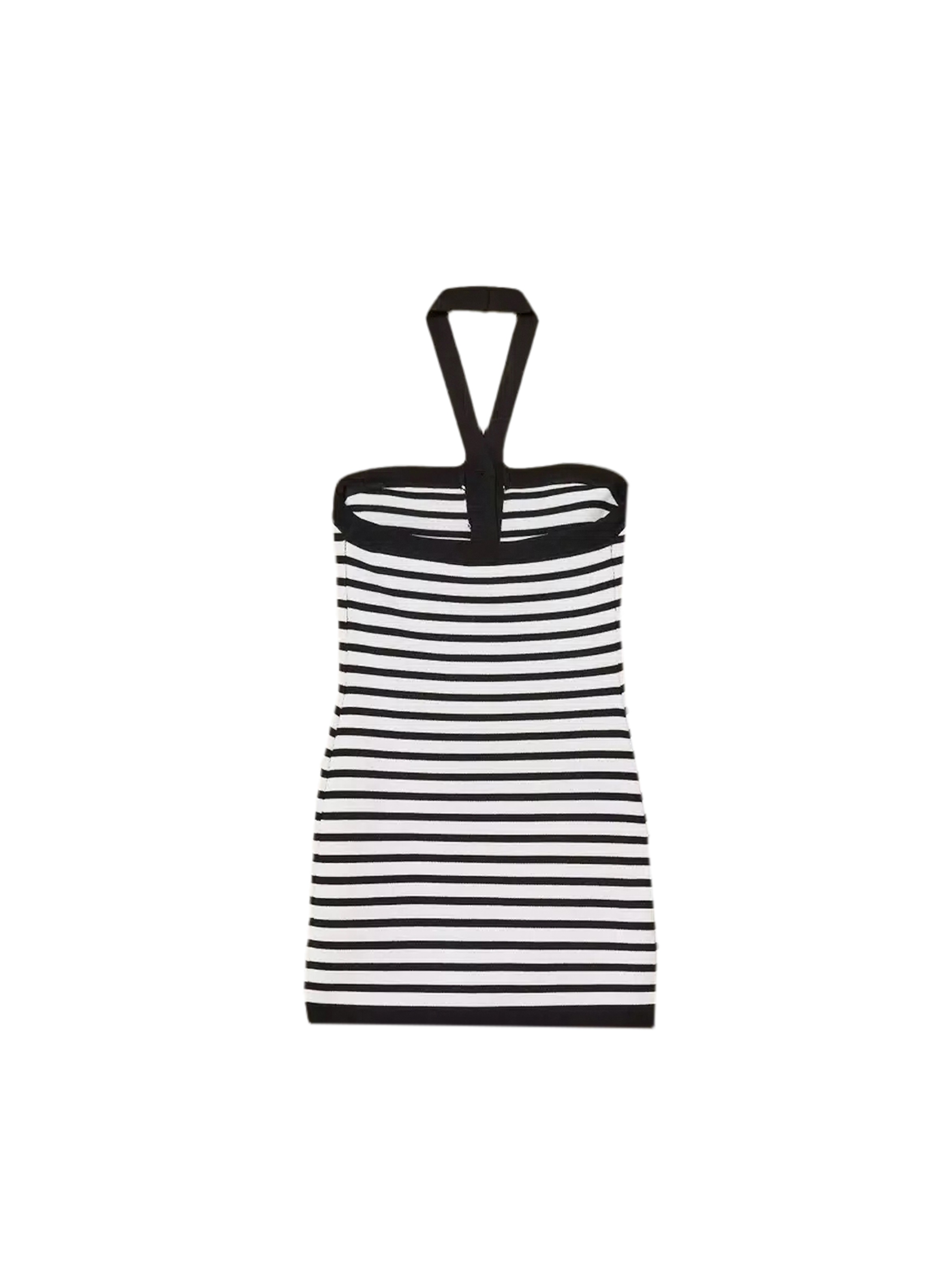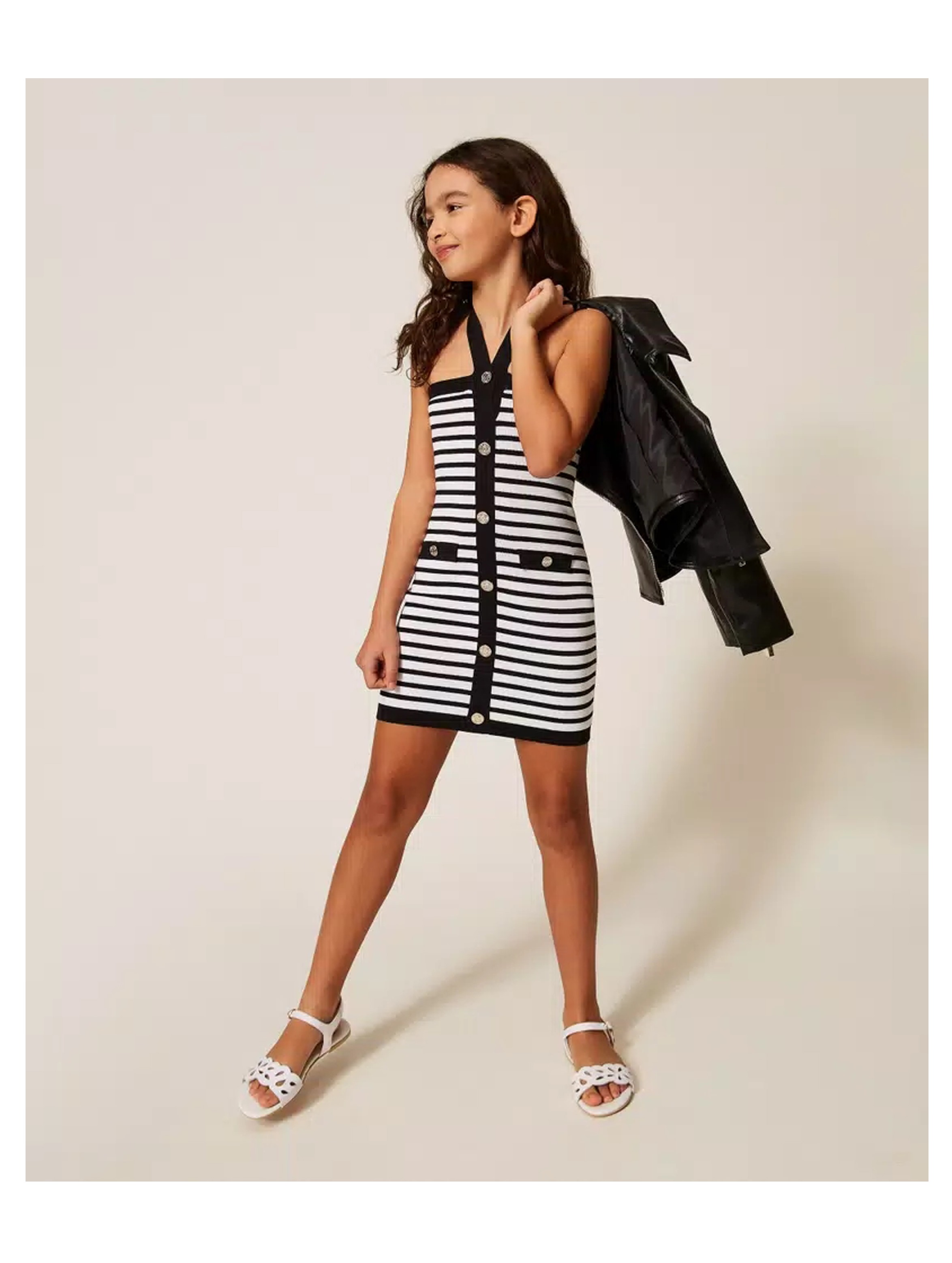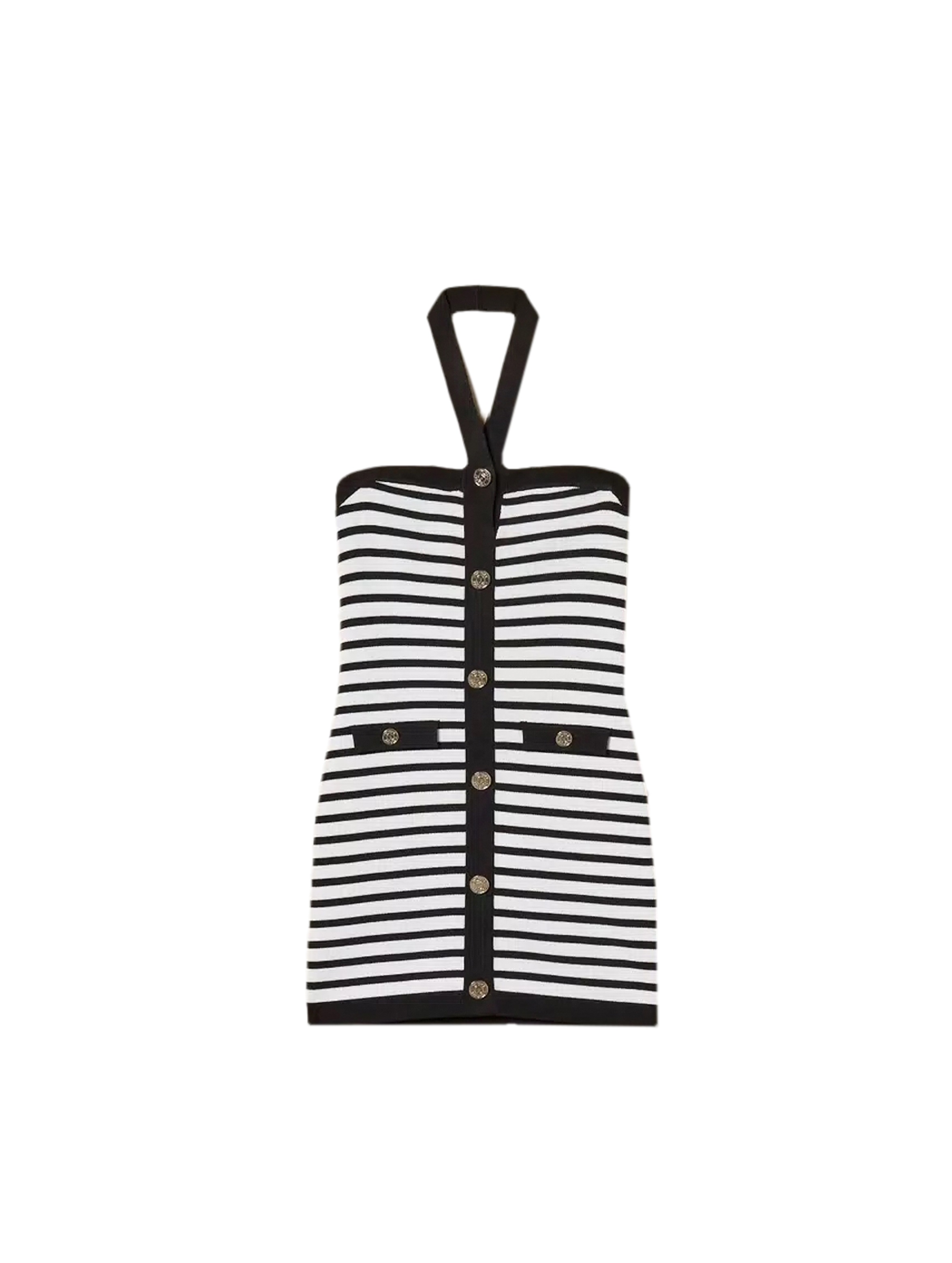Abito corto in maglia di viscosa rasata, dal design a righe, dalla vestibilità fitted, con spalle scoperte, spalline con incrocio al collo, con pattine con bottoni logati decorativi in metallo poste in vita e fila di bottoni al centro davanti. Per un look fashion e chic. TWINSET