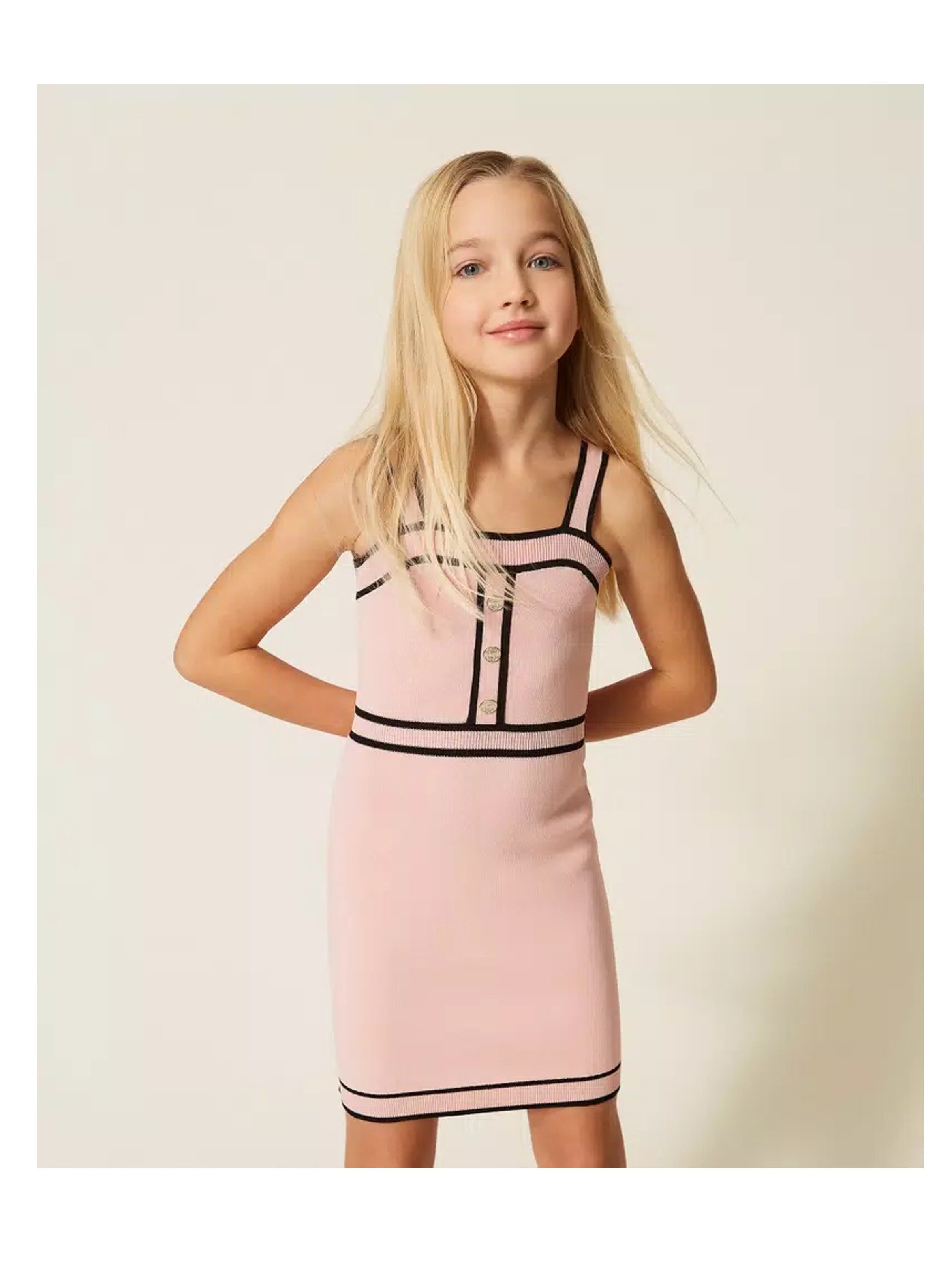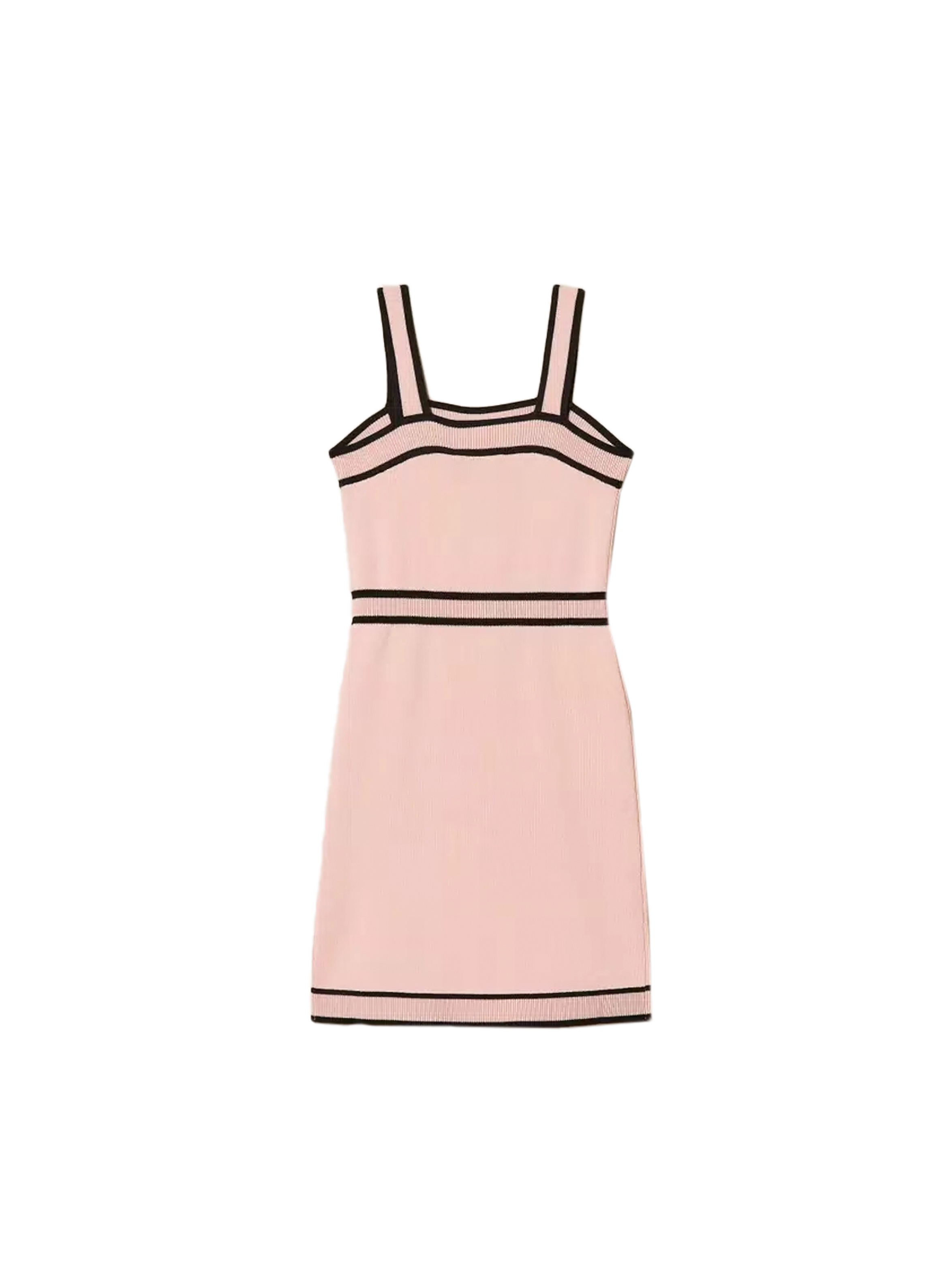 Abito corto in maglia di misto viscosa, con tessitura in punto piquet, dalla vestibilità fitted, con profili rifiniti in colore a contrasto, spalline sottili, bottoni decorativi logati sul corpetto e placchetta con logo in metallo sul retro. Per un look elegante e raffinato. TWINSET
