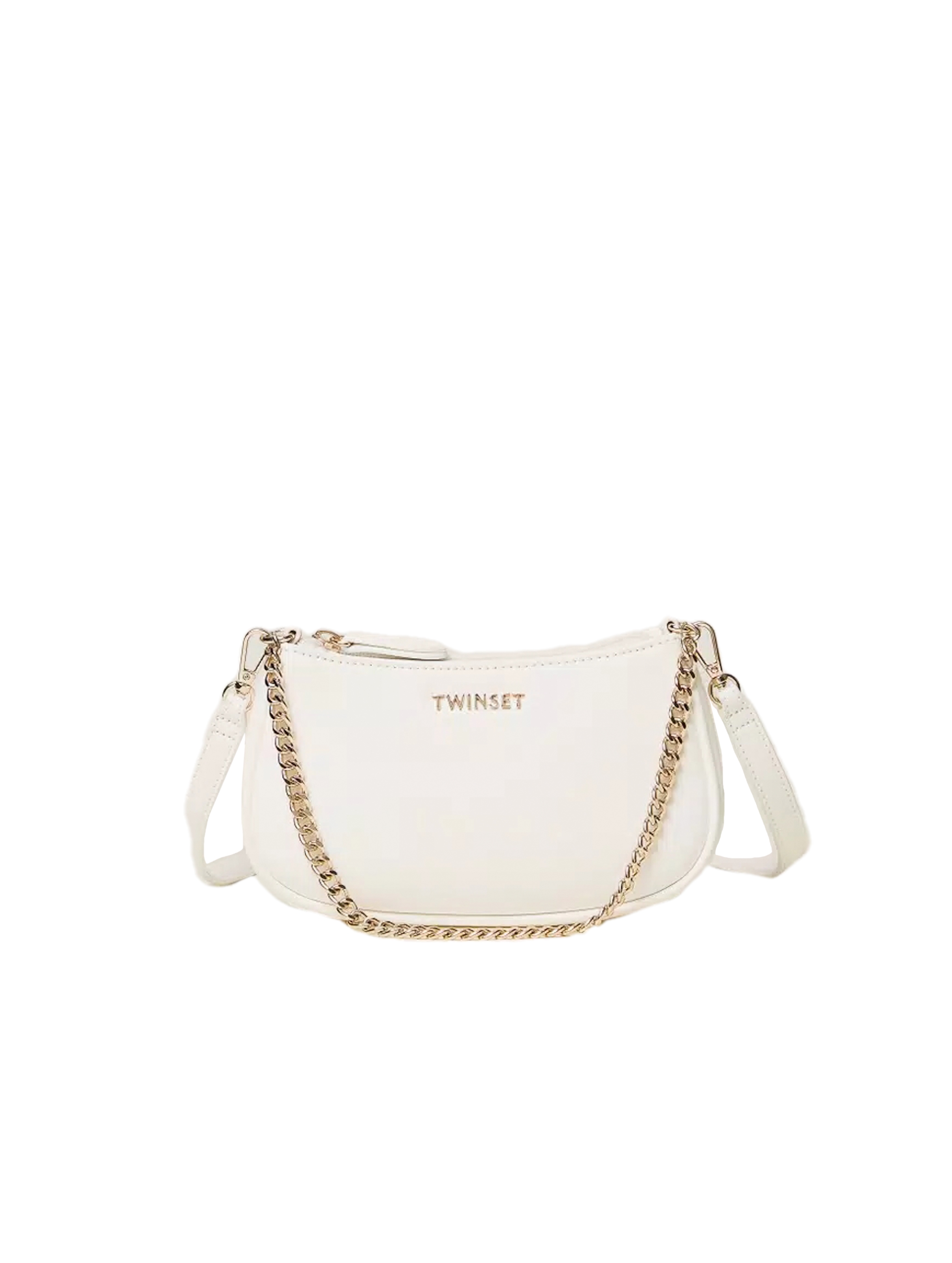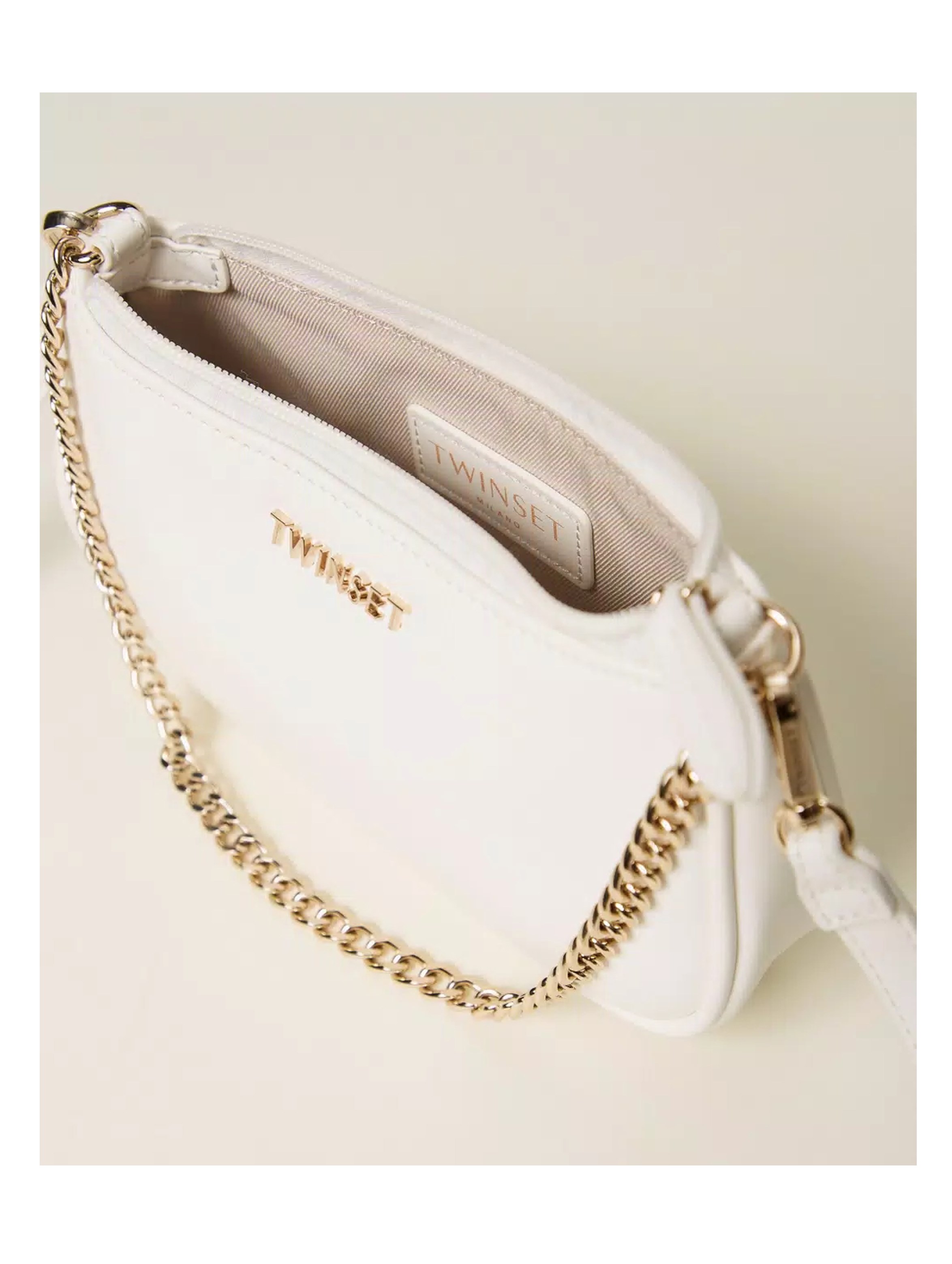 Borsa a tracolla effetto nappa di vitello liscio, con tracolla rimovibile per un indosso cross-body, catena per un indosso a spalla o a mano, chiusura con zip e logo lettering in metallo sul davanti. Per un look fashion e chic. TWINSET