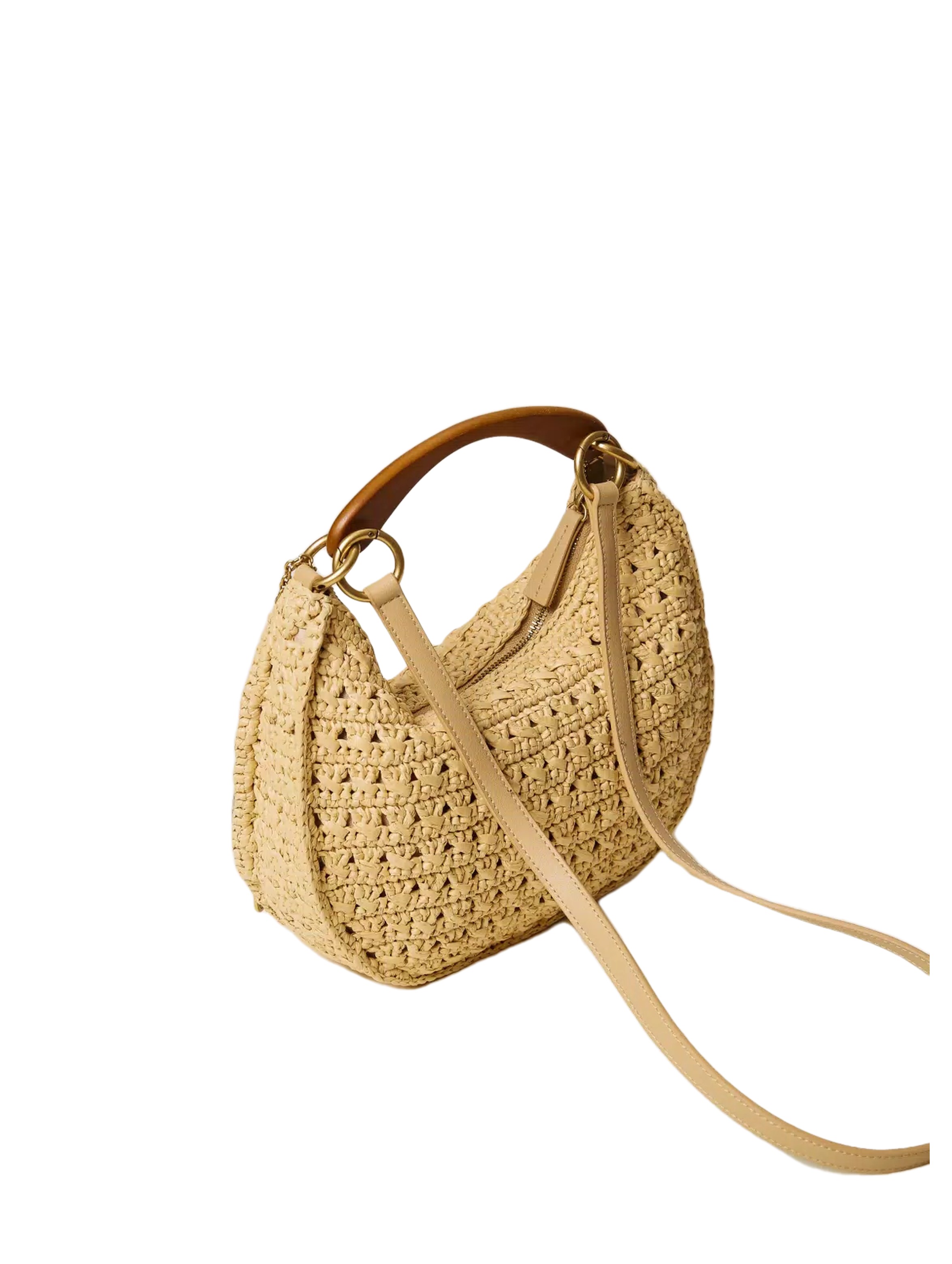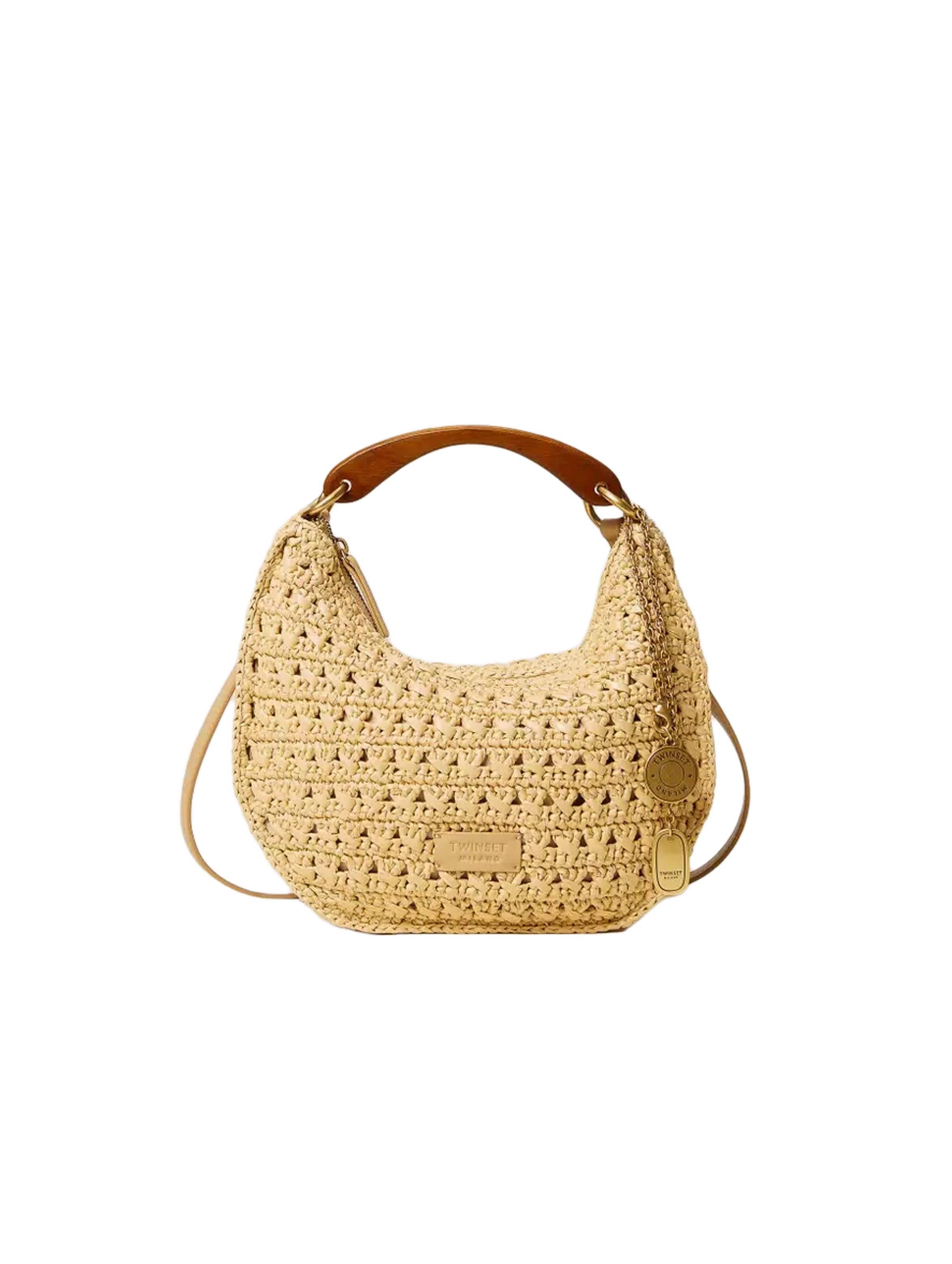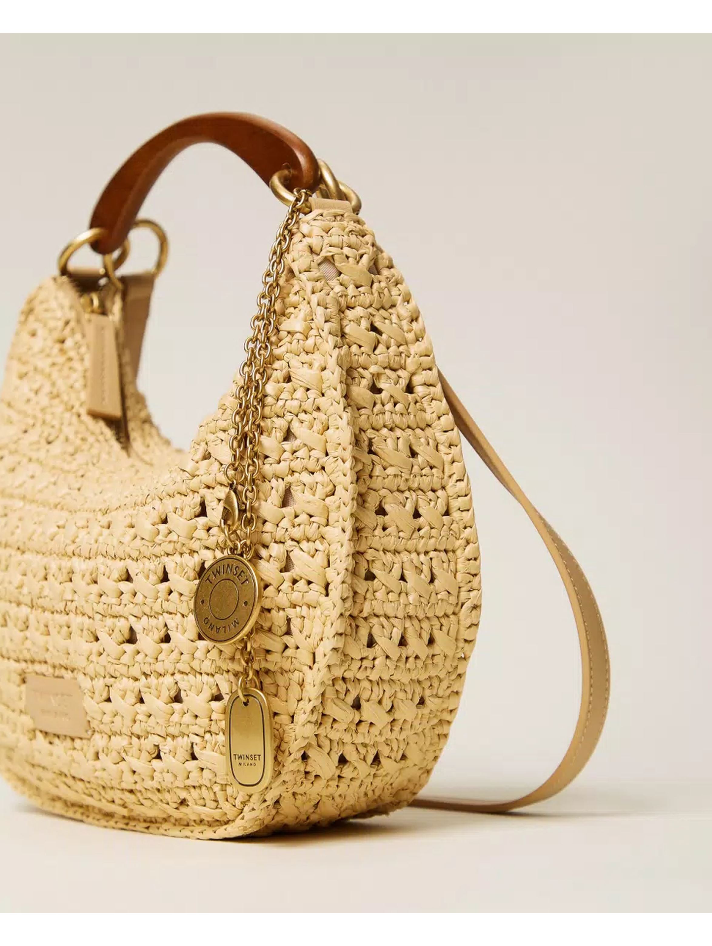 Borsa a mano in rafia di cellulosa intrecciata a mano, con chiusura con zip, interno foderato, manico rigido in legno, tracolla cross-body rimovibile effetto vitello, etichetta cucita con logo stampato a caldo e charm con placchette logate. Per un look trendy e chic. TWINSET