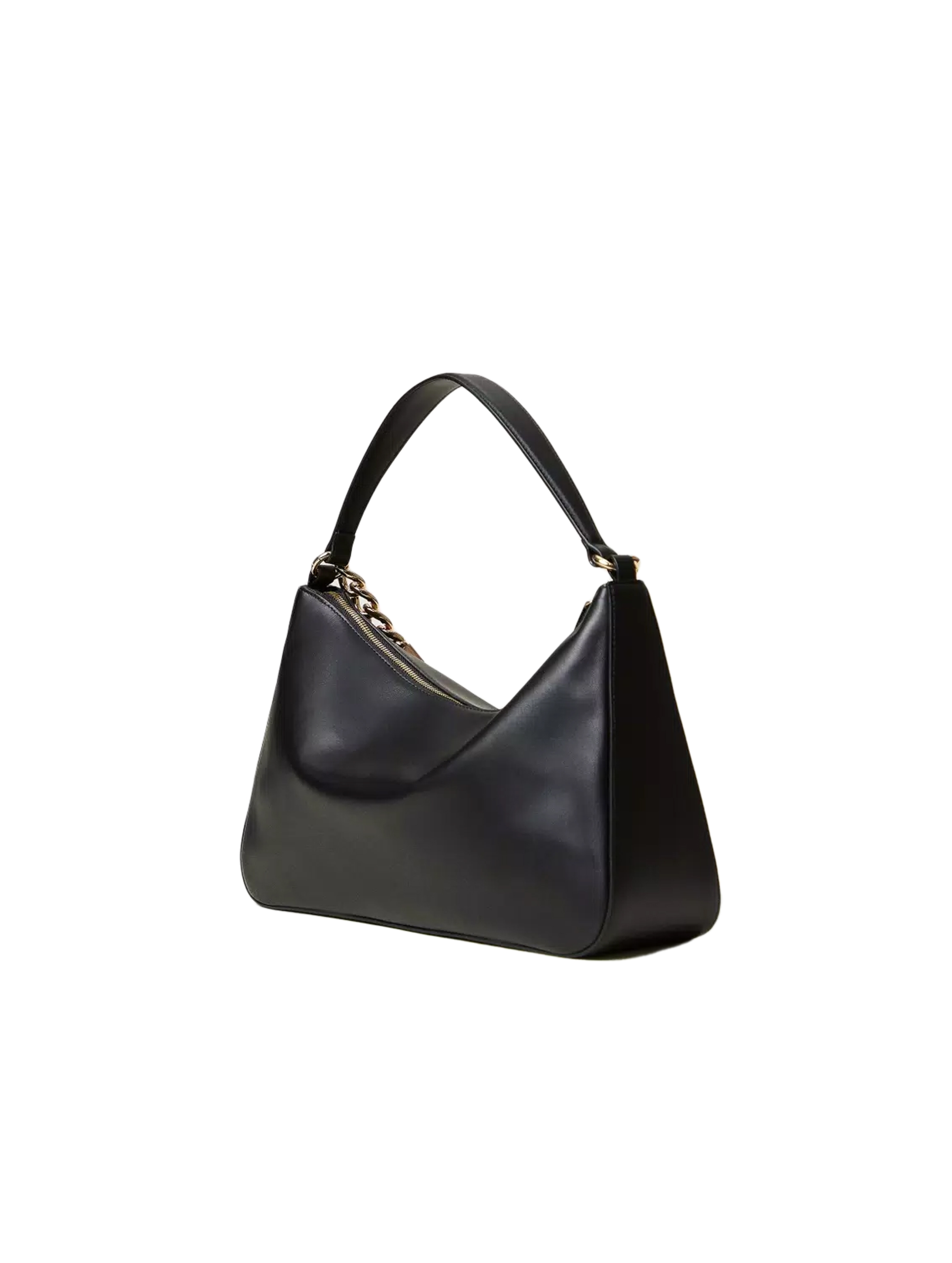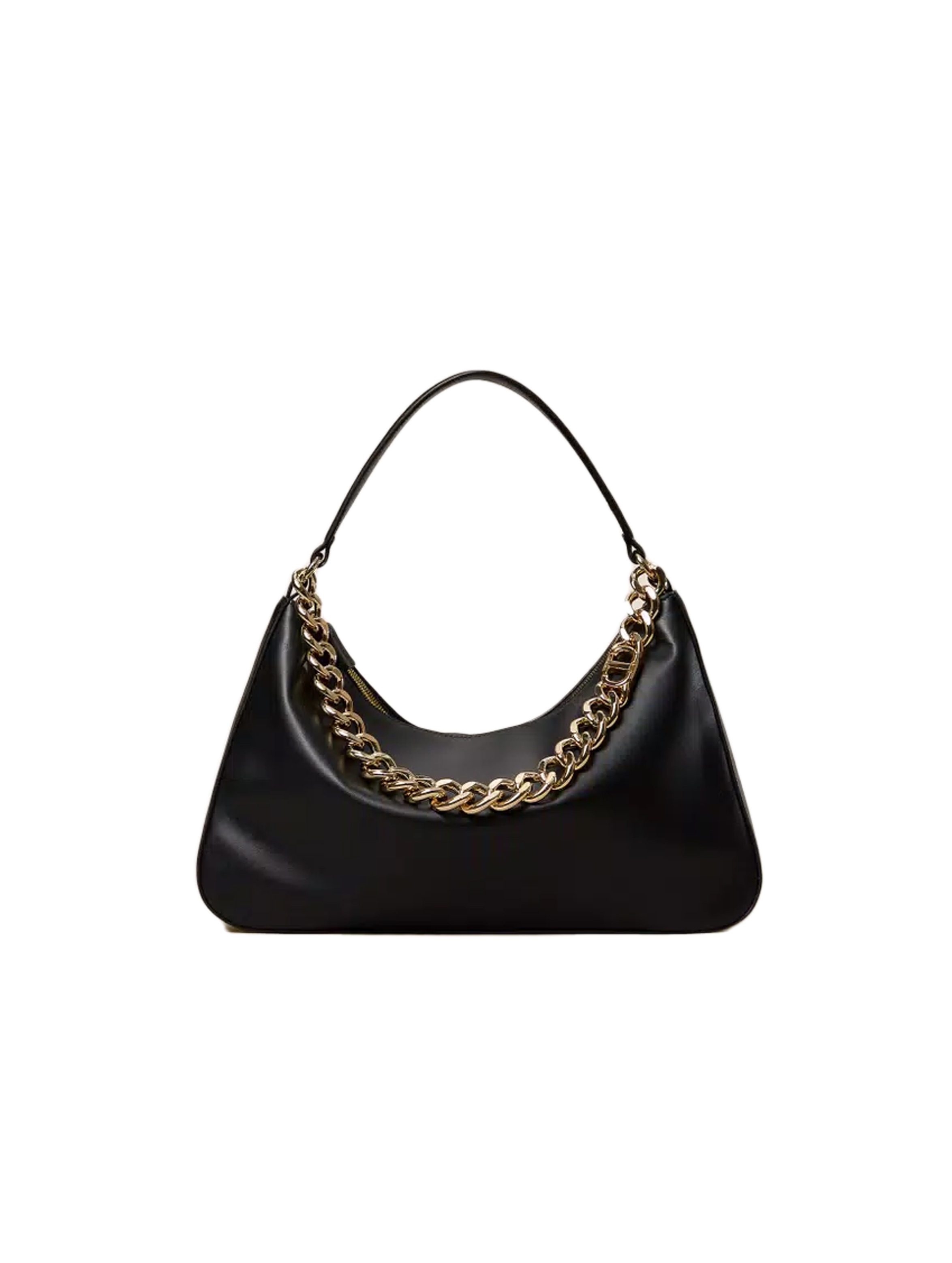 Borsa a spalla modello hobo, realizzata in pelle di vitello liscio pieno fiore con trattamento anti goccia e antigraffio. Il corpo è realizzato a colonna, con logo impresso a caldo, e foderato con un twill in misto cotone. Ha due manici staccabili, da indossare simultaneamente o separati per diverse interpretazioni di styling: uno in pelle sagomato e imbottito, l'altro è una catena in lega leggera in galvanica oro con l'Oval T inserito tra le maglie. Per un look dinamico e chic. TWINSET
