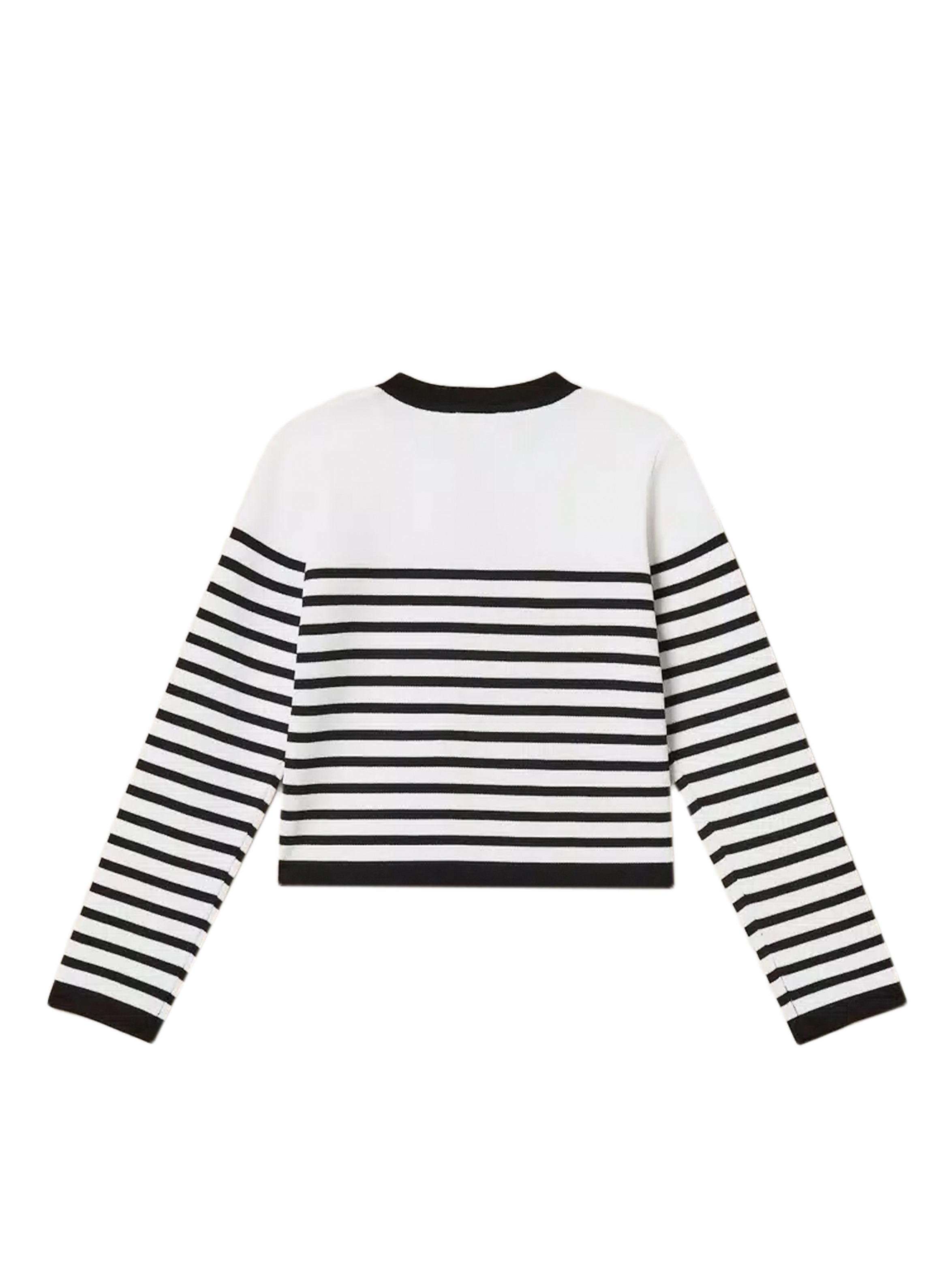 Cardigan in maglia di viscosa rasata, dal design a righe, dalla linea dritta, con maniche lunghe, scollo rotondo, con pattine con bottoni logati decorativi in metallo poste in vita e apertura con bottoni al centro davanti. Per un look fashion e chic. TWINSET