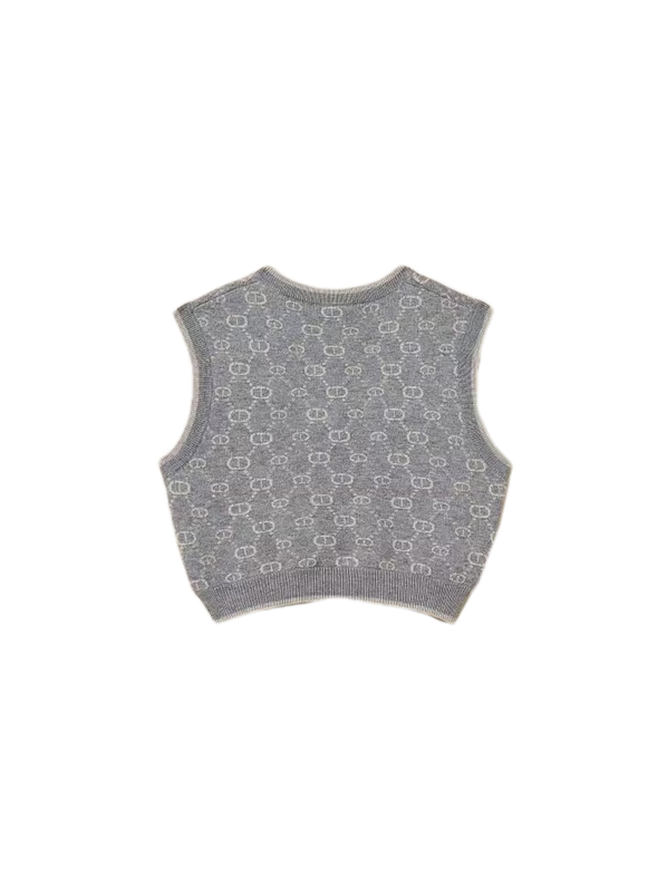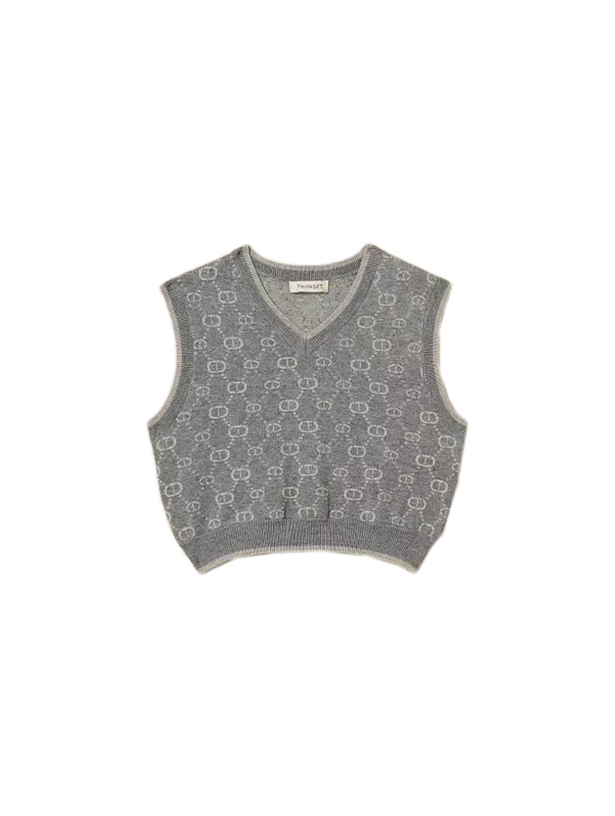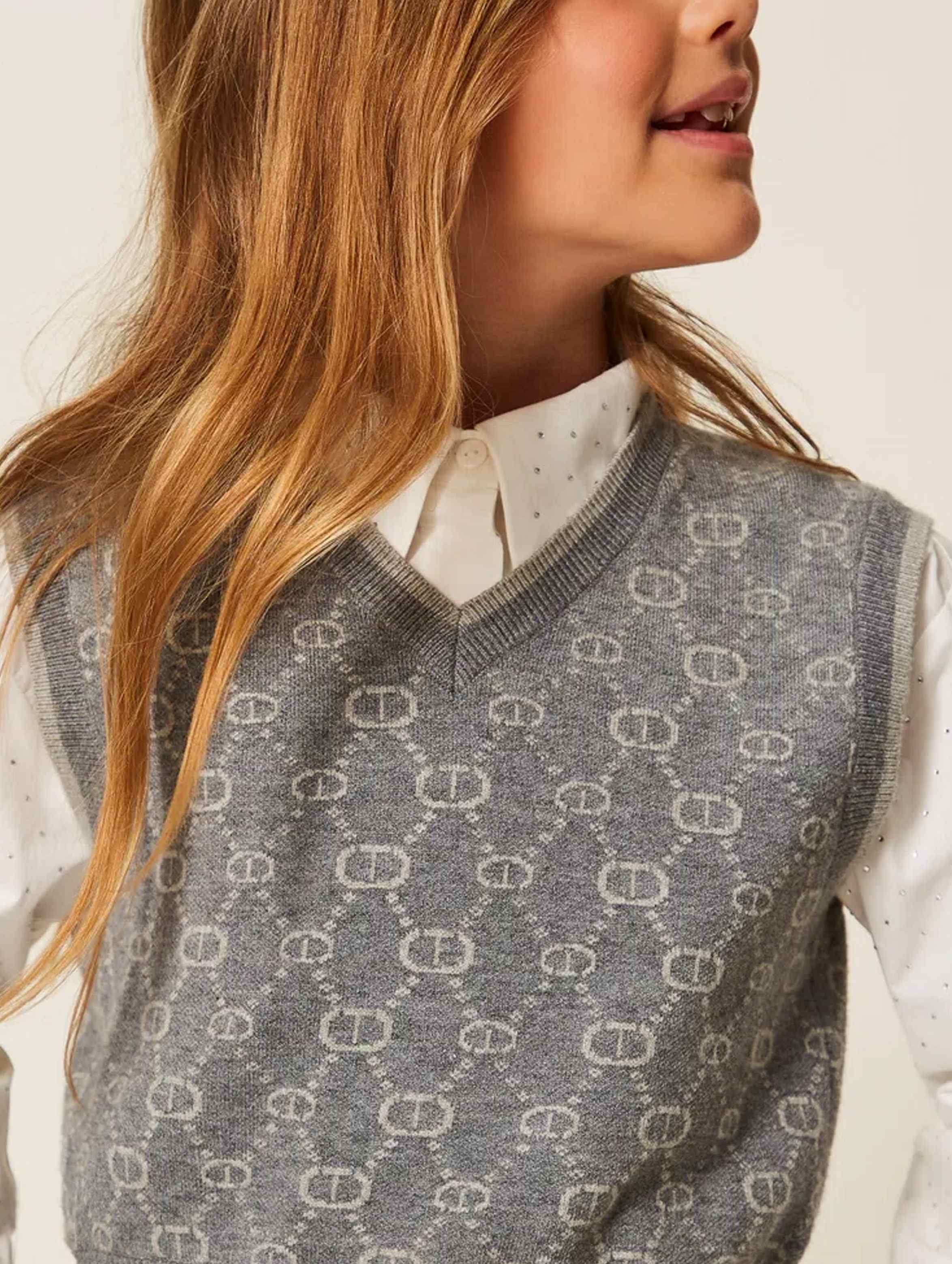 Gilet in maglia di misto viscosa, con logo Oval T jacquard all over, con scollo a V, profili a tinta unita, fondo a costine e dalla linea dritta. Per un look collegiale e classy chic. TWINSET
