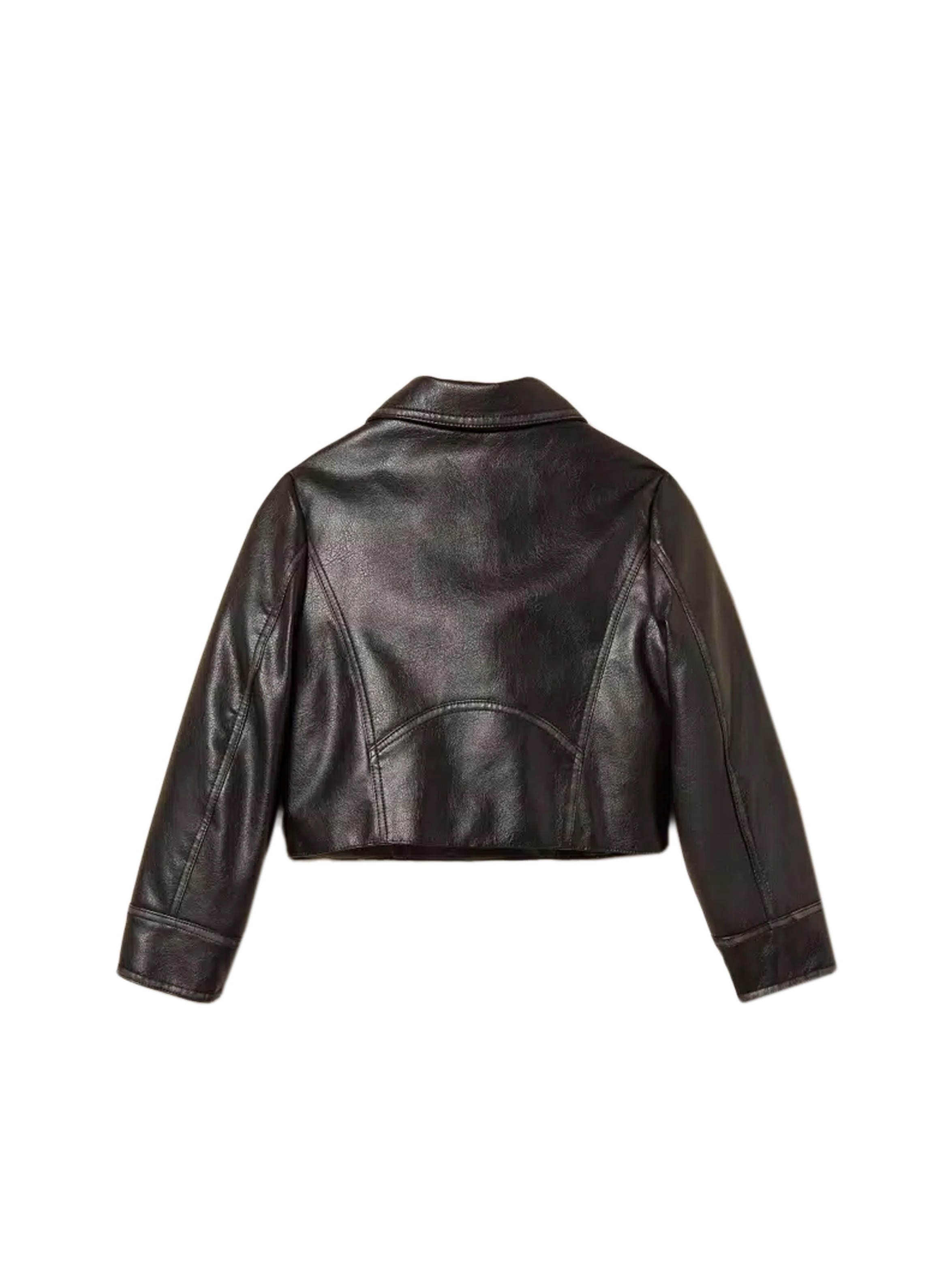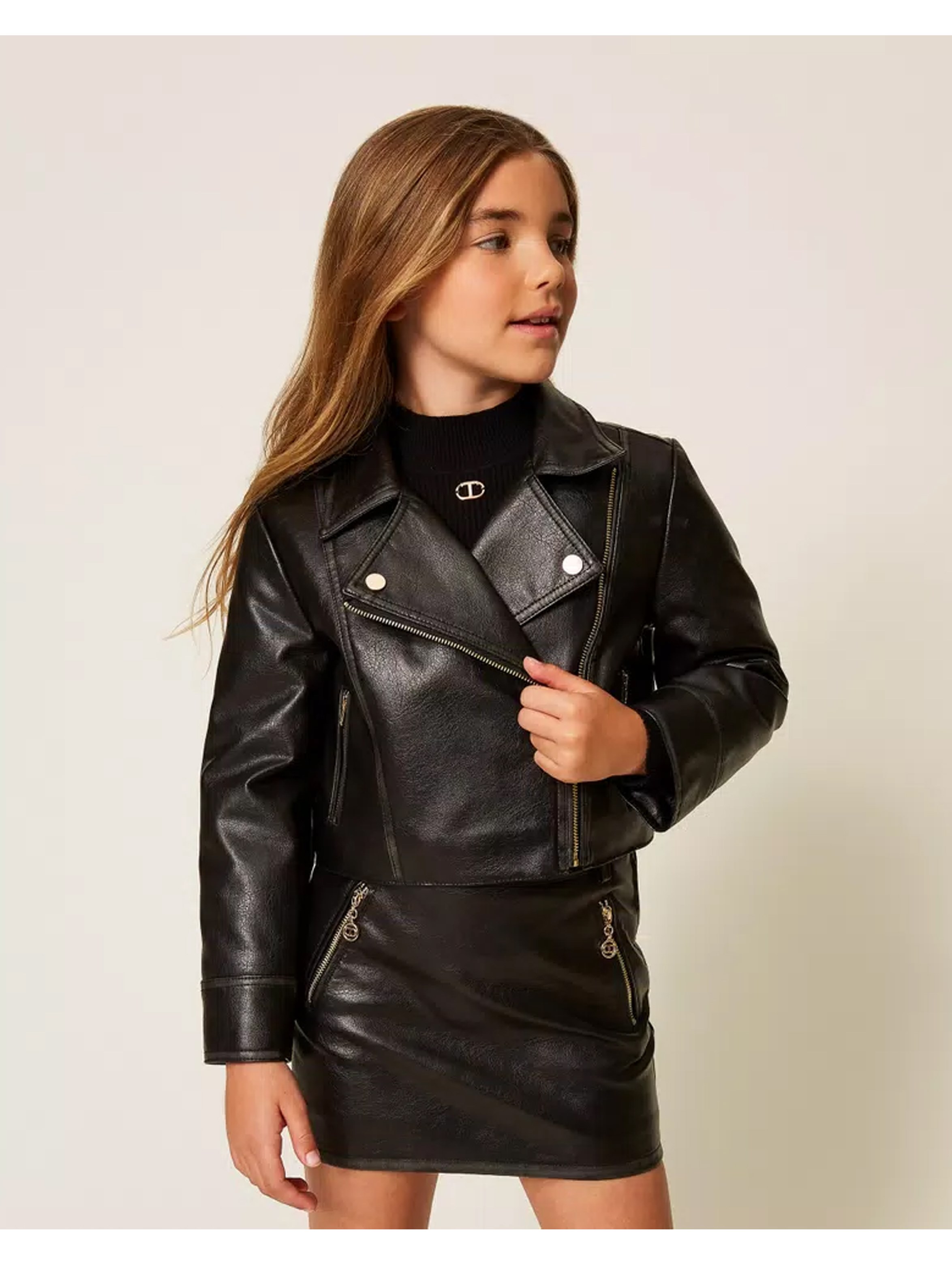Giacca chiodo da bambina effetto pelle, con leggera imbottitura, colletto a camicia, chiusura con zip in metallo asimmetrica, maniche lunghe, tasche inserite con zip, fodera in cotone, dalla linea dritta e tirazip con logo. Per un look rock e chic. TWINSET