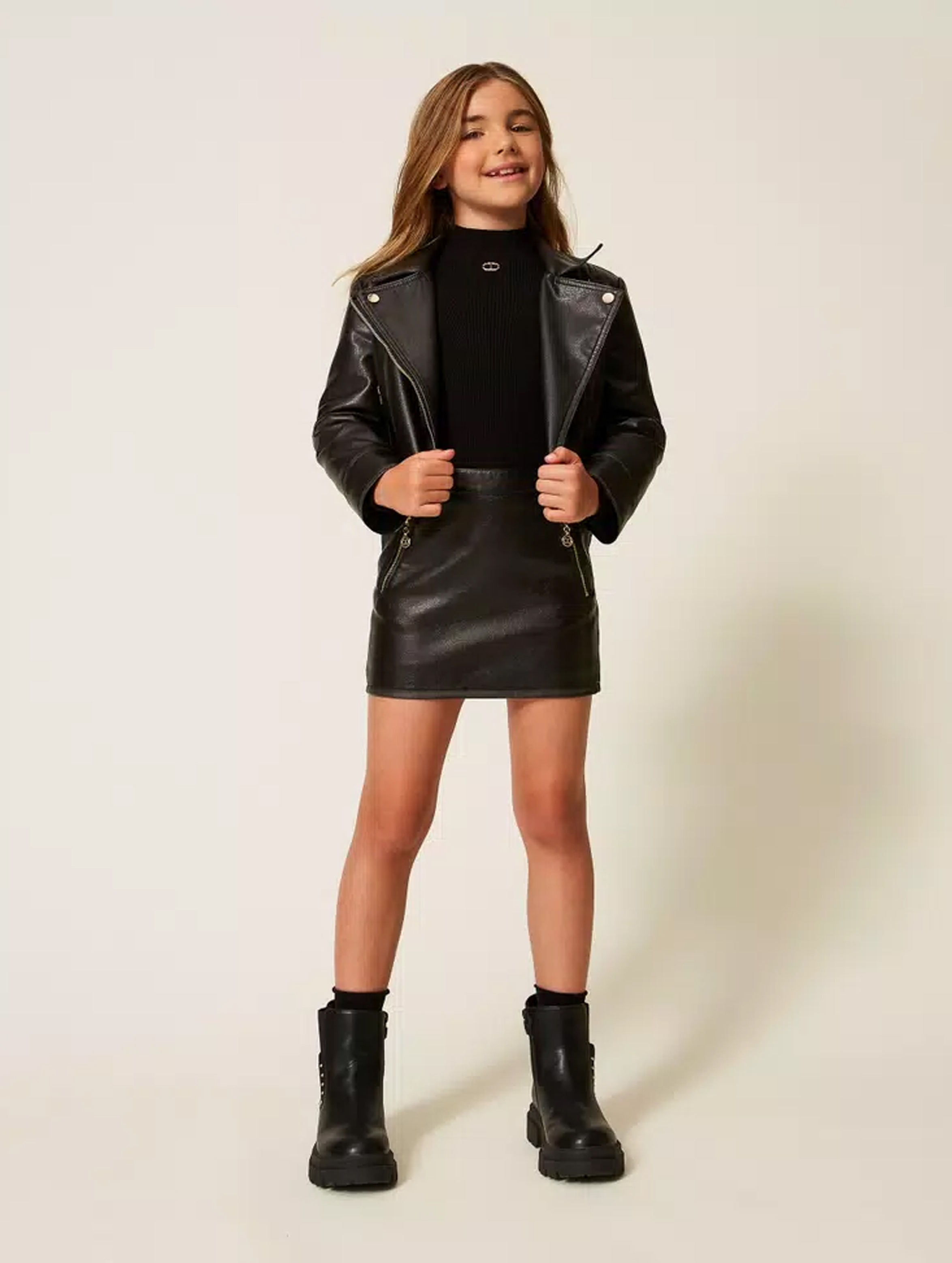 Minigonna effetto pelle, con passanti in vita, chiusura con zip al fianco, tasche inserite con zip in metallo, fodera in cotone, linea dritta e tirazip logati. Per un look rock e chic. TWINSET