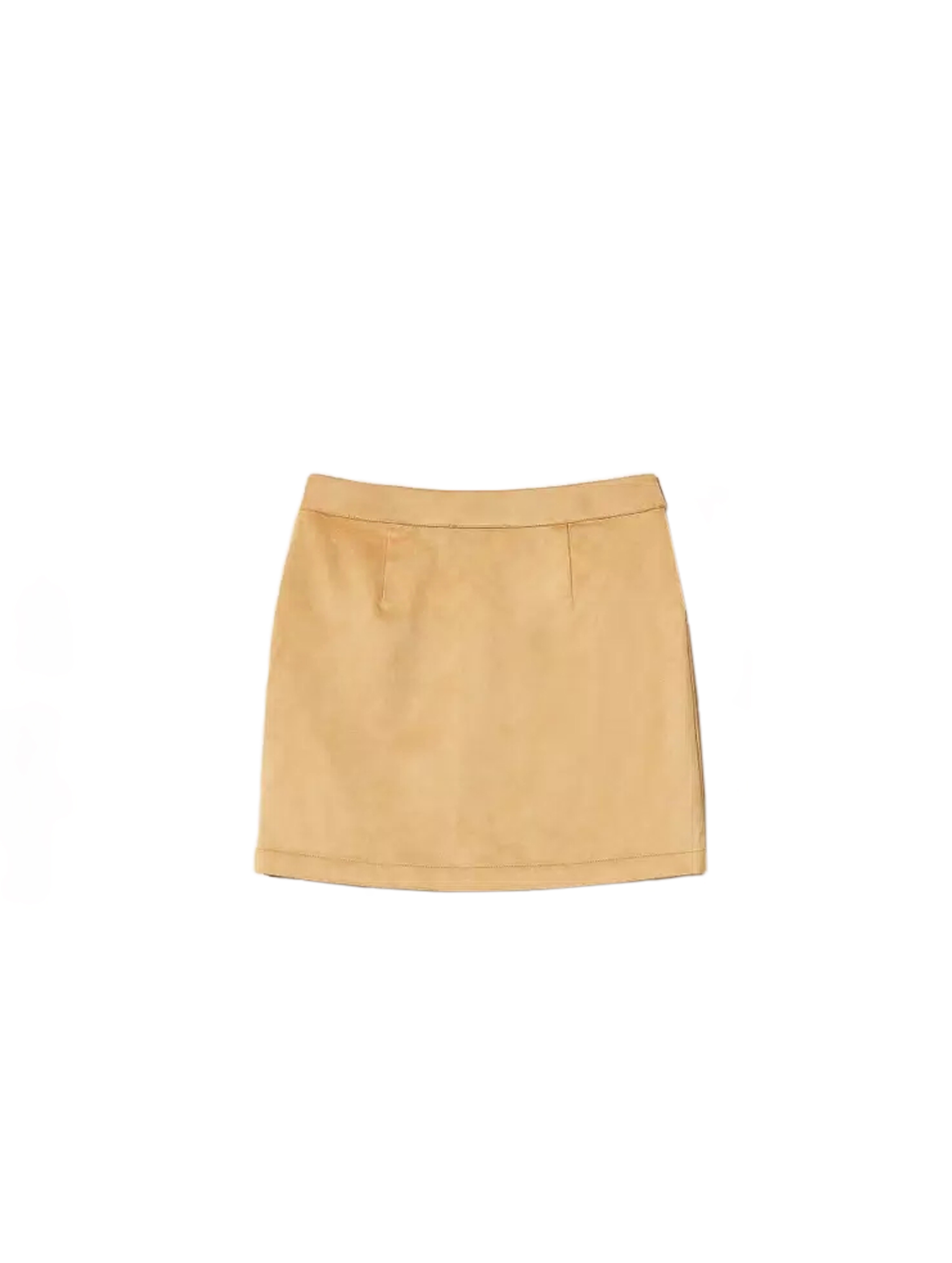 Gonna corta realizzata in tessuto effetto scamosciato, con frange che rifiniscono il taglio baschina, chiusura con zip invisibile al fianco, fodera, vestibilità dritta e placchetta con logo in metallo sul fianco. Per un look trendy e fashion. TWINSET