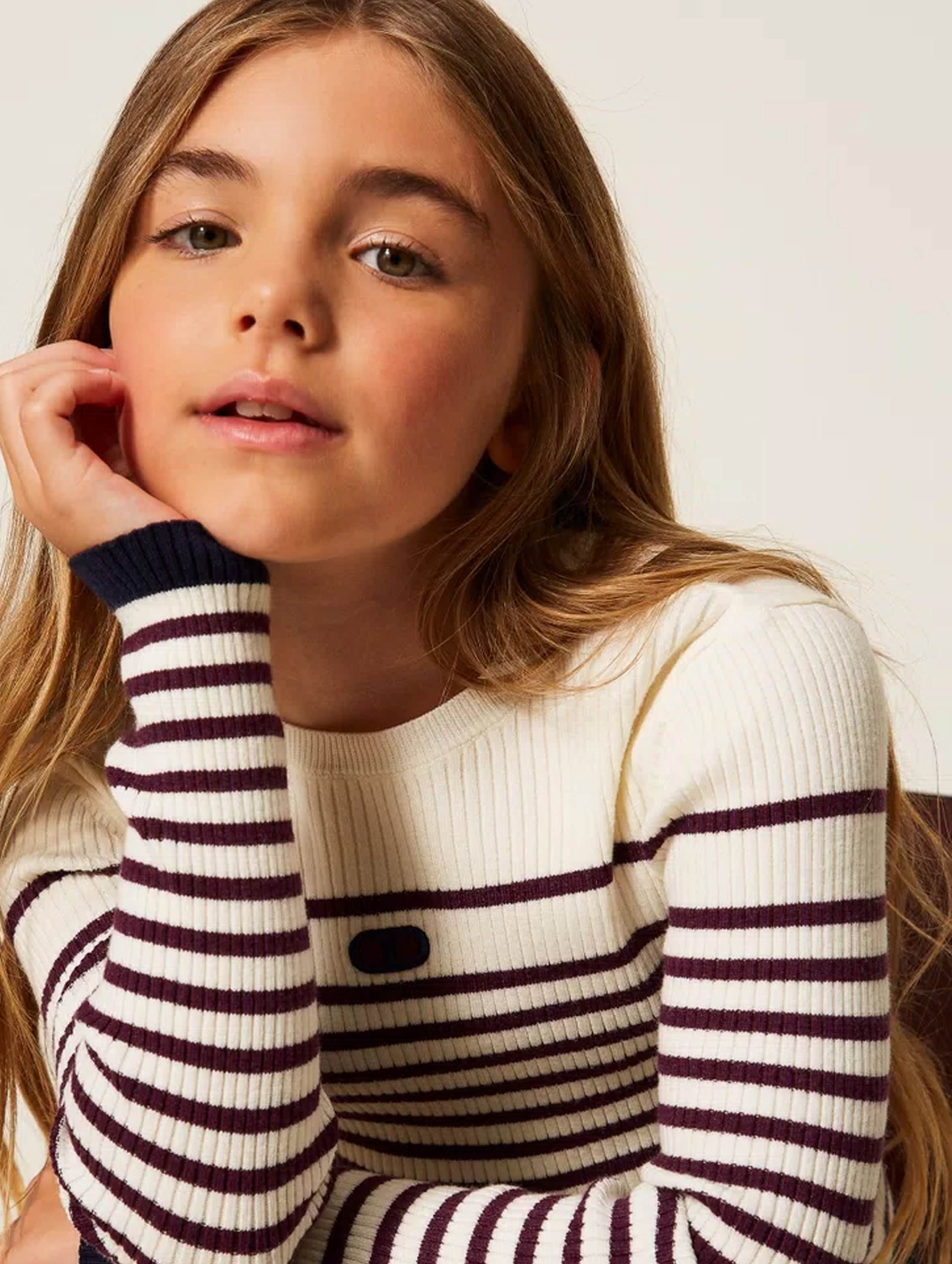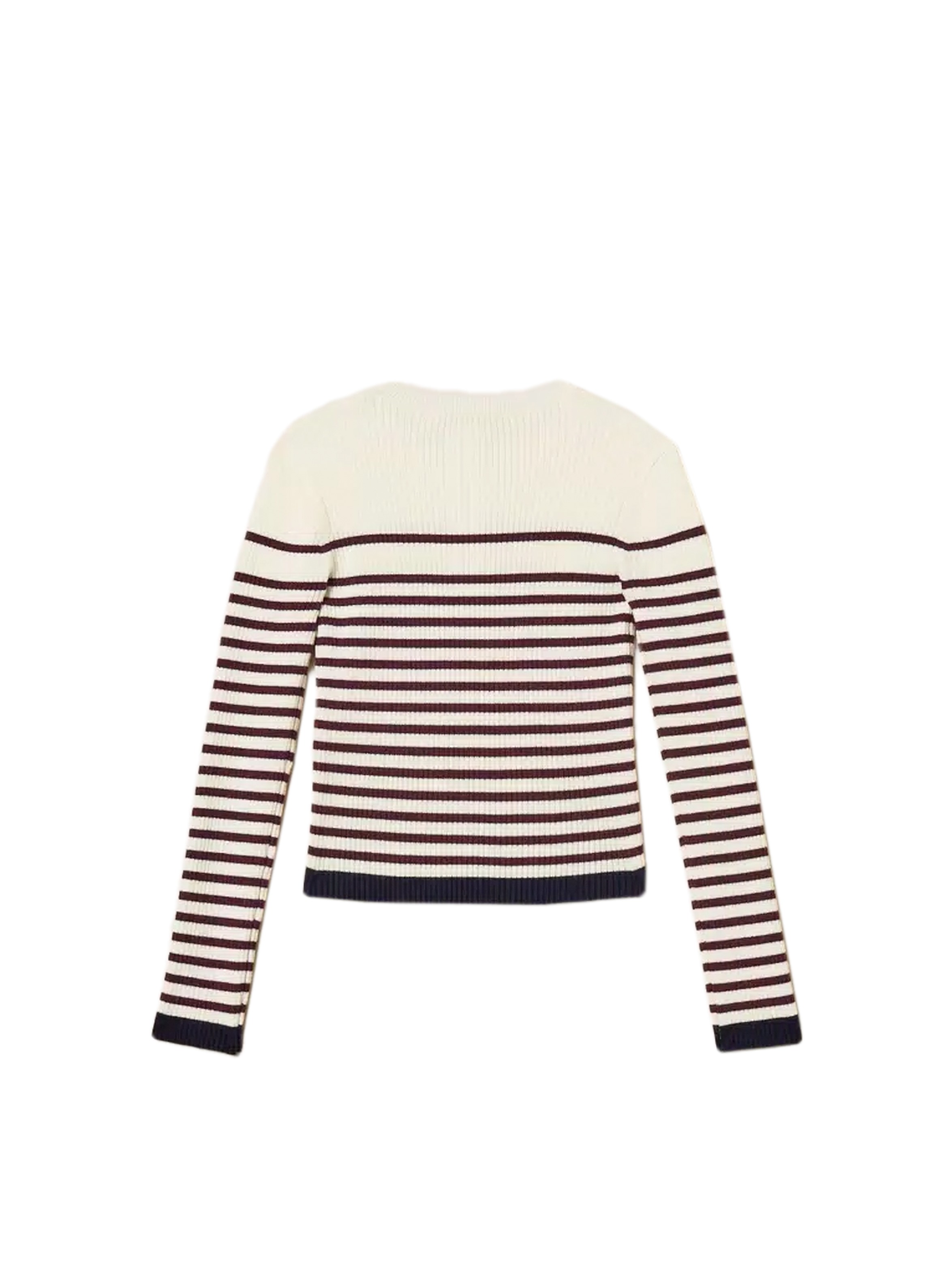 Maglia a maniche lunghe in misto viscosa, modello a lupetto, a righe con lavorazione a costine, con fondi a contrasto, linea fitted e ricamo con logo Oval T al centro. Per un look casual e trendy. TWINSET