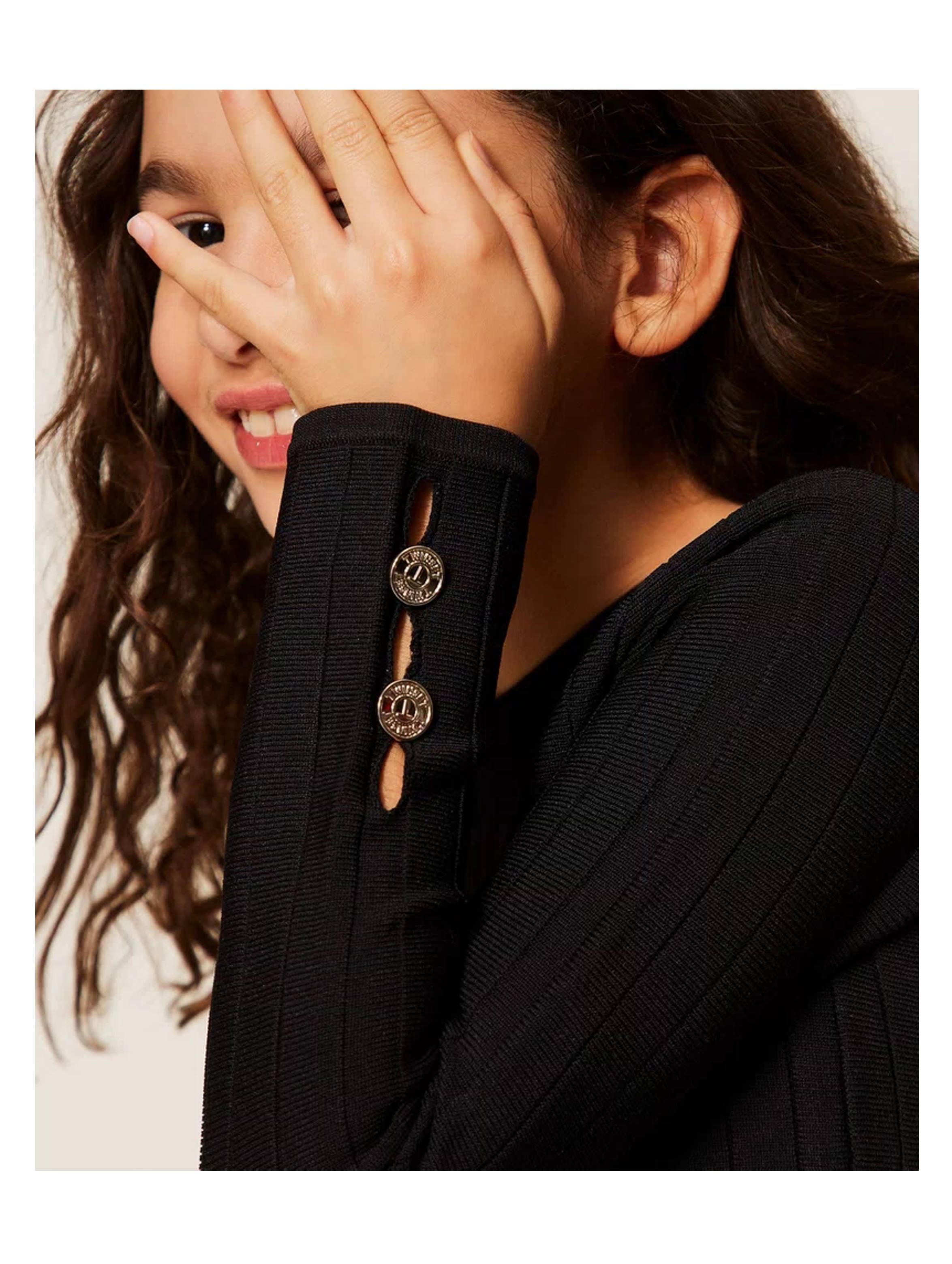 Maglia a maniche lunghe in misto viscosa, con scollo rotondo, a tinta unita, con maniche traforate e bottoni decorativi logati e placchetta con logo in metallo sul retro. Per un look trendy e chic. TWINSET