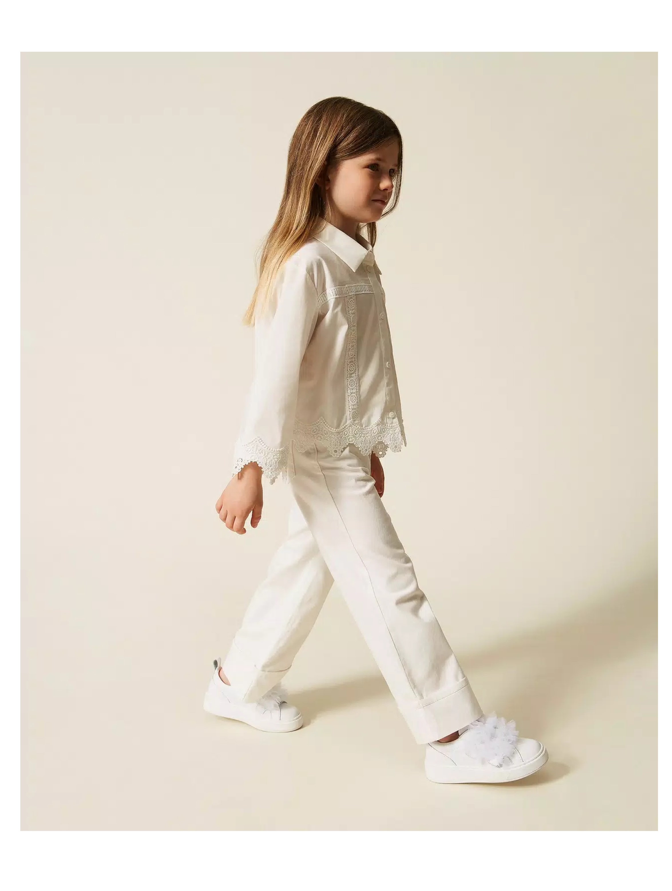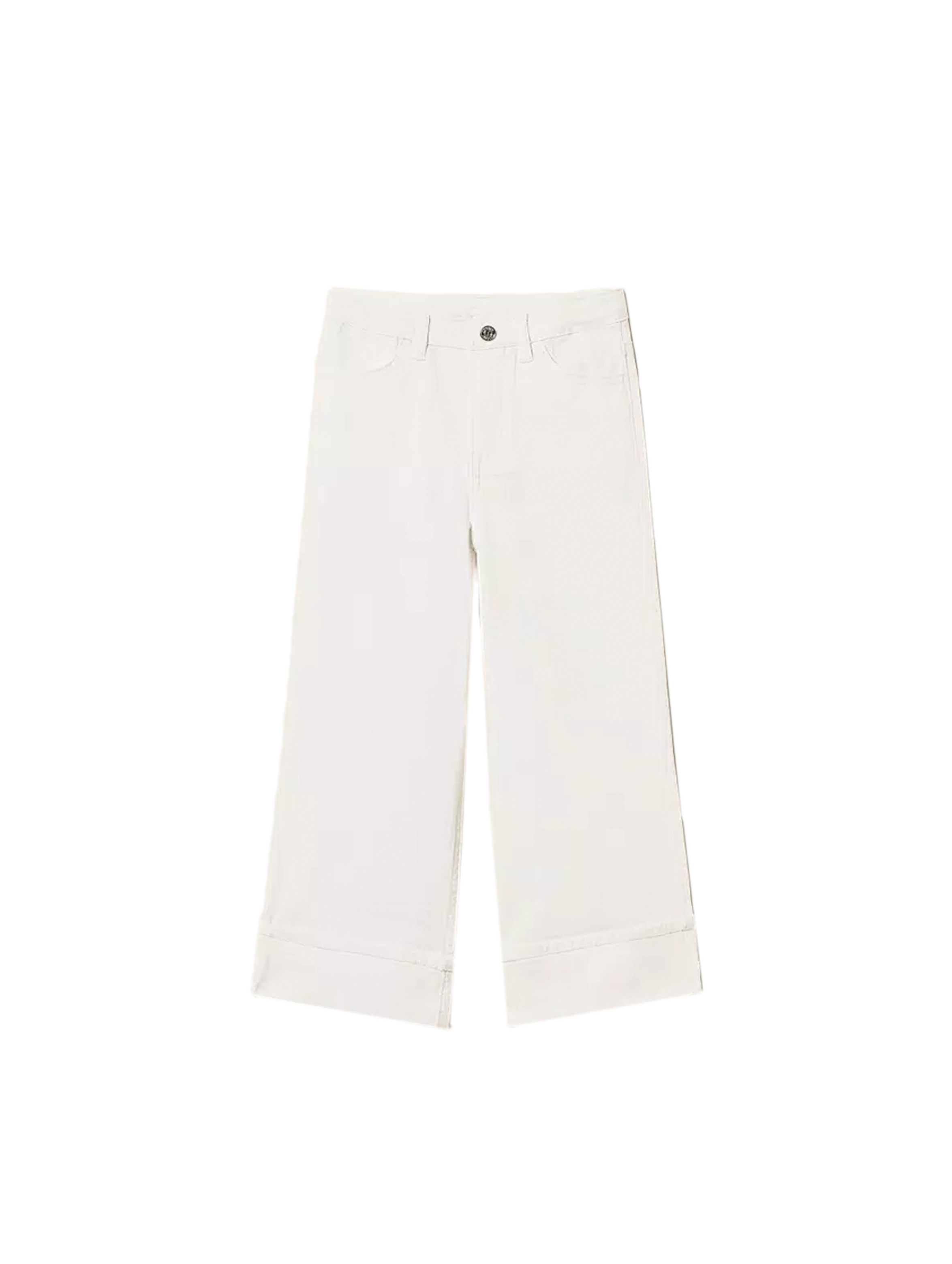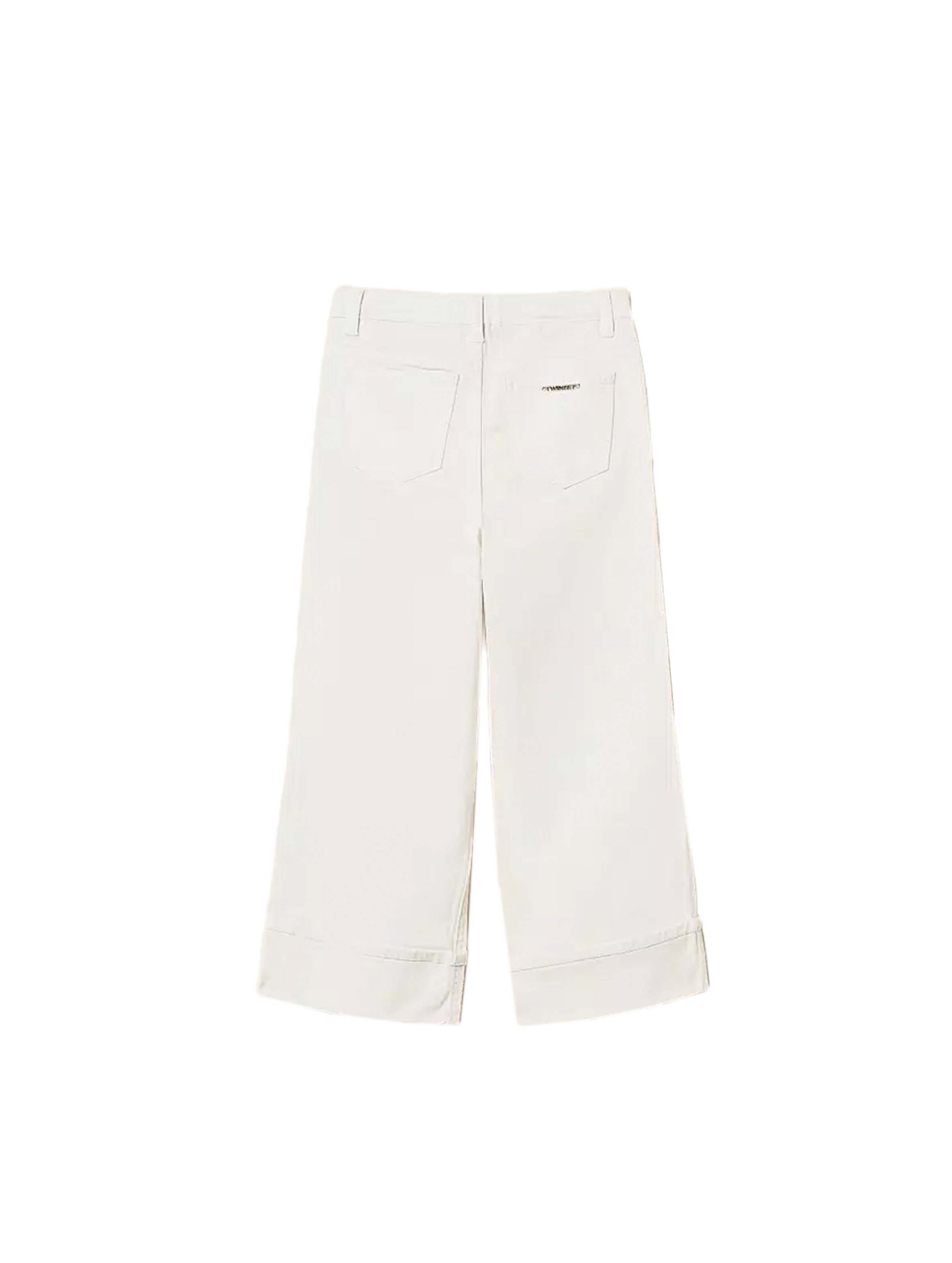 Pantaloni modello wide leg in cotone, a tinta unita, 5 tasche, con passanti in vita, chiusura con zip nascosta e bottone logato centrale, piccolo logo sul retro e risvolto cucito al fondo. Per look trendy e fashion. TWINSET