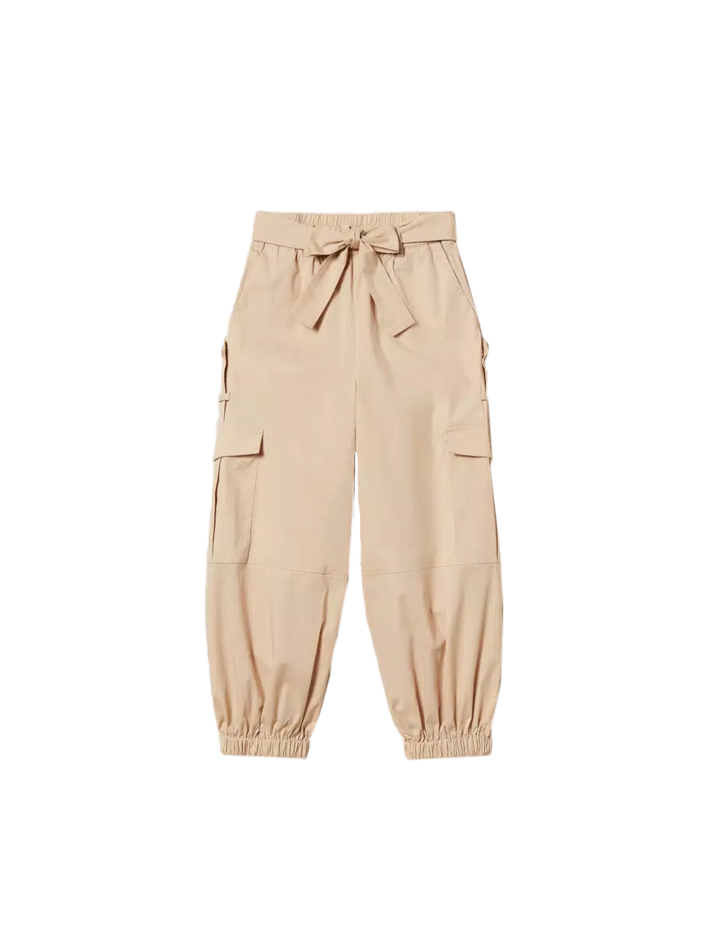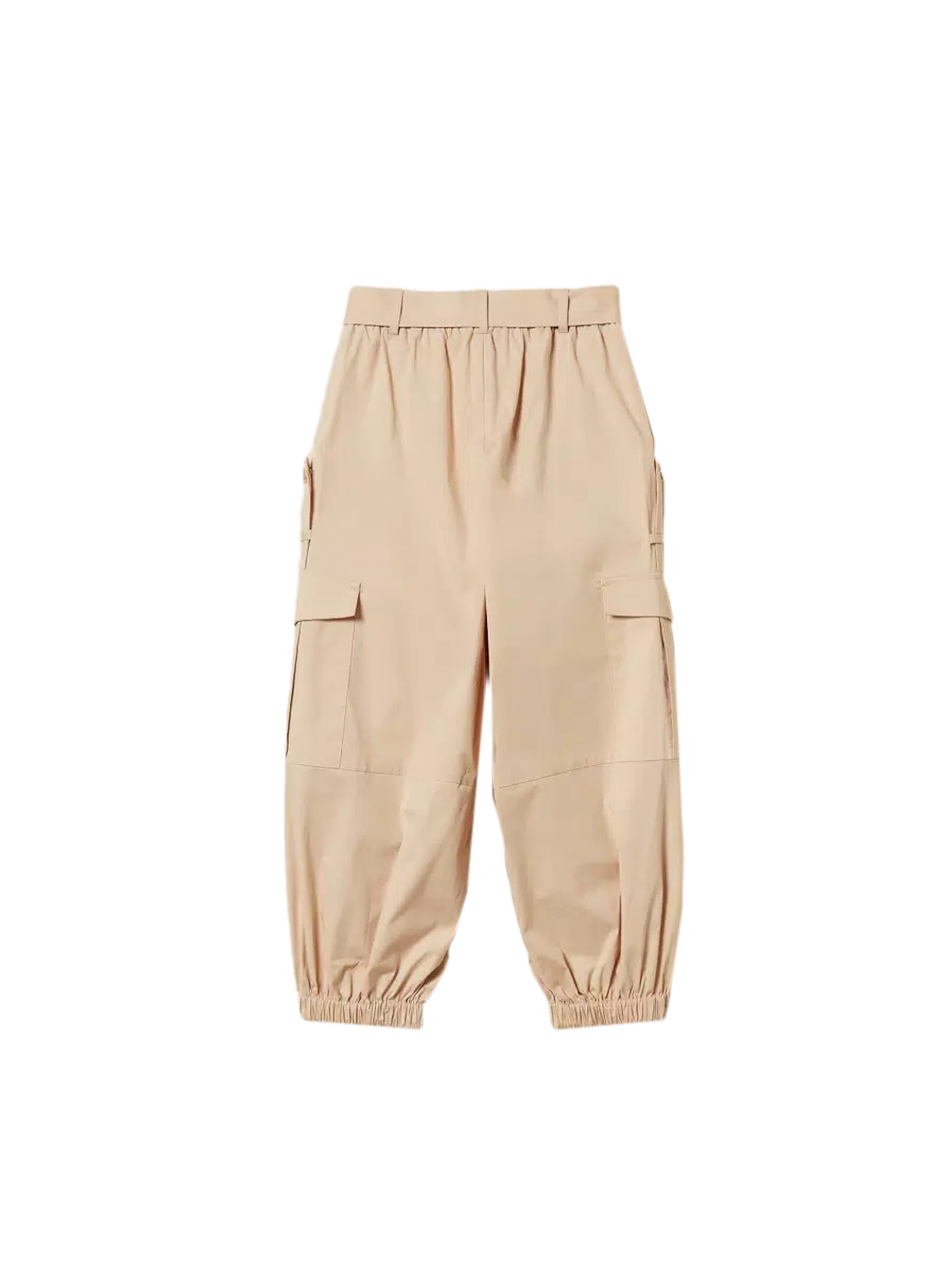 Pantaloni modello cargo, realizzati in popeline di cotone stretch per il massimo comfort, con maxi tasche ai fianchi, vita elasticizzata con passanti, cintura rimovibile in coordinato, tasche alla francese, alamari con bottoni a pressione logati ed elastico al fondo. Per look casual chic. TWINSET