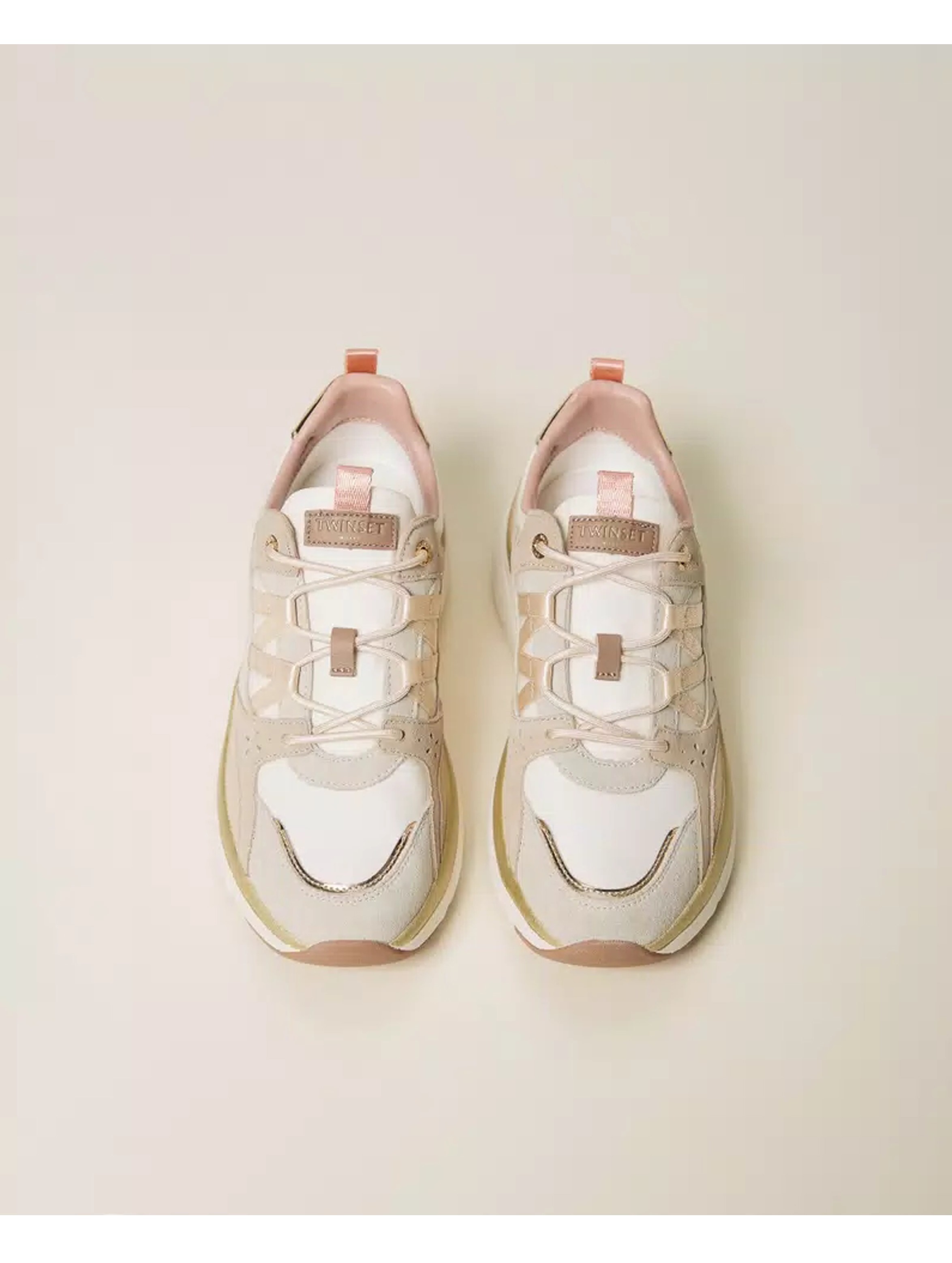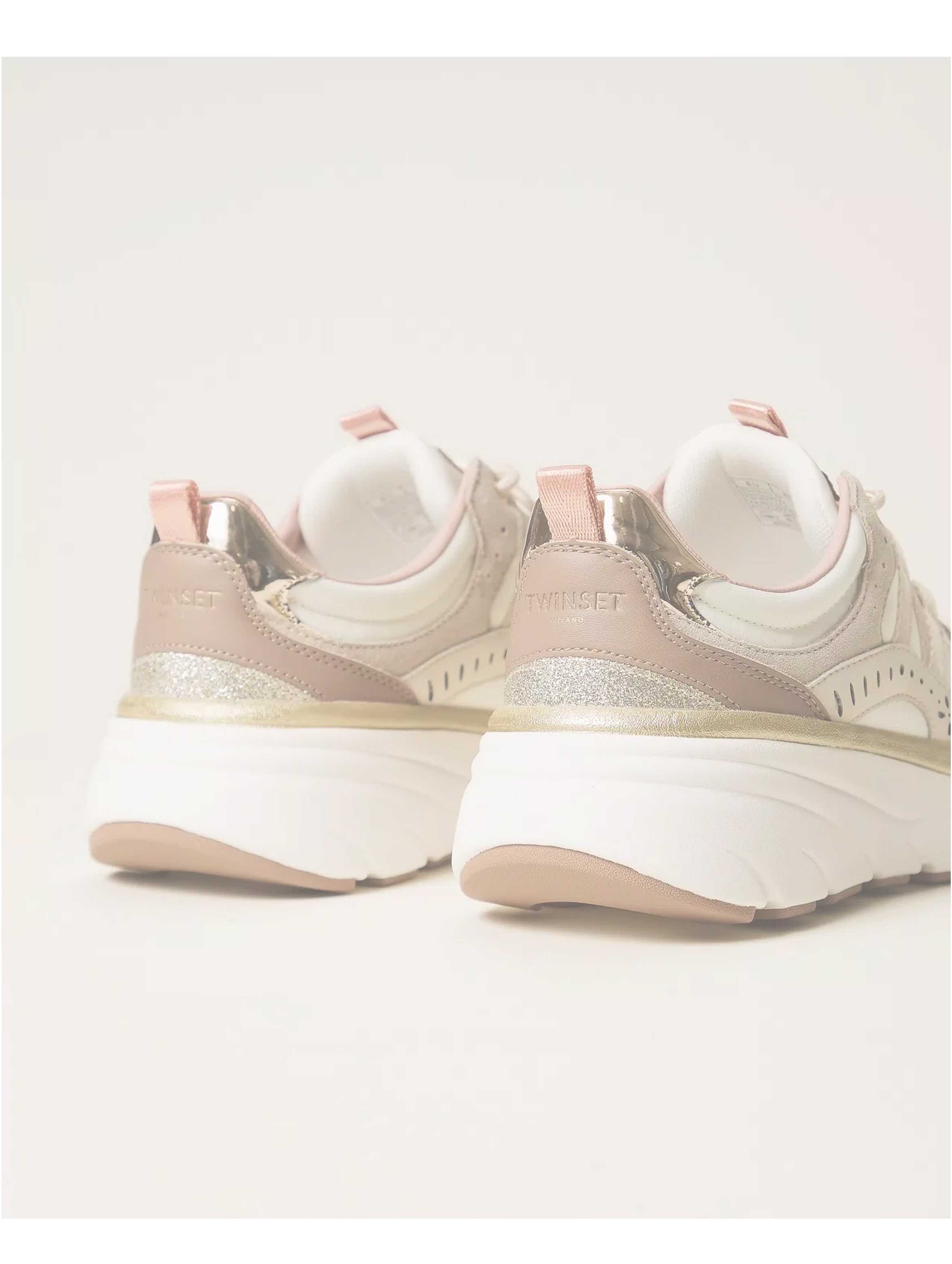 Sneakers running a caviglia bassa, in pelle con tessuto e rete, chiusura con lacci, inserti glitterati, inserti in laminato a specchio, dettagli cut, fondo in gomma e logo impresso sul retro. Per un look casual e trendy. TWINSET