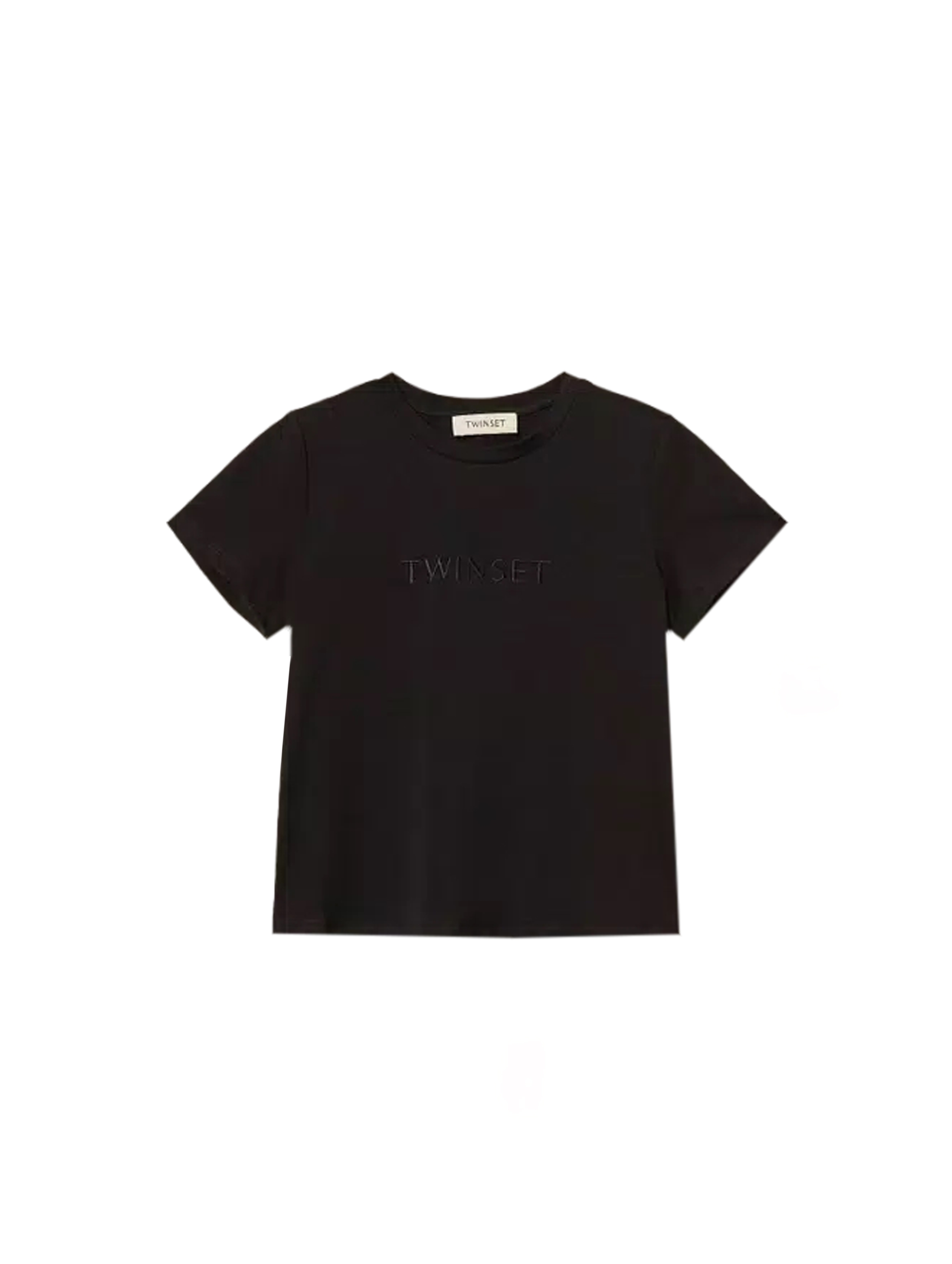 T-shirt a maniche corte in jersey di cotone stretch, con scollo rotondo, dalla vestibilità regular e con ricamo logo in tono davanti. Per un look basic e casual. TWINSET
