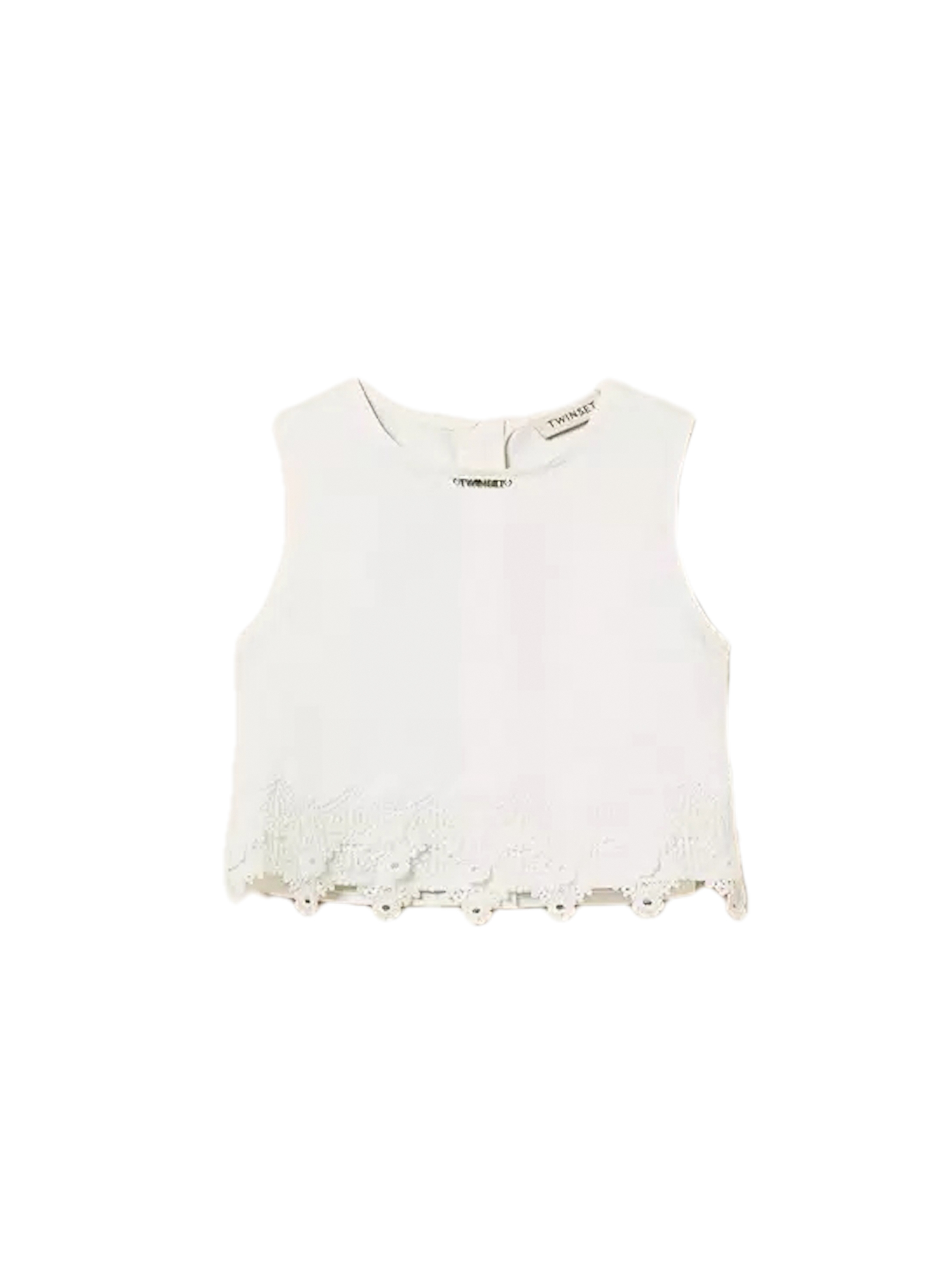 Top cropped realizzato in duchesse, con pizzo smerlato al fondo, con scollo rotondo, placchetta con logo in metallo sul davanti, apertura a goccia con bottone sul retro e linea dritta. Per look romantici e trendy. TWINSET