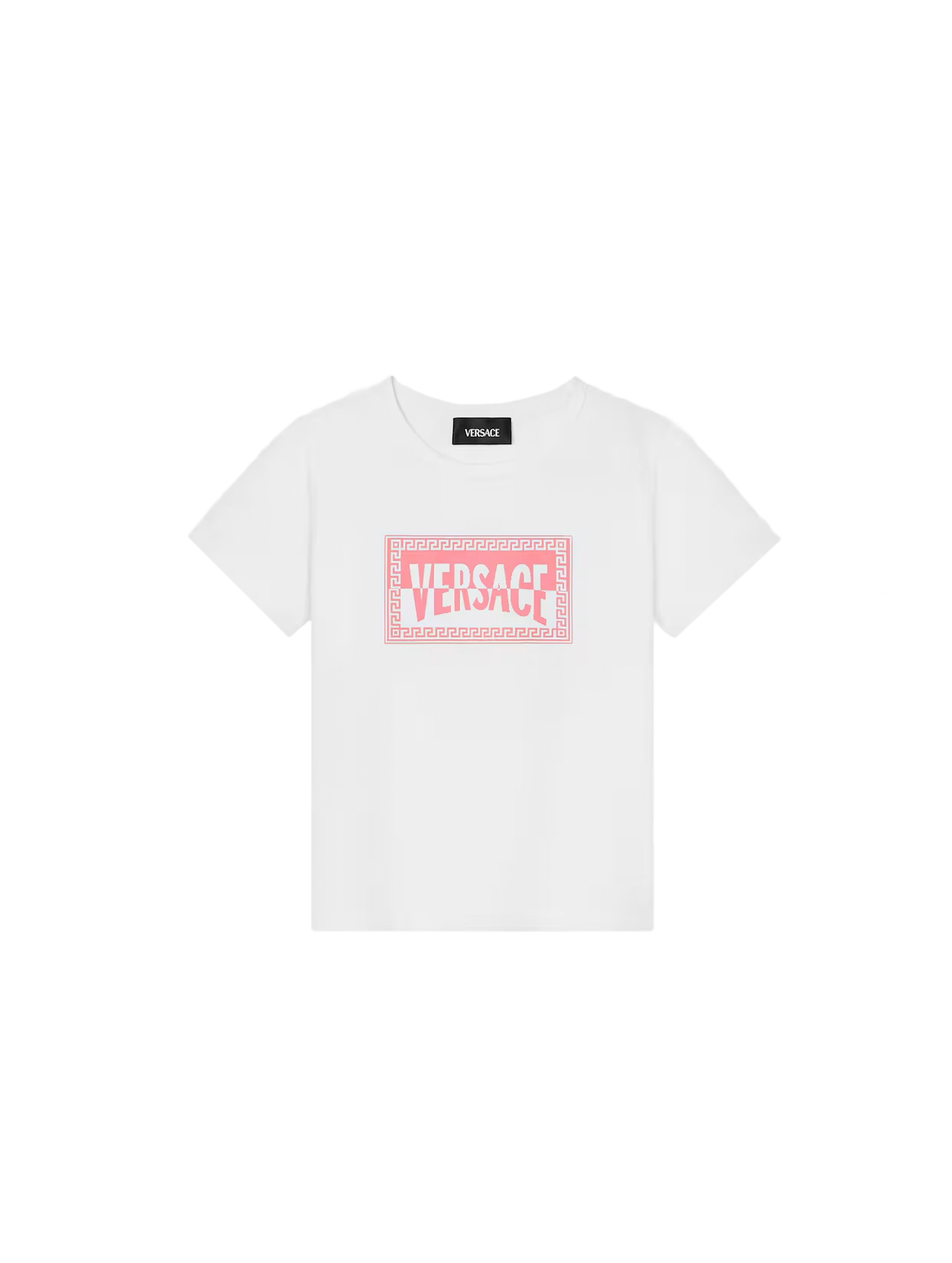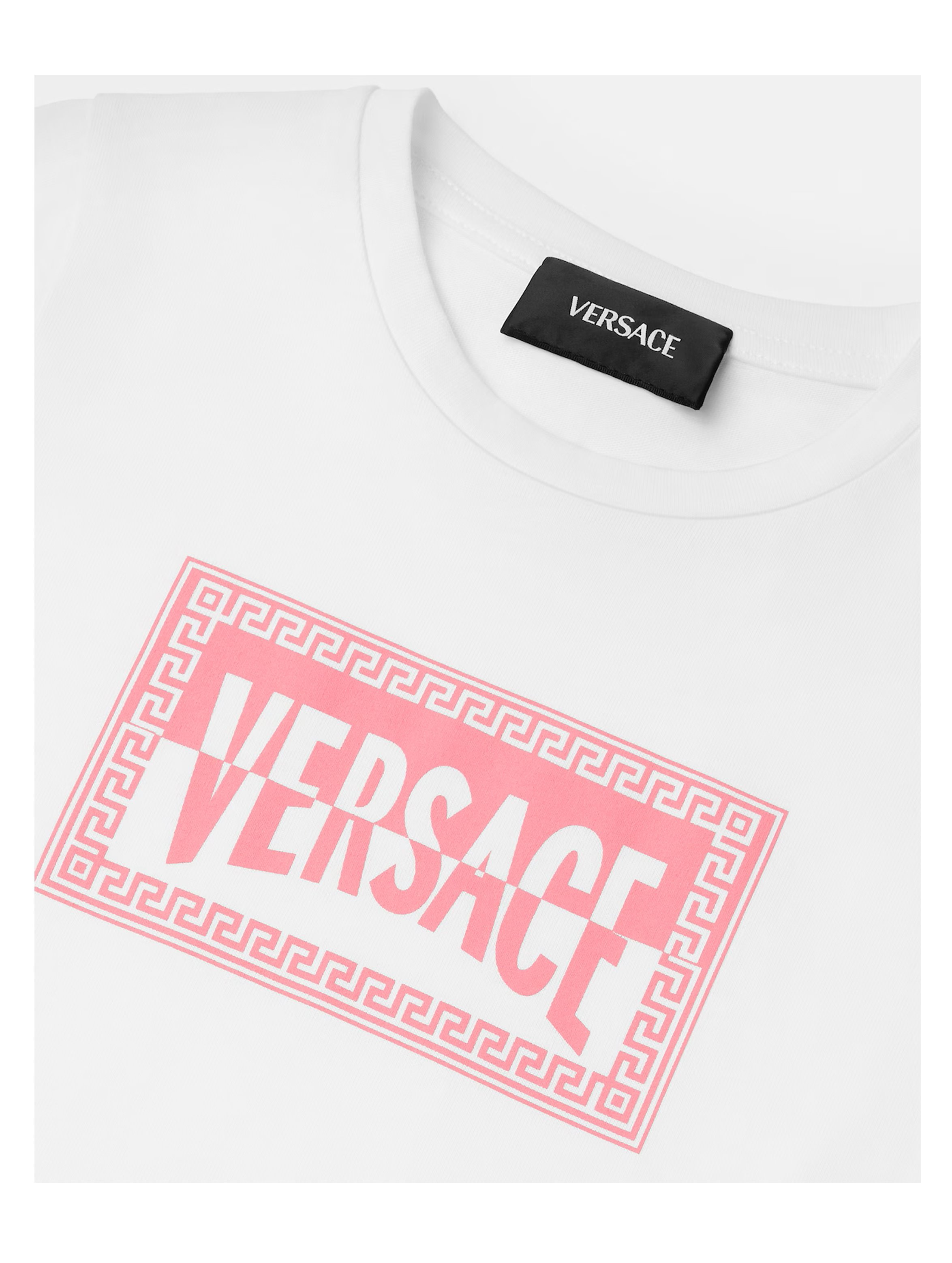 T-shirt a maniche corte in confortevole jersey di cotone, con scollo rotondo, a tinta unita e con maxi grafica Etichetta Club con logo bicolor sul davanti. Per un look casual e trendy. VERSACE