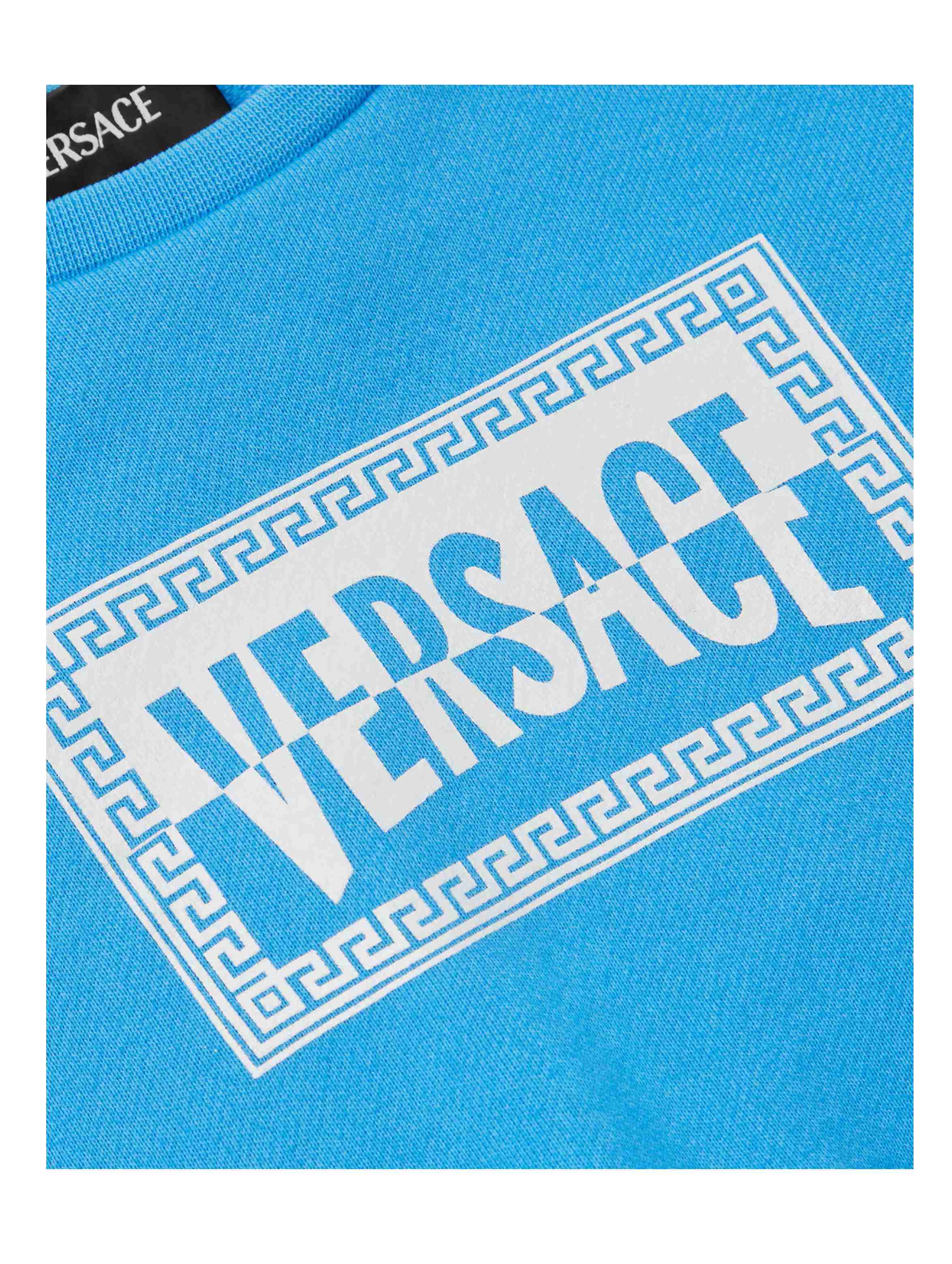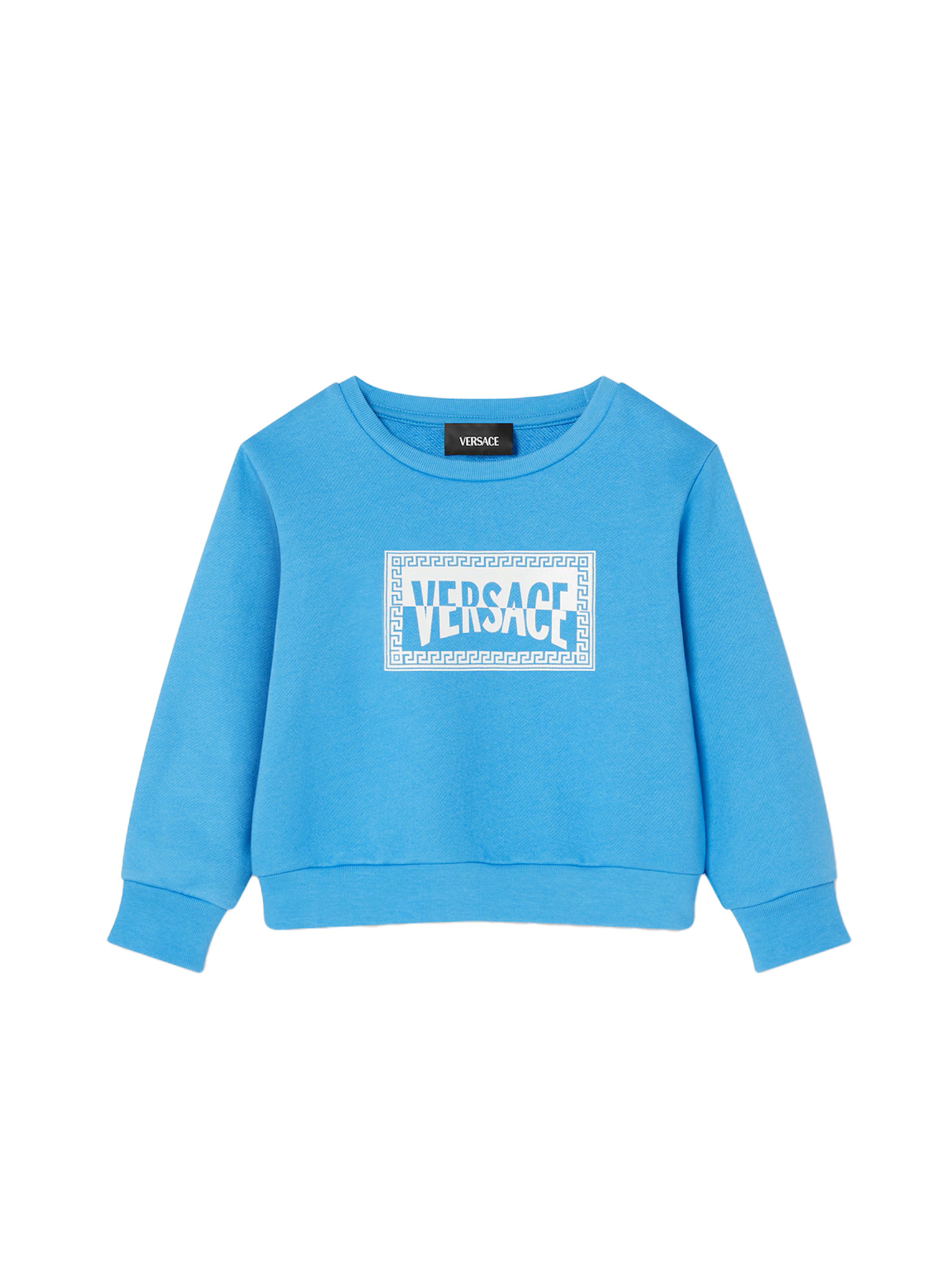 Felpa in jersey di cotone a maniche lunghe, a tinta unita, con scollo rotondo, bordi e polsini a costine, apertura con bottoncini sulla spalla e maxi grafica Etichetta Club a contrasto bicolor sul davanti. Per un look casual e trendy. VERSACE