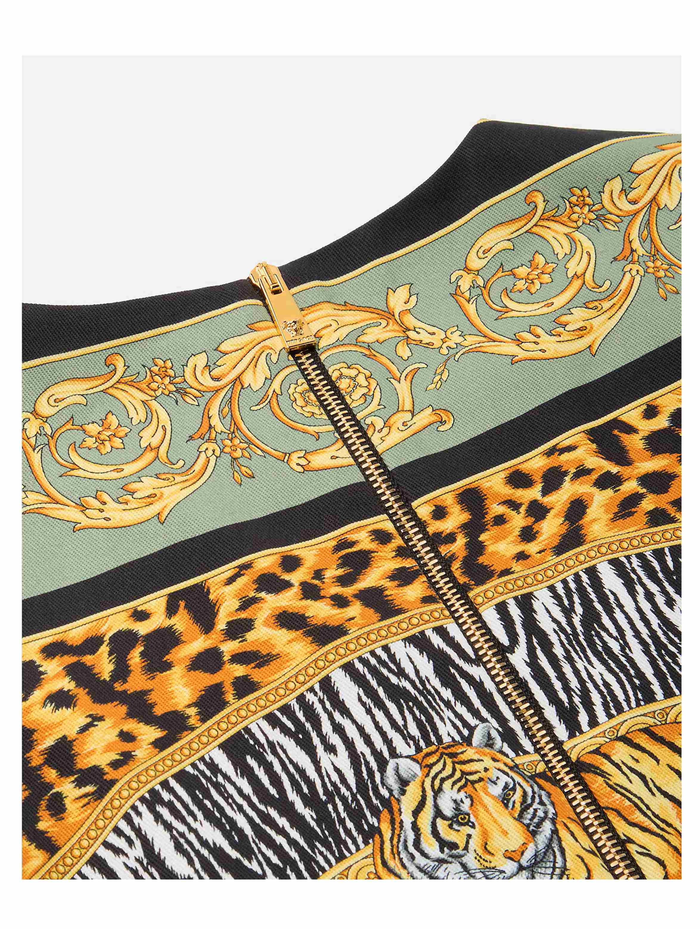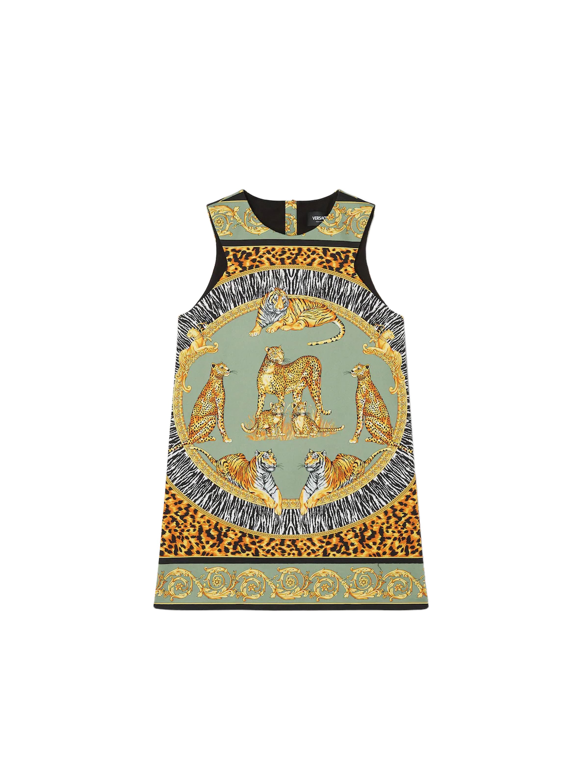 Abito svasato senza maniche, realizzato in gabardine di cotone, con scollo rotondo, zip sul retro, con una particolare stampa Wild Cats in stile mini-me che raffigura il regno animale arricchita da pattern zebrati e leopardati. Perfetto per un look sofisticato e stiloso. VERSACE