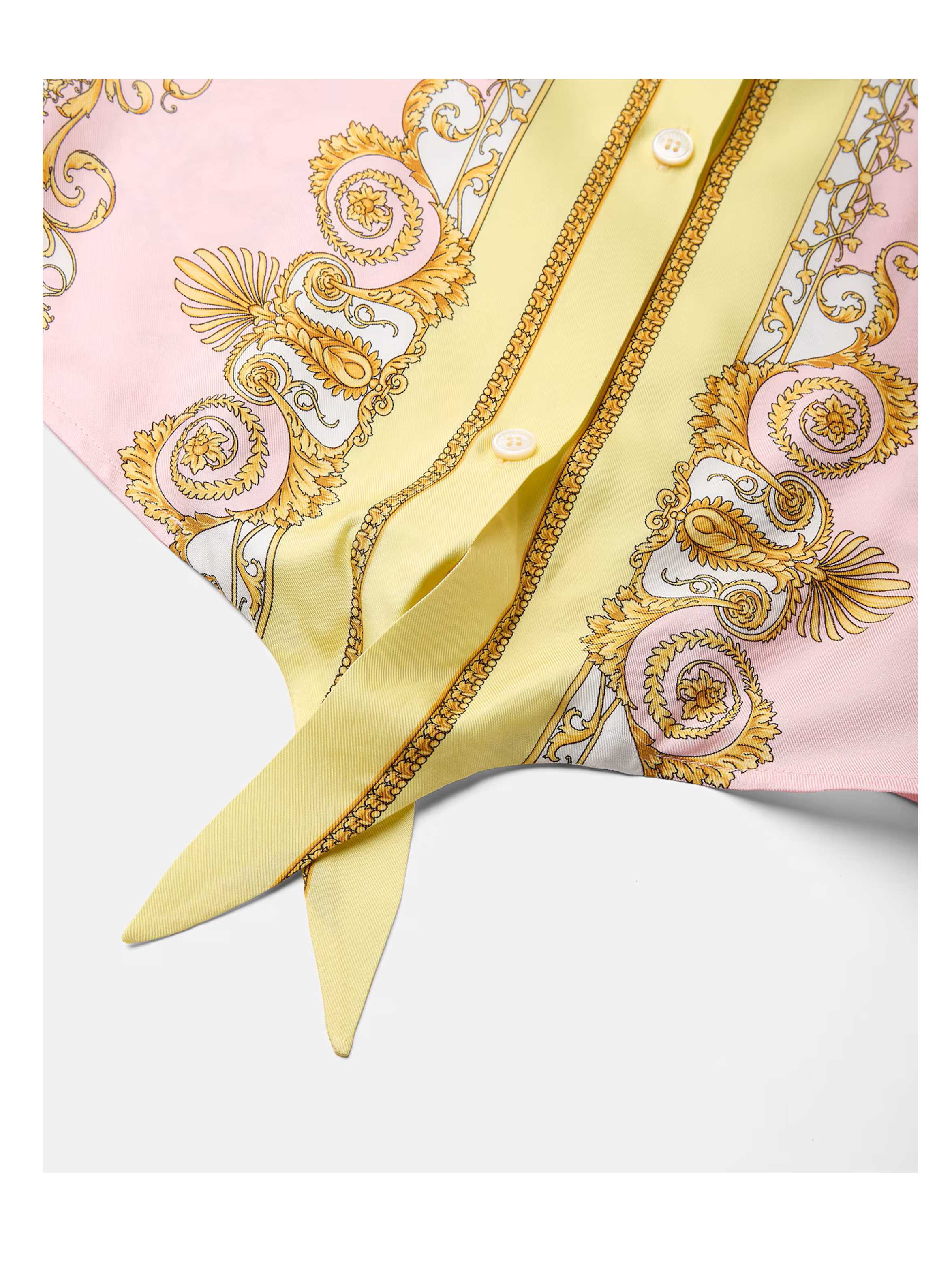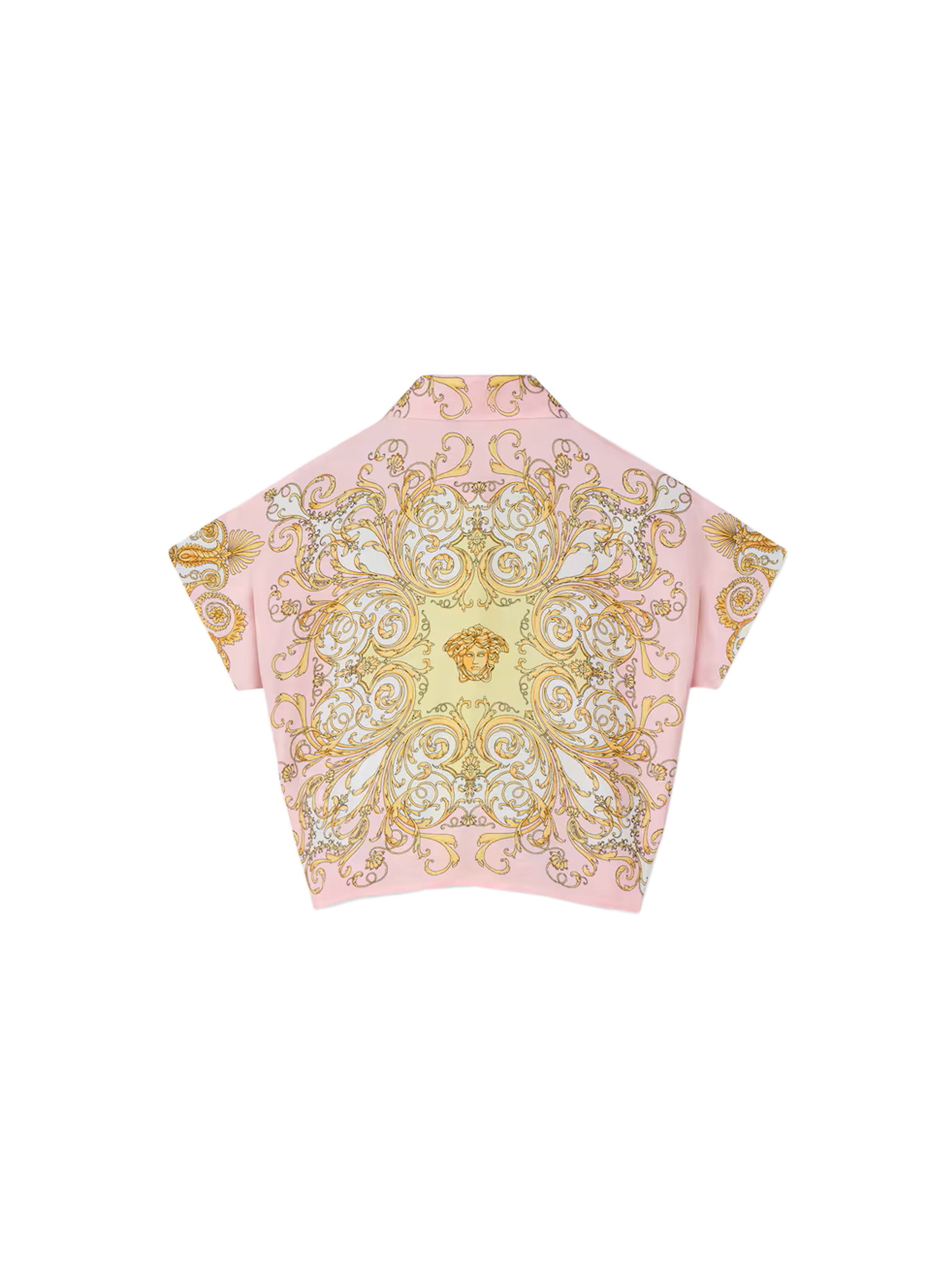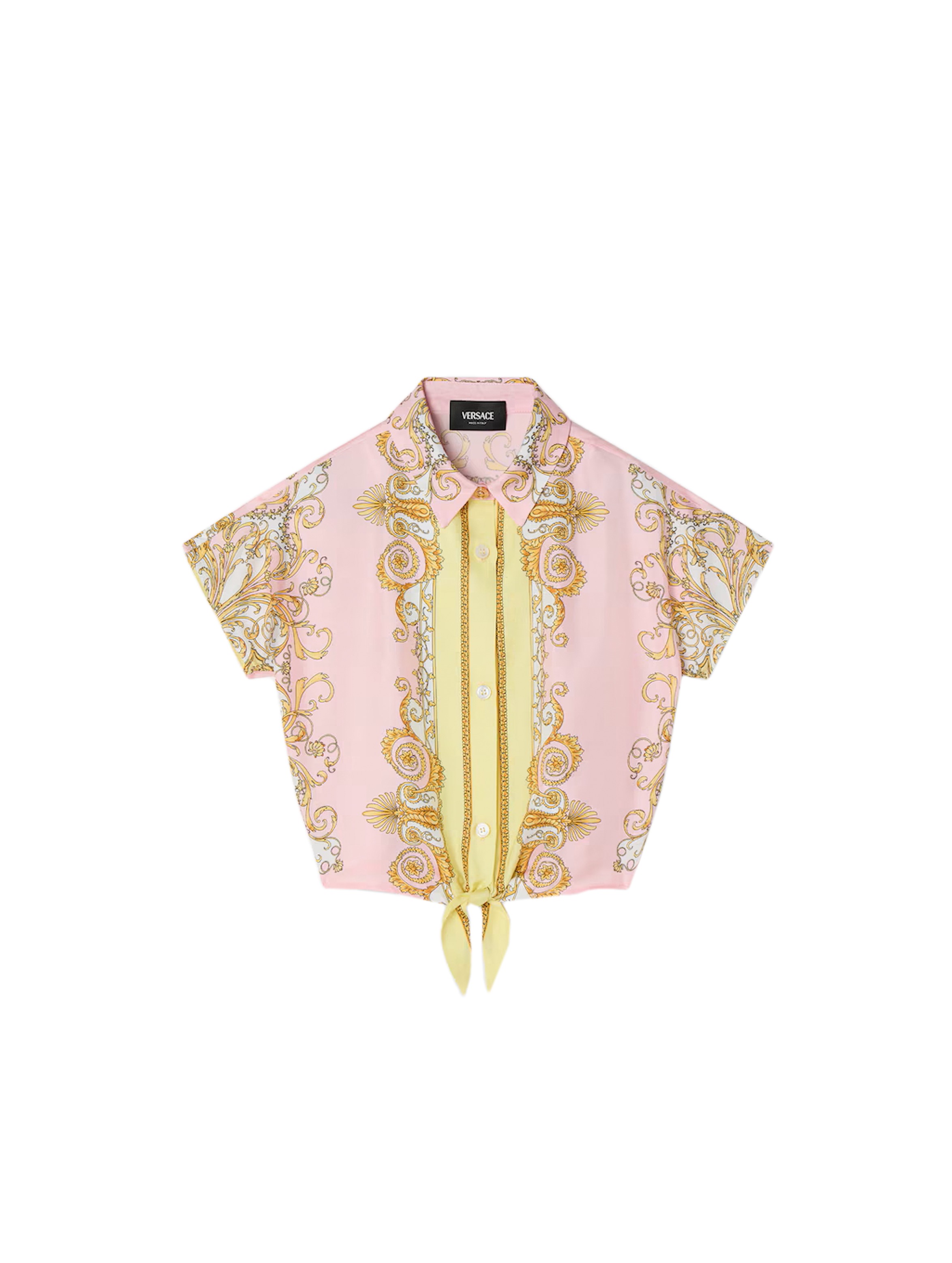 Camicia corta realizzata in morbido twill di seta, con maniche corte, colletto a punta, chiusura frontale con bottoni, dettaglio con orlo annodato sul davanti, caratterizzata da una particolare stampa Spring Barocco all-over in stile mini-me declinata in tonalità pastello e impreziosito da un iconico bottone Medusa. Per un look inconfondibile e fashion. VERSACE