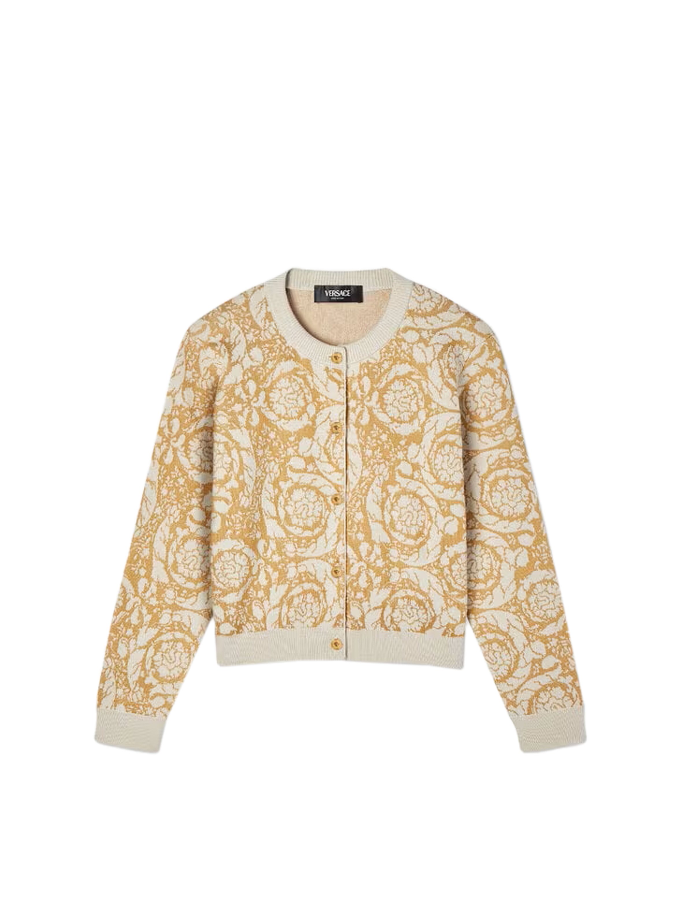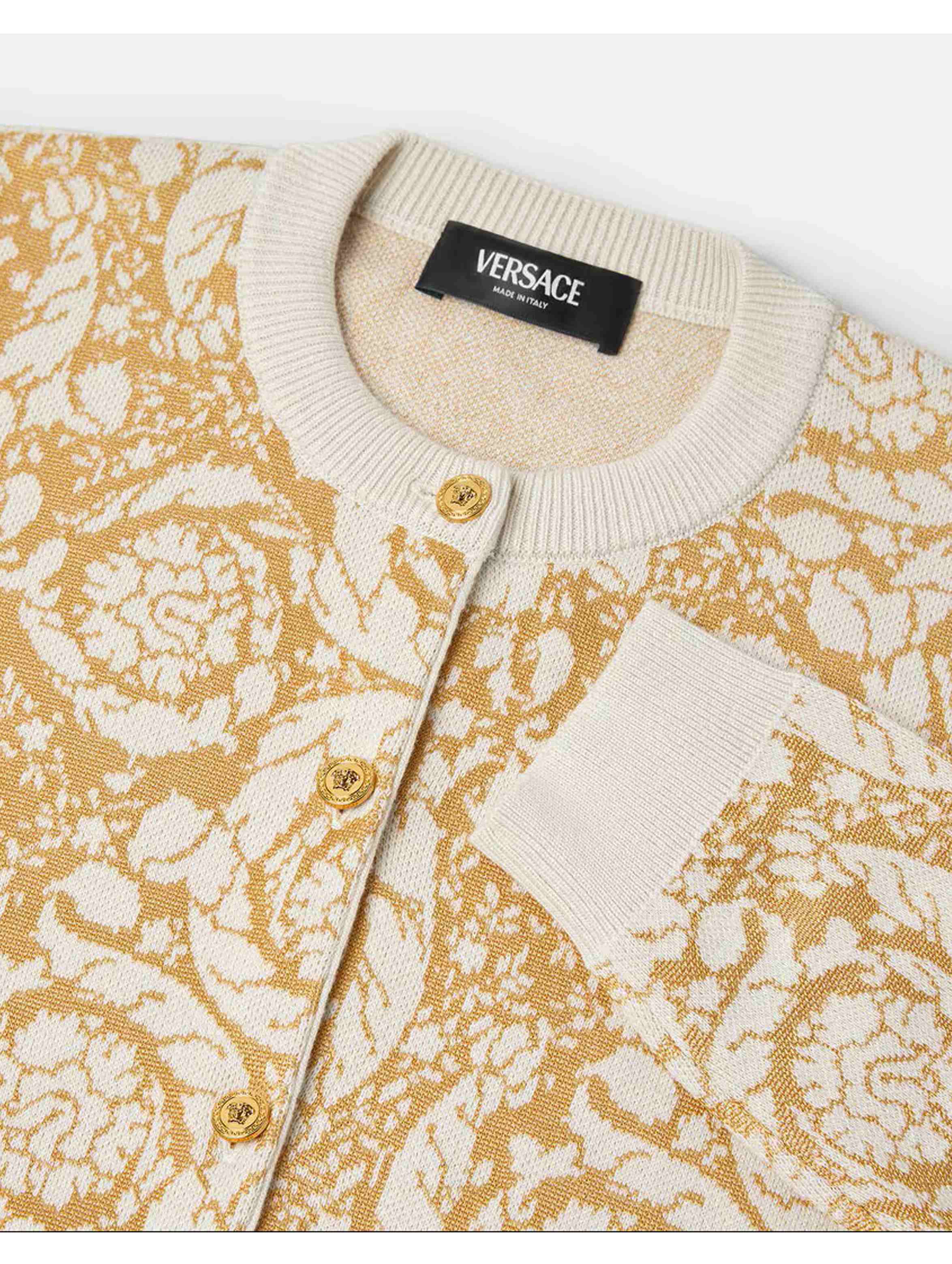 Cardigan a maniche lunghe in misto cotone, con scollo rotondo, bordi a costine, lavorato a maglia con pattern jacquard barocco all over e chiusura con bottoni Medusa. Per un look raffinato e cool. VERSACE