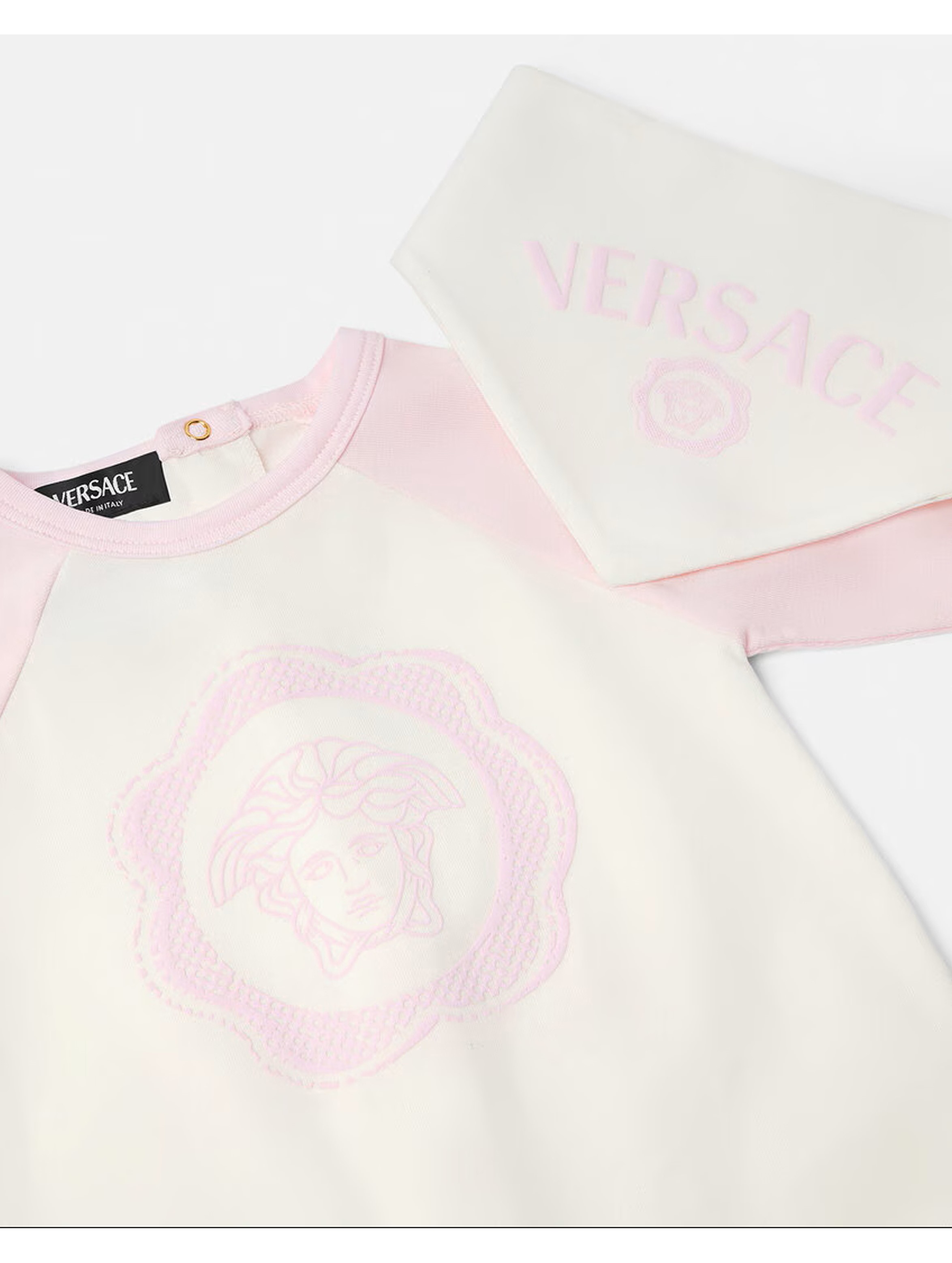 Completo tutina a maniche lunghe, bicolor, con scollo rotondo, apertura sul retro con bottoni logati, maxi logo a contrasto sul retro, iconica testa di Medusa sul davanti e bavetta abbinata con bottoncino logato e maxi logo lettering e iconica testa di Medusa sul davanti. Per un look fashion e trendy. VERSACE