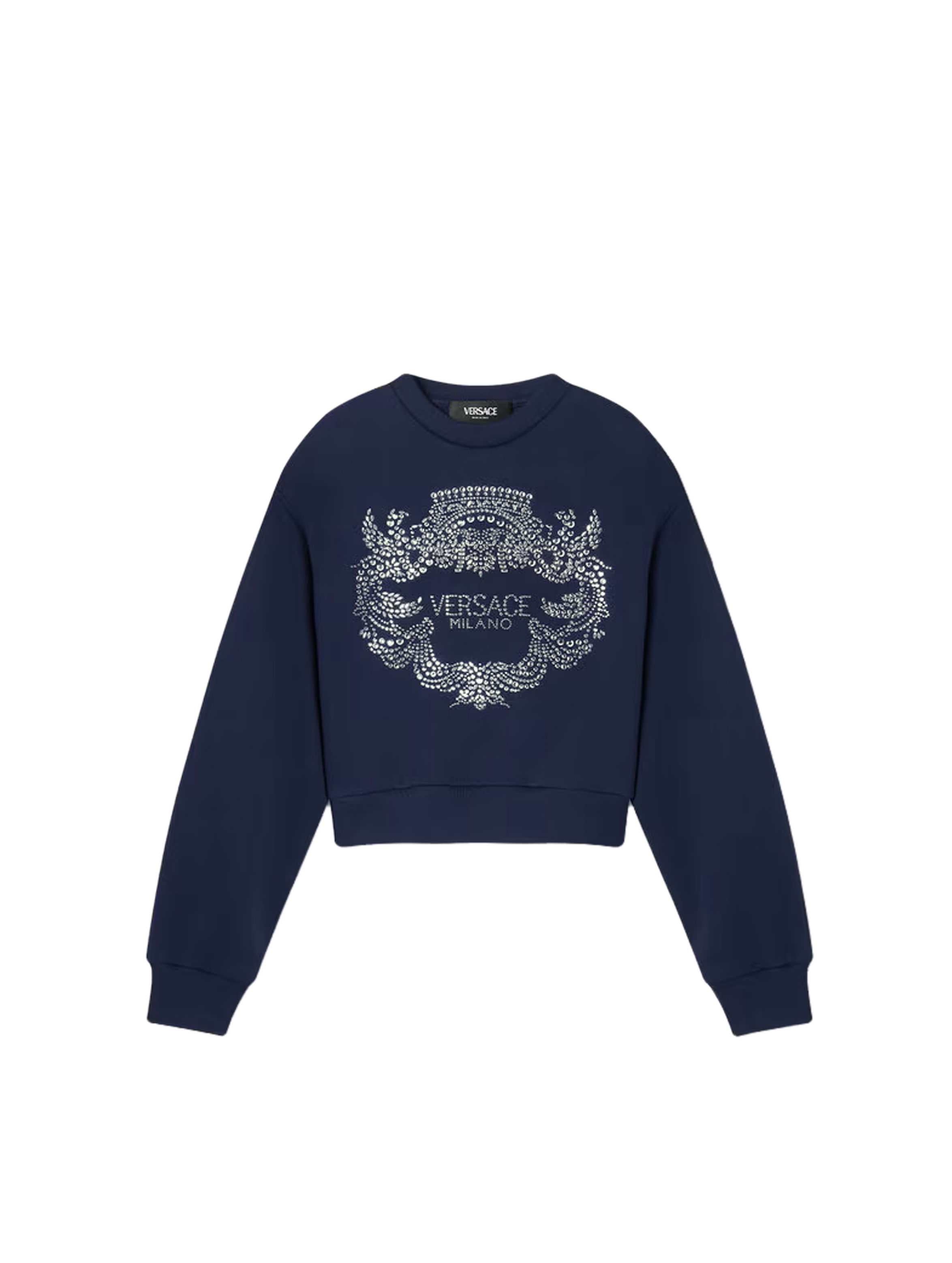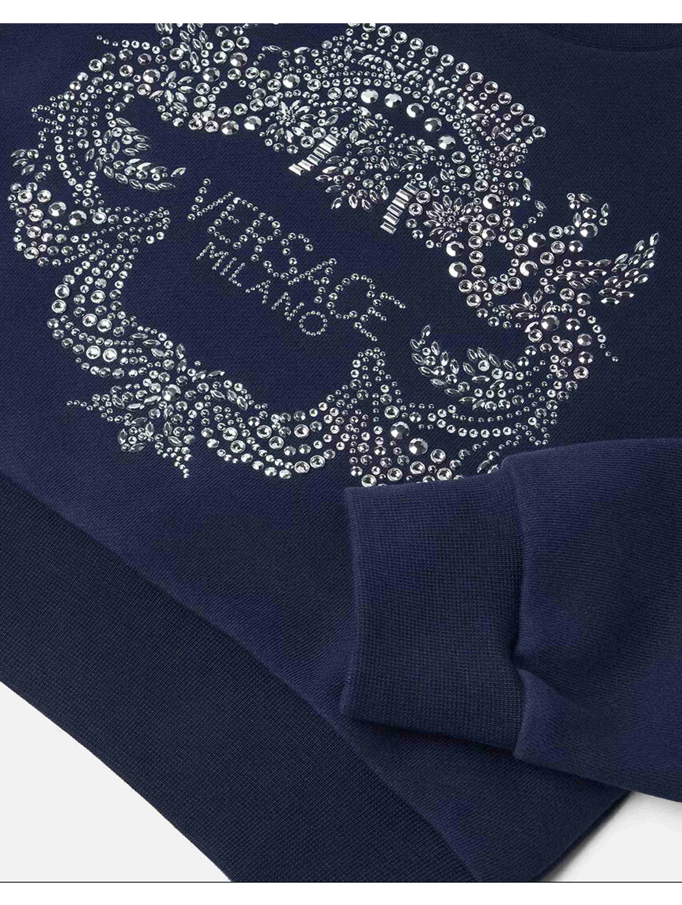 Felpa a maniche lunghe, a tinta unita, con bordi e polsini a costine e logo lettering con maxi grafica barocca ricoperta di strass sul davanti. Per un look fashion e trendy. VERSACE