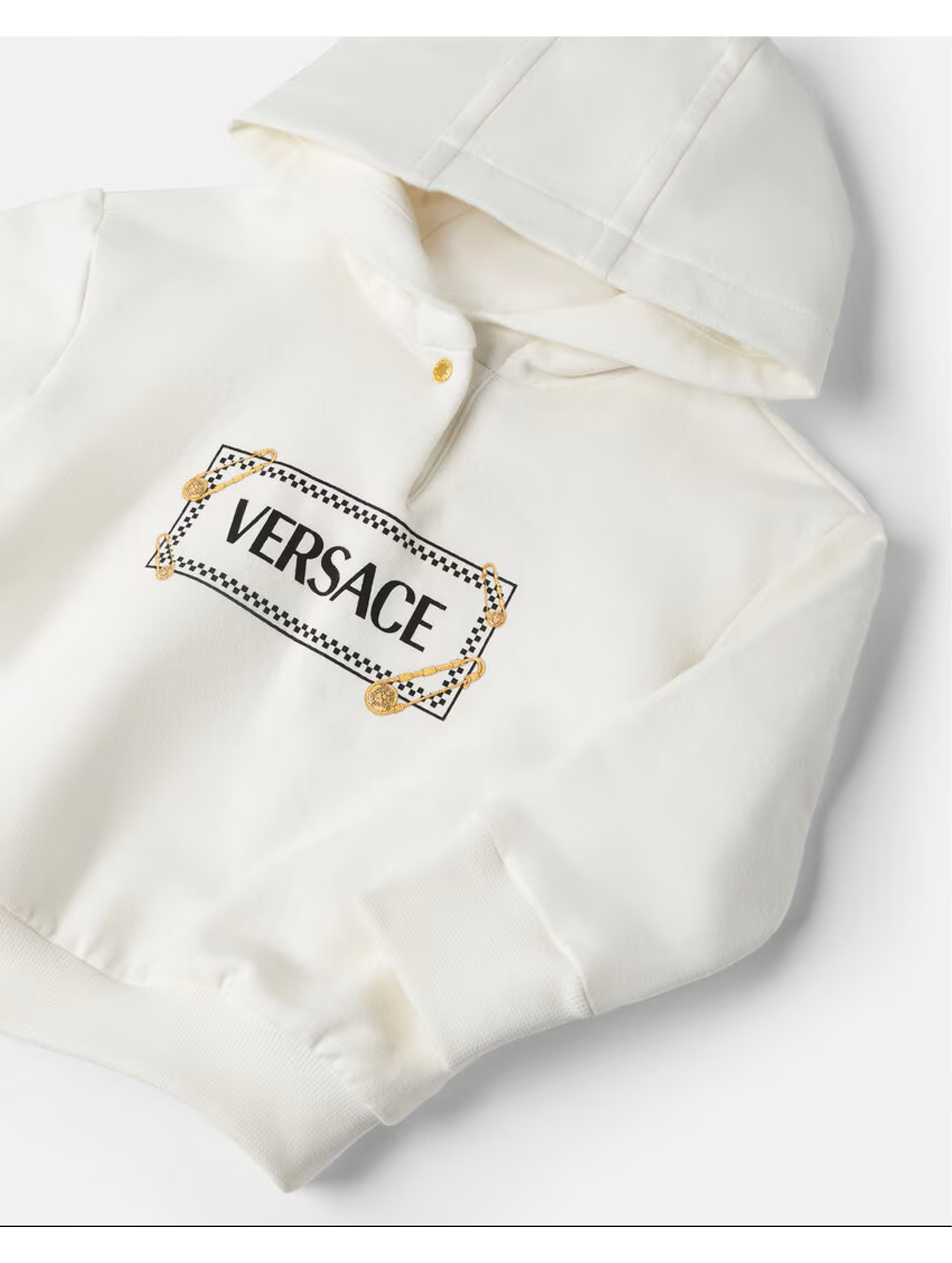 Felpa con cappuccio a maniche lunghe, a tinta unita, con bordo e polsini a costine, bottone logato, e maxi stampa del logo lettering a contrasto con grafica ricamata sul davanti. Per un look sofisticato e fashion. VERSACE