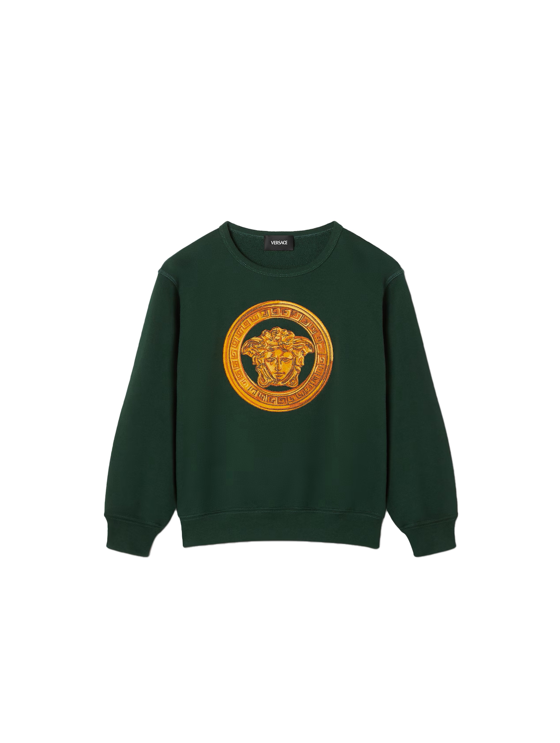 Felpa in jersey di cotone a maniche lunghe, a tinta unita, con scollo rotondo, bordi e polsini a costine e maxi logo Medusa ricamato in lurex sul davanti. Per un look casual e trendy. VERSACE